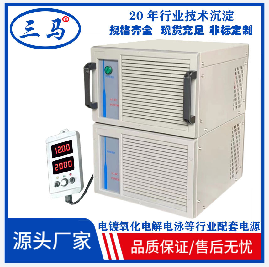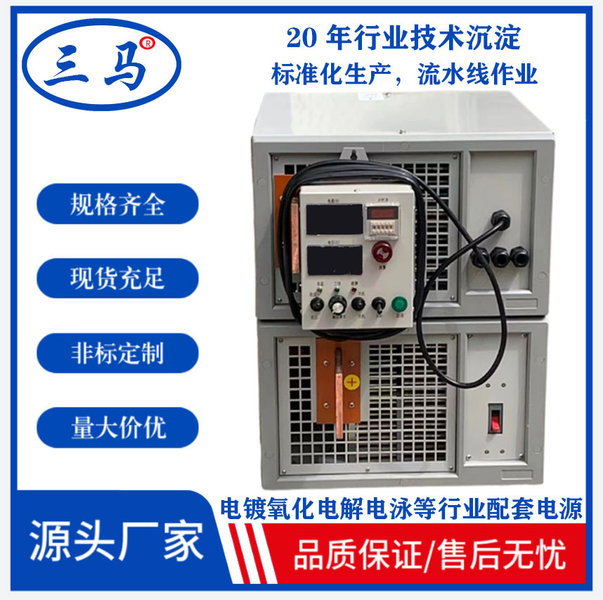 三马高频节能开关电源、选用进口优质器件,控制芯片,采用进口高品质IC、功率逆变管采用进口快速1GBT、电路设计优化合理,广泛用于五金、塑胶、电镀,PCB电镀、贵金属电镀、IP真空电镀、大功率电解、抛光、氧化、硬质氧化、硬铬、电泳涂漆、污水处理、充电机、电刷镀、晶体炉加热、宝石炉加热、高频加热、稀土冶炼、次氯酸钠发生器、标牌蚀刻、霍尔槽实验、实验测试、镀锌、镀铝、镀镍、镀镉、镀铜、镀铅、镀银、镀金、合金电镀、铝氧化、铝合金氧化、阳极氧化、硬质氧化、铜氧化、电解铜、电解锰、电解锑、电解银、电解有色金属、真空镀膜等领域,以及充电、直流电机调速、电力等,需要直流电源场合。