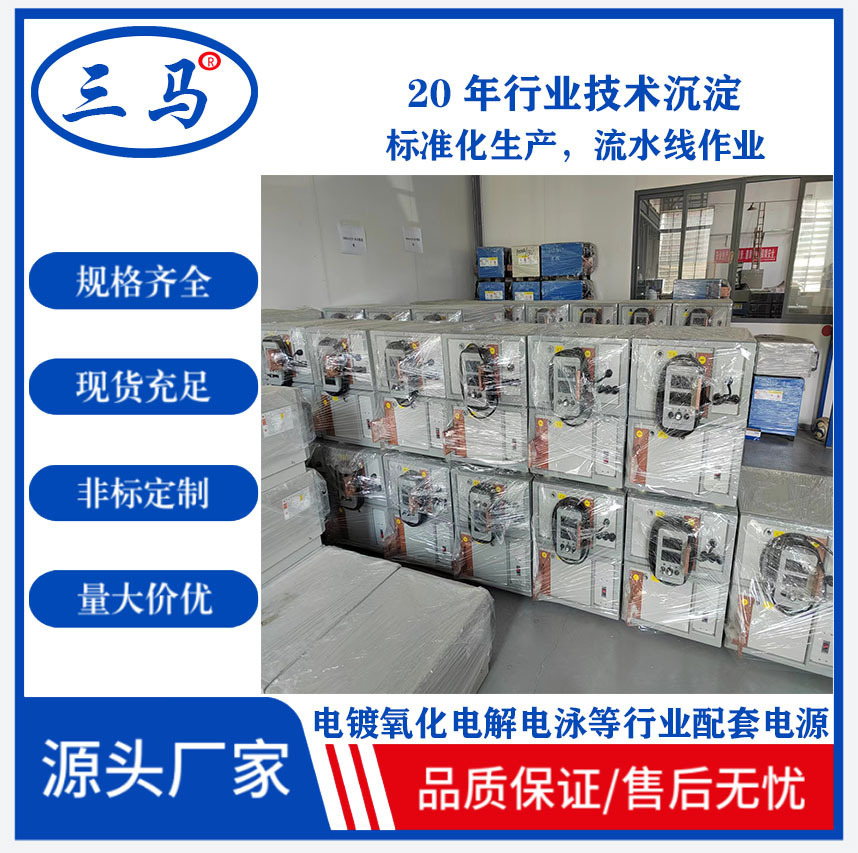 三马生产整流机、开关电源、高频电源、氧化电源、电镀电源、电镀摇摆头、电镀旋转头、自动线旋转头、电镀整流机、整流器、电镀高频电源、电镀高频开关电源、电解电源、电解整流机、氧化整流机、电泳电源、电泳整流机、电刷镀电源、电镀设备等,具有15年专业技术能力,实力雄厚。