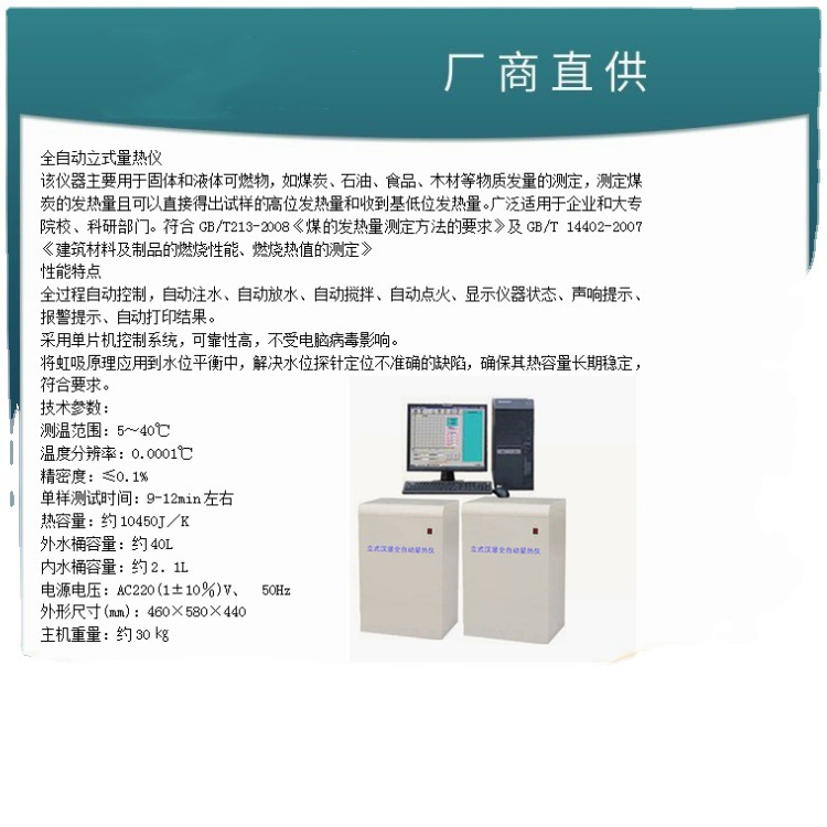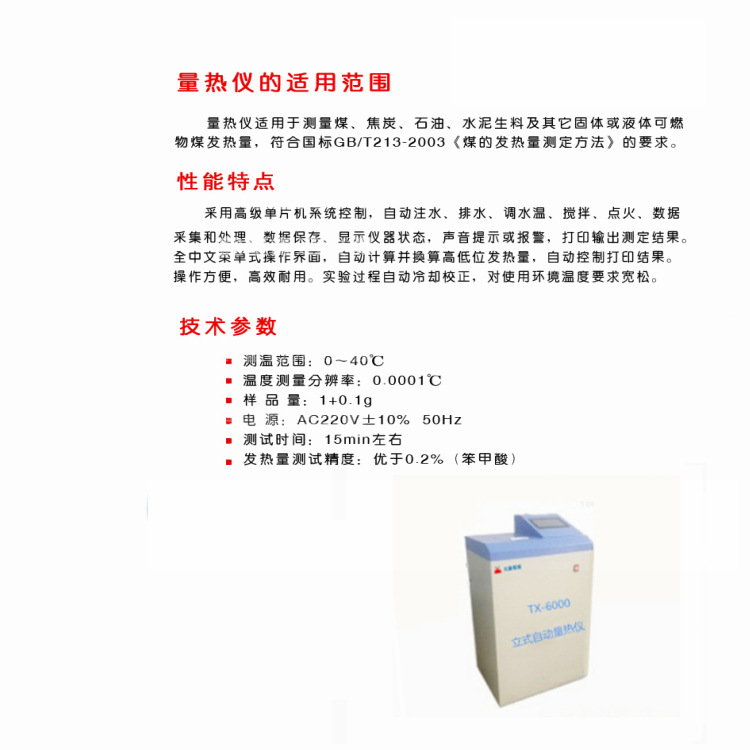该仪器主要用于固体和液体可燃物,如煤炭、石油、食品、木材等物质发量的测定,测定煤炭的发热量且可以直接得出试样的高位发热量和收到基低位发热量。广泛适用于企业和大专院校、科研部门。符合GB/T213-2008《煤的发热量测定方法的要求》及GB/T 14402-2007《建筑材料及制品的燃烧性能、燃烧热值的测定》。