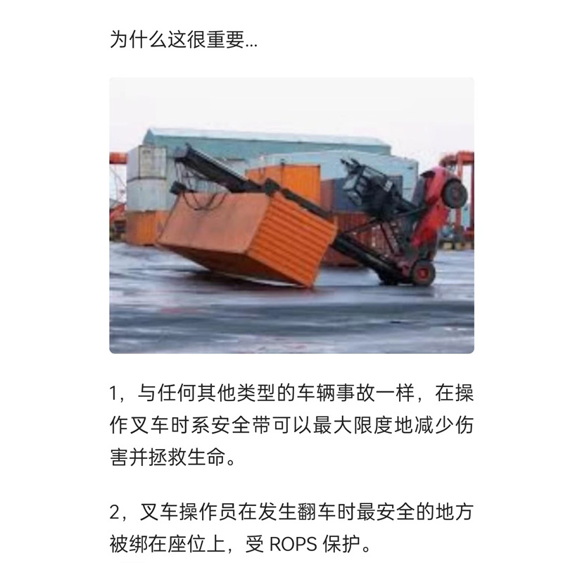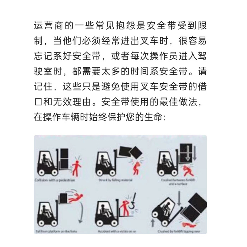在企业生产和储运的过程中,叉车的作用日渐突出。各行各业对叉车的需求也逐渐上升。在使用叉车时 叉车操作员应始终系安全带。为什么?因为这两年对叉车事故的分析表明,受伤或死亡的操作员往往没有系安全带。虽然叉车安全带不能防止事故,但可以防止重伤和拯救生命。
