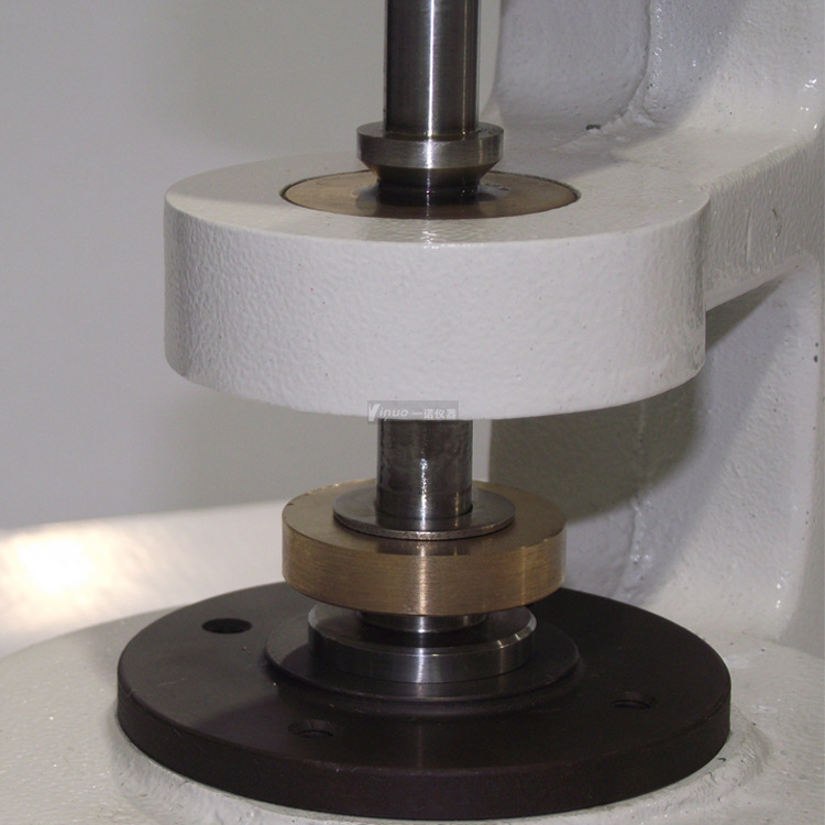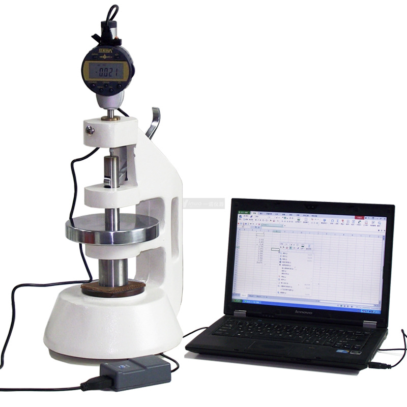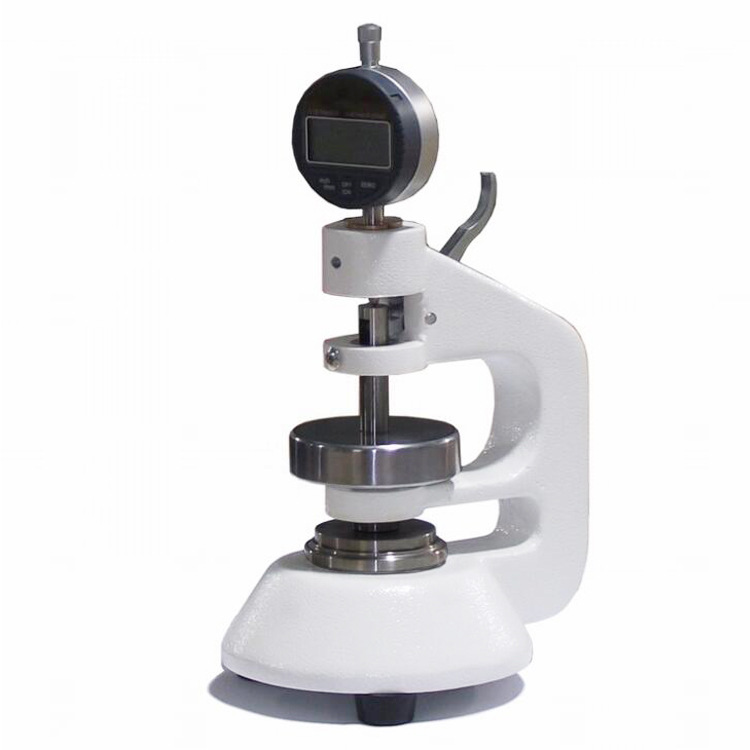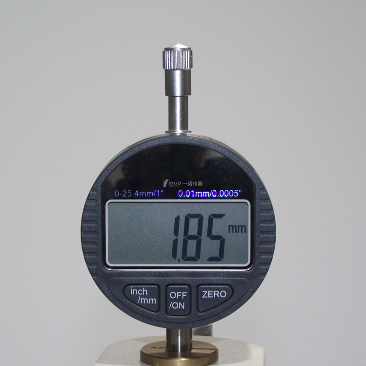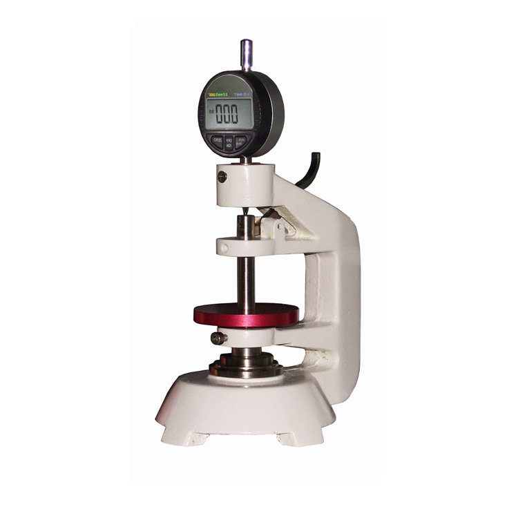 测试原理:试样放置在参考板上,平行于该板的压脚,将规定压力施加于试样规定面积上,规定时间后测定并记录两板间的垂直距离,即为试样厚度测定值。