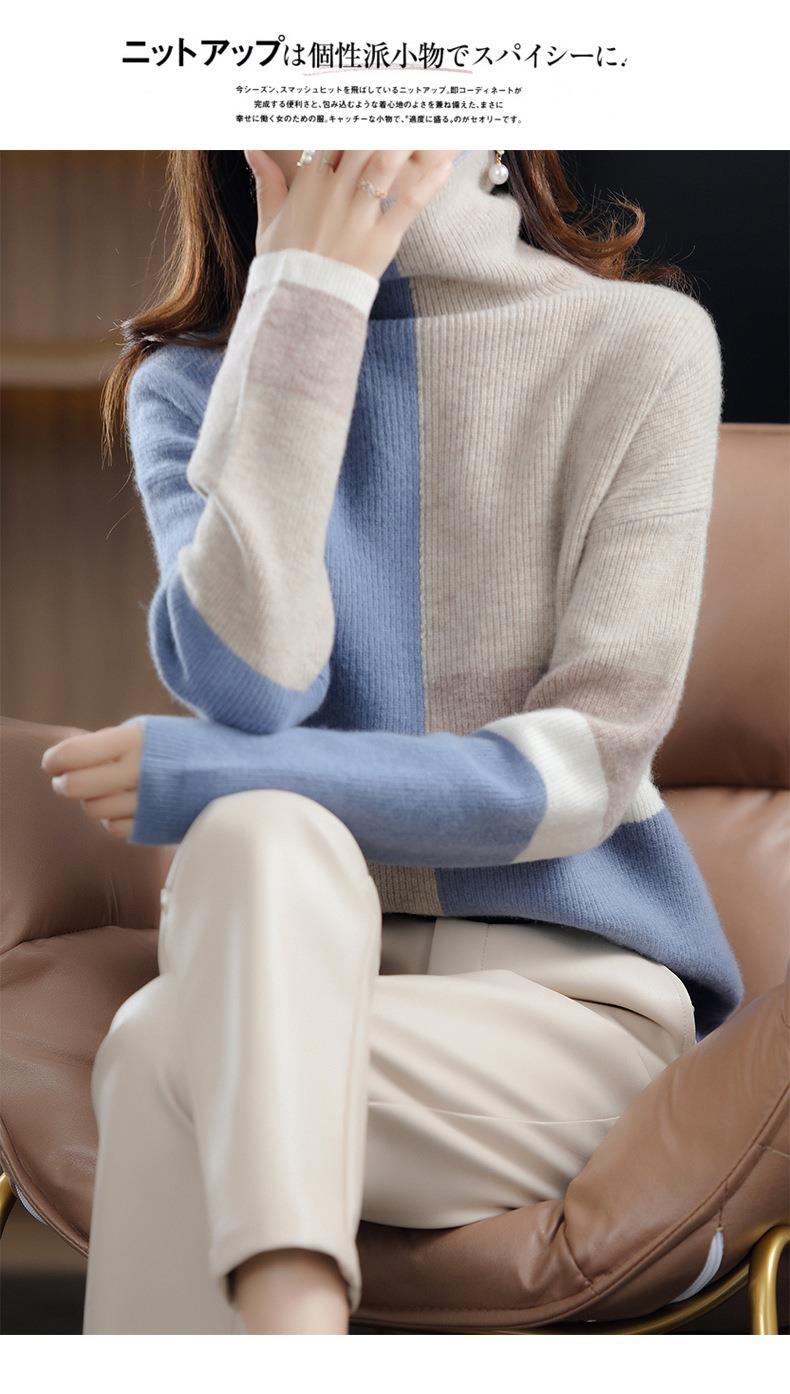 Новый женский теплый вязаный свитер-базовый слой с высоким воротником и цветными блоками, свободного кроя, коллекция Осень/Зима 2025