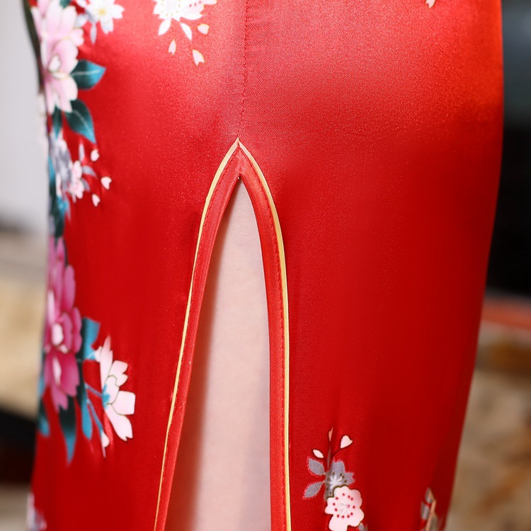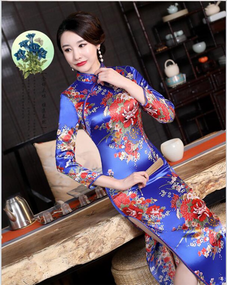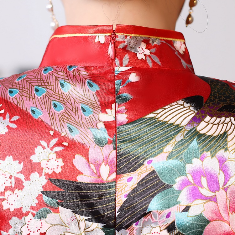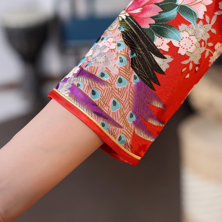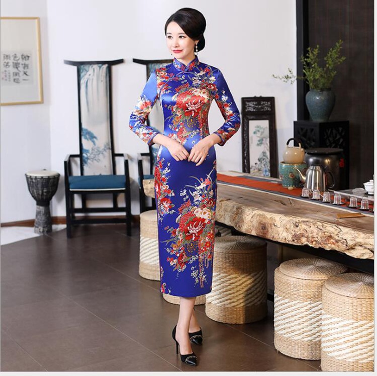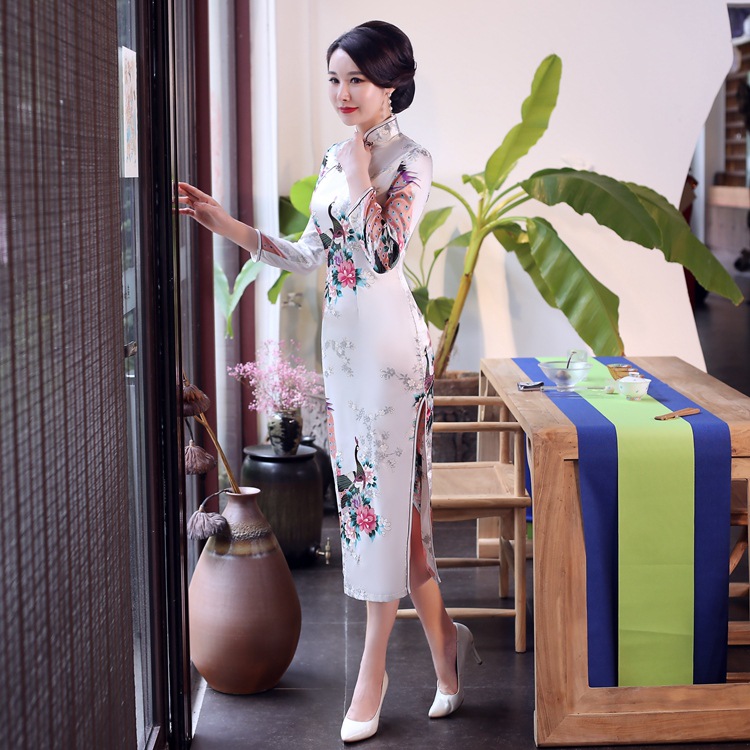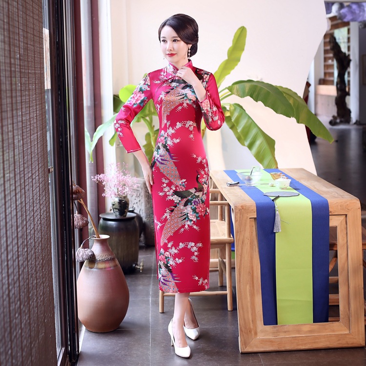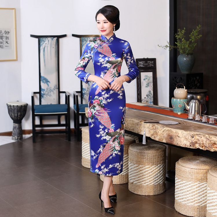 Женское длинное платье-Ципао с длинными рукавами в китайском стиле, улучшенное длинное платье с павлином и цветочным принтом, одежда для командной фотосъемки в китайском стиле
