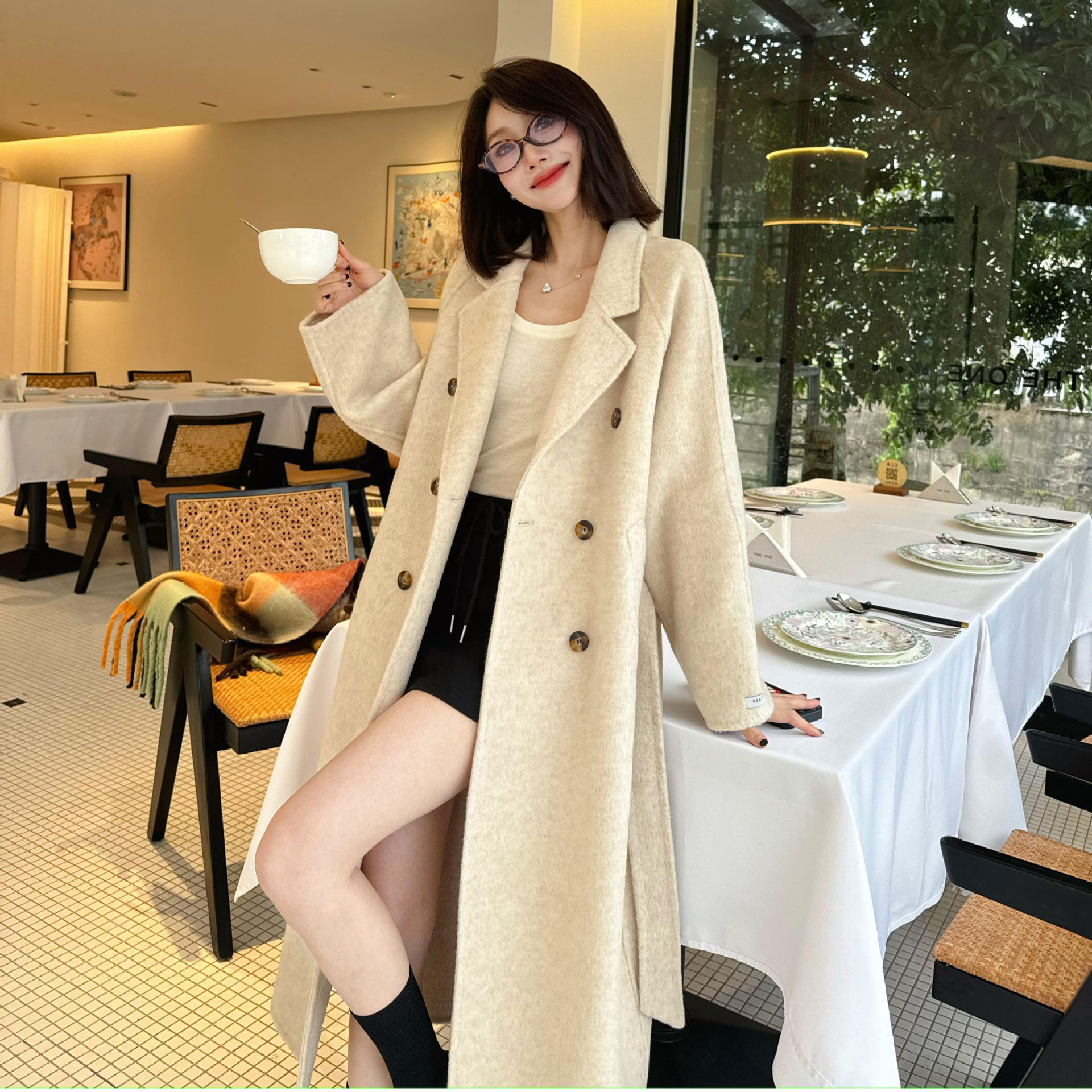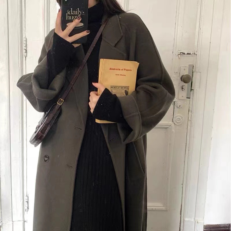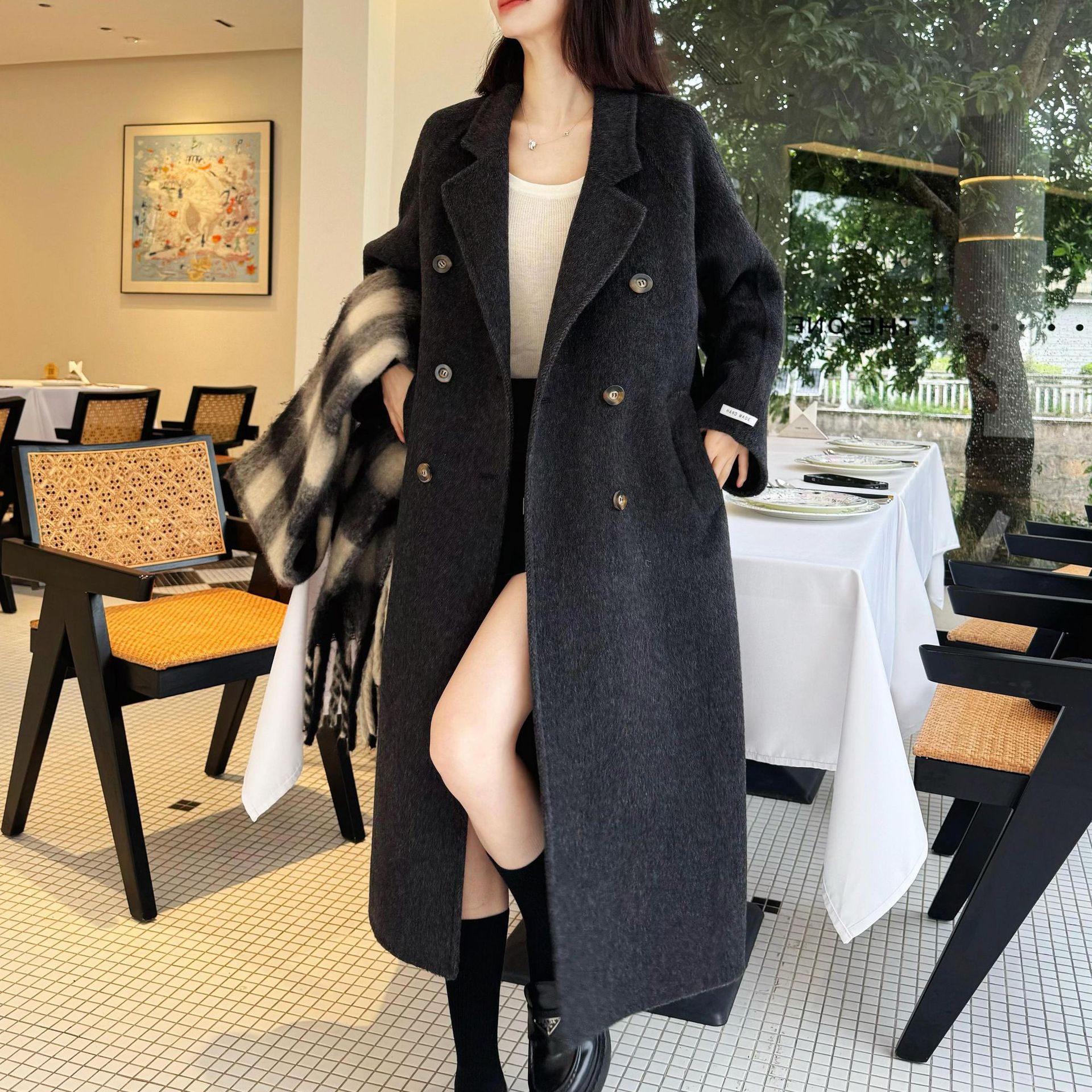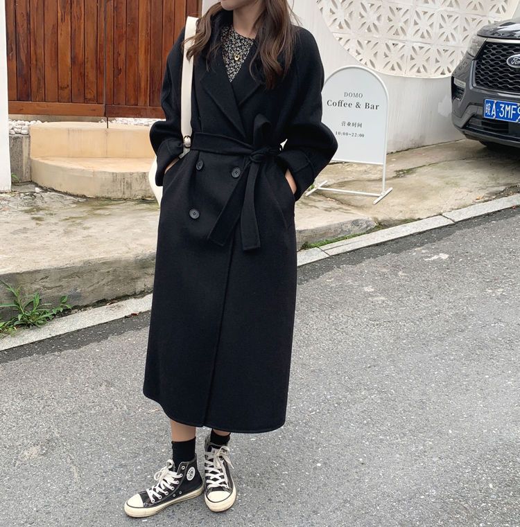 Двустороннее шерстяное пальто, женское двубортное приталенное черное шерстяное пальто в Корейском стиле с поясом для больших размеров, осень и зима