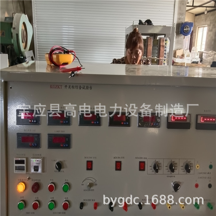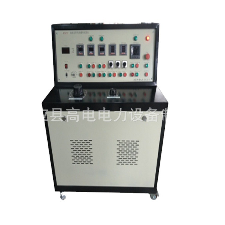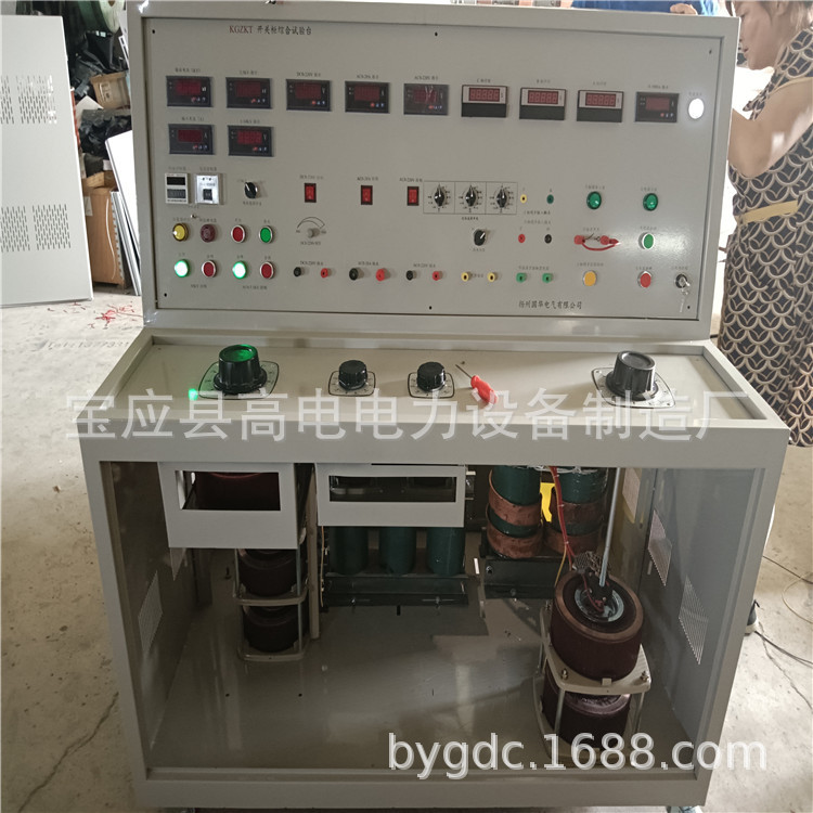 一:概述 该设备GDKY-83B矿用开关测试台主要是测量煤矿机修厂维修开关的必备助手,它能提供各种开关的工作电源和大电流,及开关的动作时间,三相同步测量,漏电电阻试验,真空管耐压测试等。 二:主要技术参数 1、15KVA/10KV×3三相试验变压器 一台 工作电压:三相四线,380V,50Hz。 三相可调电输出:0-10KV,容量15KV; 相输入容量:5KVA,相输入电压:220V,相输入电流22.7A;相输出容量:5KVA,相输出电压:10KV,相输出电流500mA; 三相输出:0-10KV可调,(变压器外置); 2、试验台 2.1、单相模拟信号:0-36V,0-127V,0-380V。 2.2、试验大电流: 0-4000A; 2.3、动作时间测量:0-999.99s。 2.4、计时精度:1ms。 2.5、电阻投入:0-145KΩ。 2.5、三相同步特性测量:0-999.99s,用于保护接触器同步试验; 2.6、真空管耐压测试仪:0-10kV。 2.7、接触电阻测量精度:1微欧。 2.8、记时装置精度:0.001秒。 三 :适用范围 可检测的各种馈电开关、启动器、照明综保、多回路组合开关及单独对各常用保护器,如JDB系列的性能检测。配合开关本体,可对所有保护器进行检测。 可对各开关进行漏电闭锁、漏电、过载、短路、缺相、三相不平衡、断路器同步、真空管接触电阻、工频耐压等实验。 三:面板说明