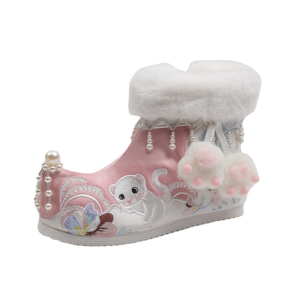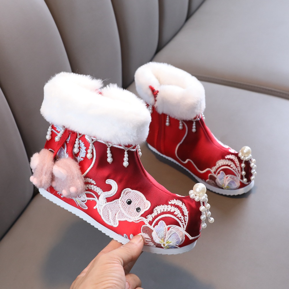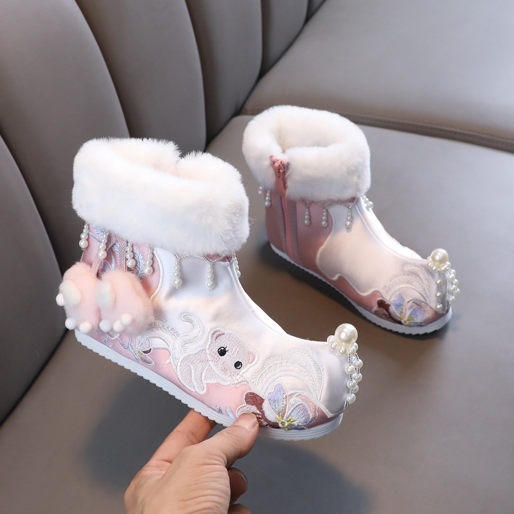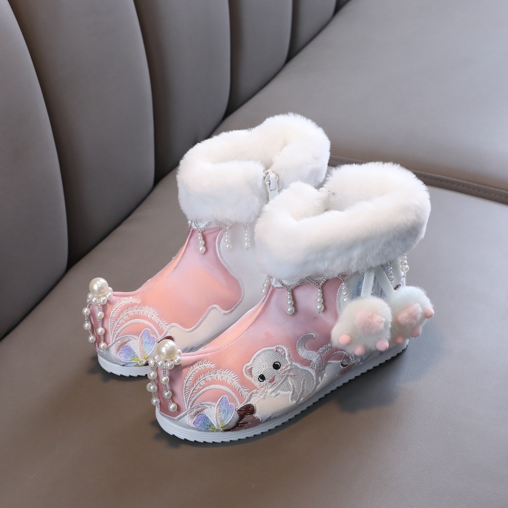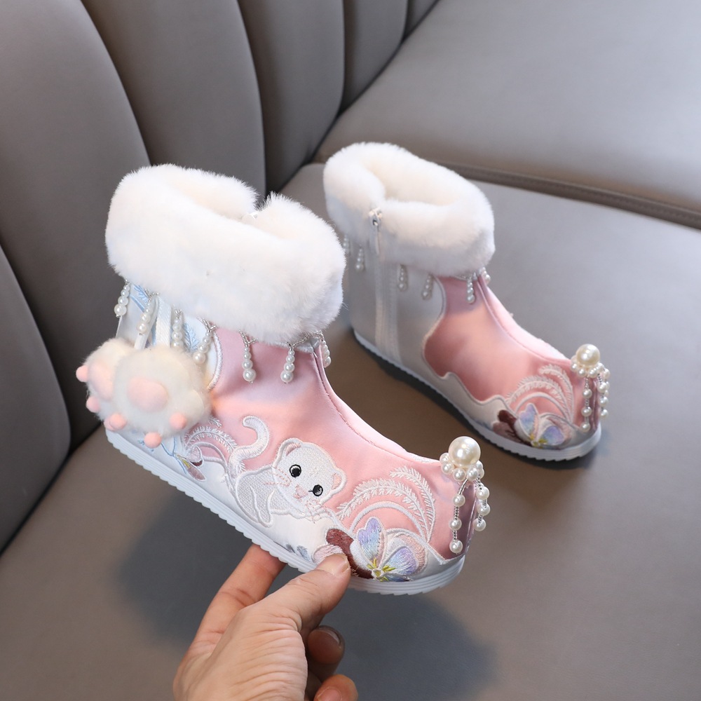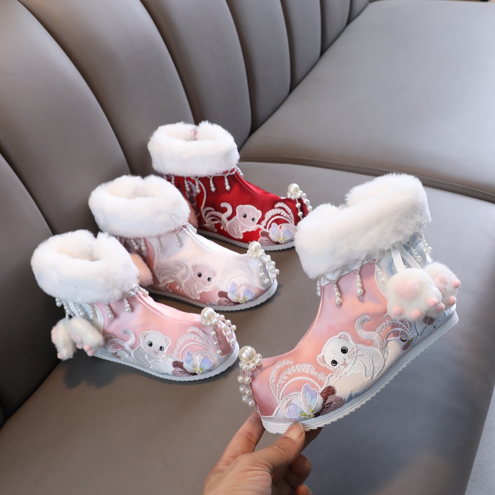 Зимние туфли Ханьфу 2024 для девочек, традиционные хлопковые туфли на флисовой подкладке, детские вышитые туфли, короткие сапожки в китайском древнем стиле для маленьких принцесс