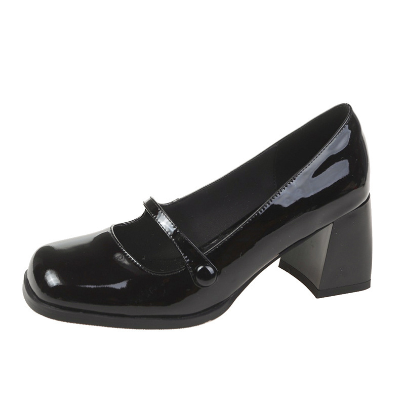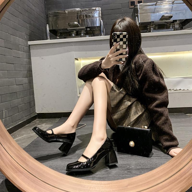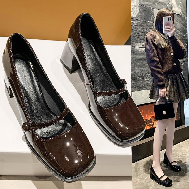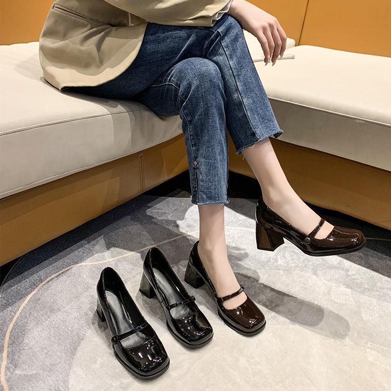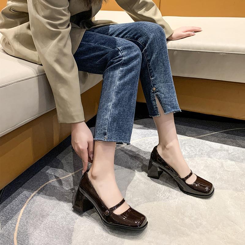 Обувь Мэри Джейн Женская 2023 Весна Новая французская винтажная кожаная обувь с квадратным носком и мелким ртом Лето и осень на толстом каблуке на высоком каблуке