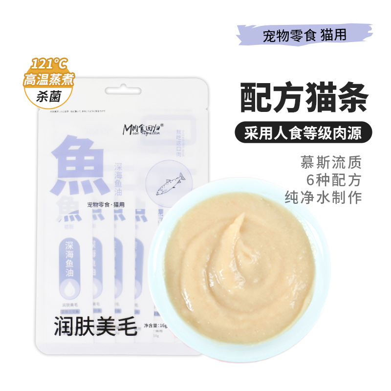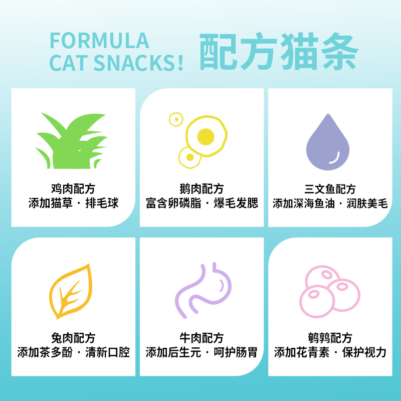 Функциональные муссовые полоски для кошек с перепелом и антоцианами защищают зрение; Функциональные муссовые лакомства для кошек — говядина и пребиотики — бережно воздействуют на пищеварение; Функциональные муссовые полоски для кошек с кроличьим мясом и чайными полифенолами, свежий вкус.; Функциональные муссовые полоски для кошек с рыбным мясом и рыбьим жиром, увлажняющие и улучшающие состояние шерсти.; Функциональные муссовые полоски для кошек, гусиное мясо и лецитин, для шерсти и щек.; Функциональные полоски для кошек с муссом, курица и шерстяной шарик кошачьей травы