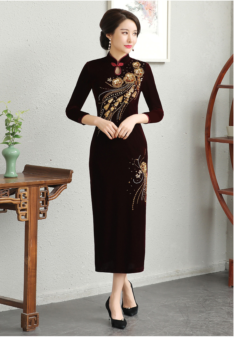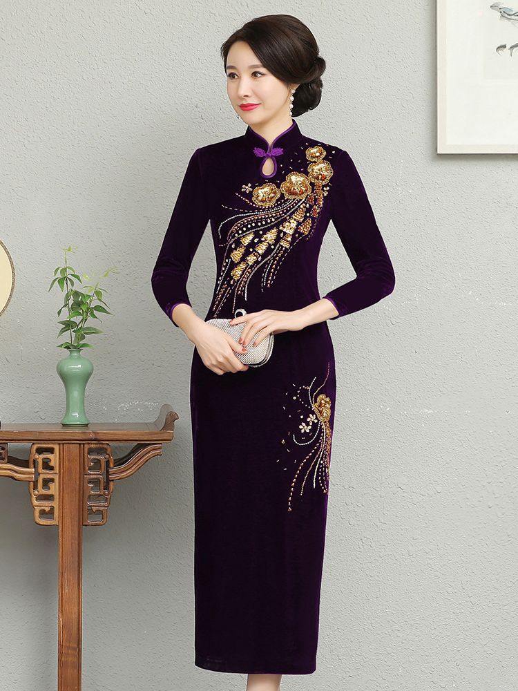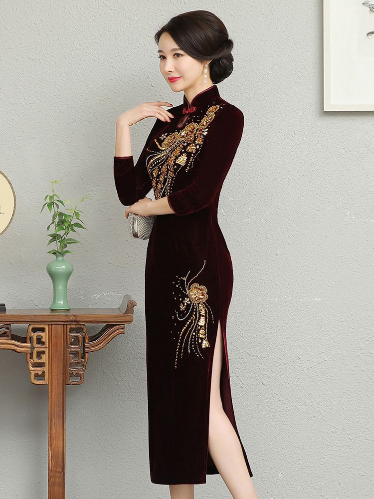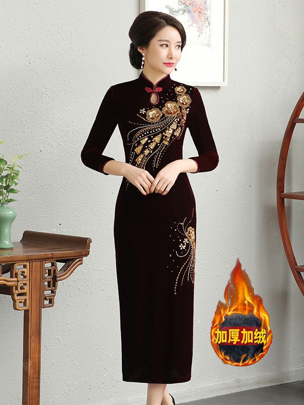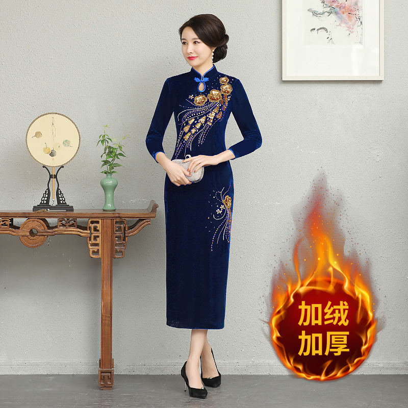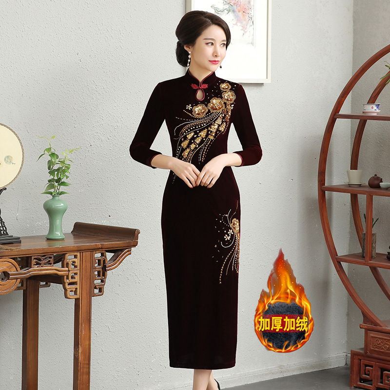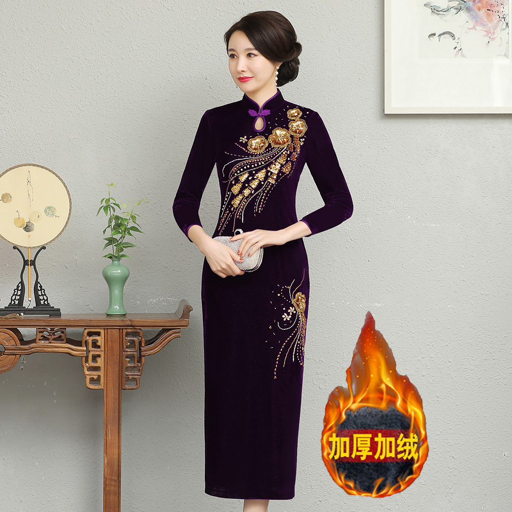 В наличии: флисовое и утолщенное платье-ципао для торжеств, расшитое бисером, новое осенне-зимнее бархатное платье для мам, цельное, оптом.