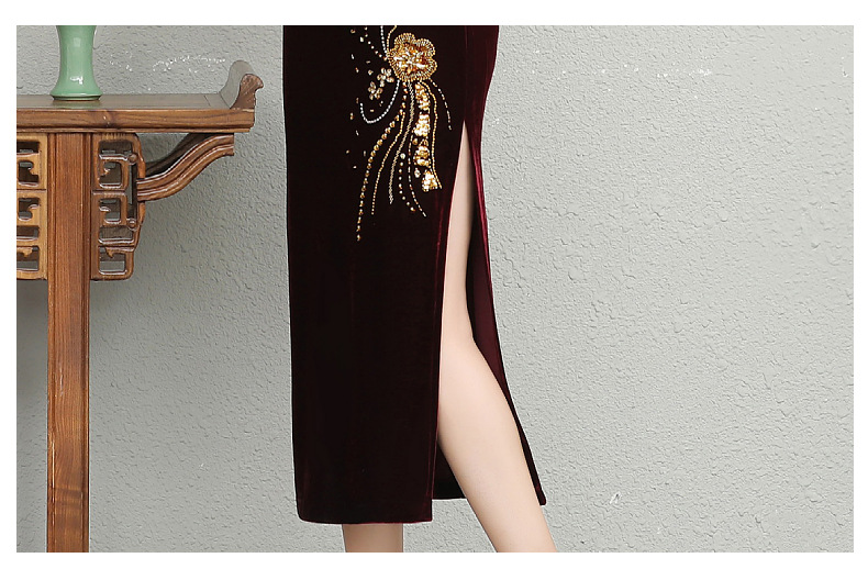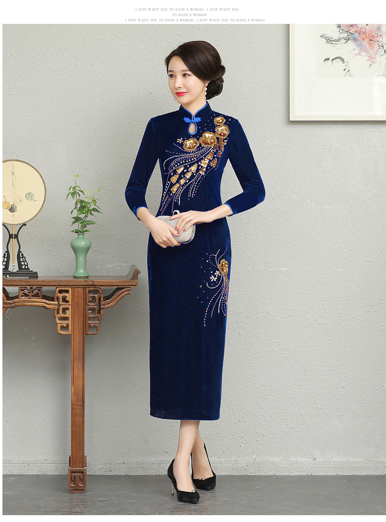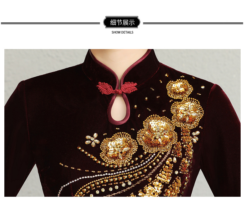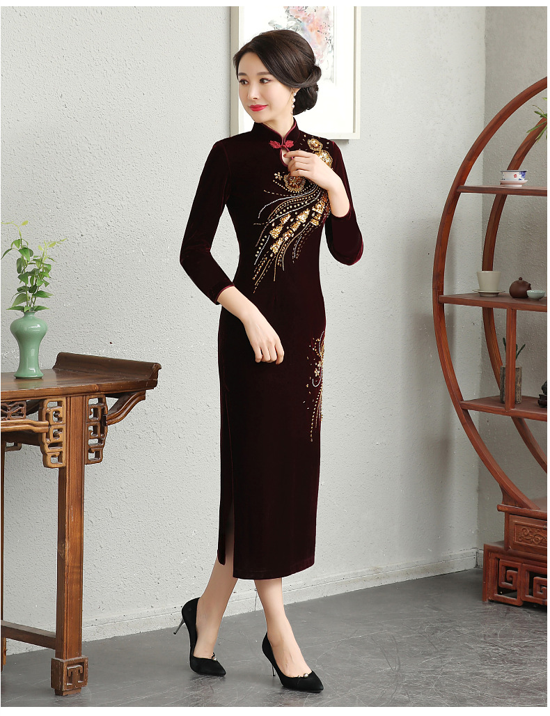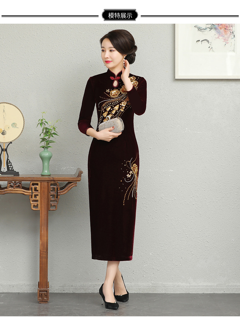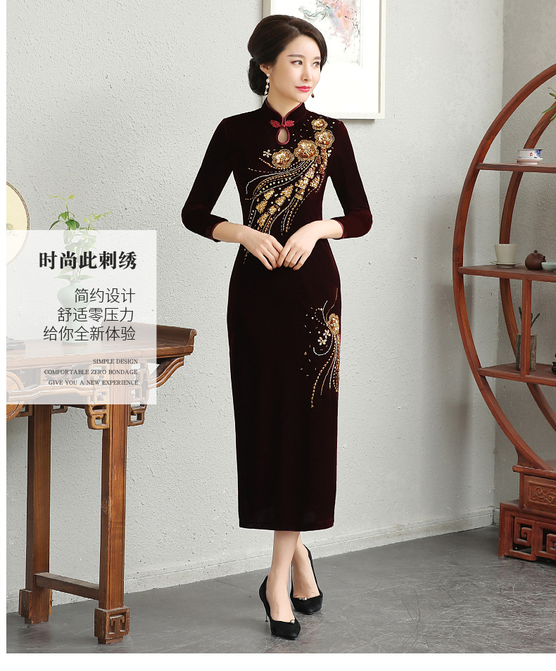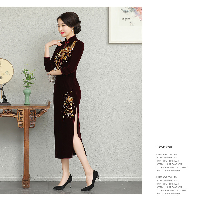 В наличии: флисовое и утолщенное платье-ципао для торжеств, расшитое бисером, новое осенне-зимнее бархатное платье для мам, цельное, оптом.
