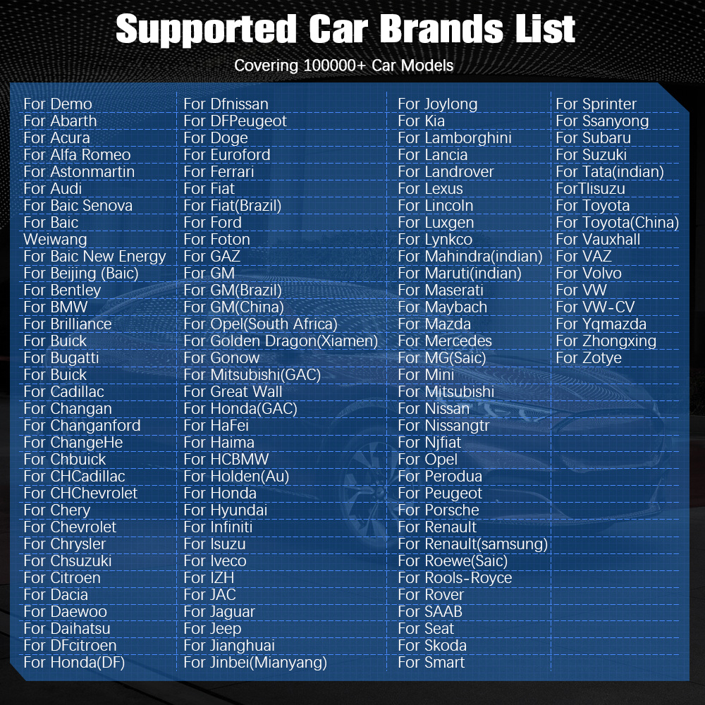 Include : ABS System, Engine System, SAS System , TPMS System , IMMO System , Battery System ,Oil Service System , SRS System ,DPF System ,Air Conditioning System,Transmission System, etc...