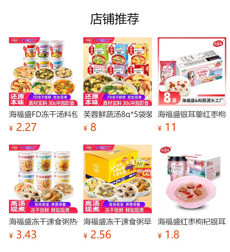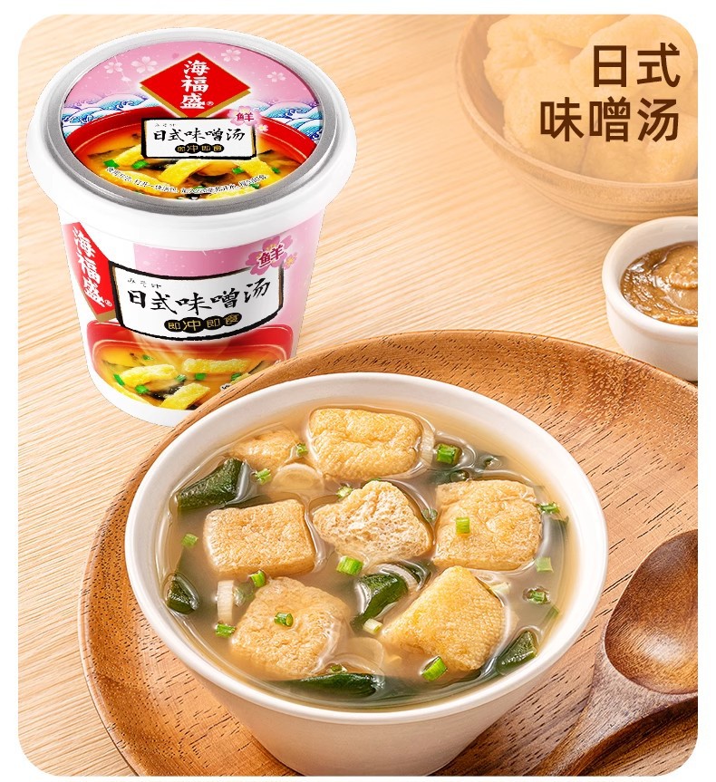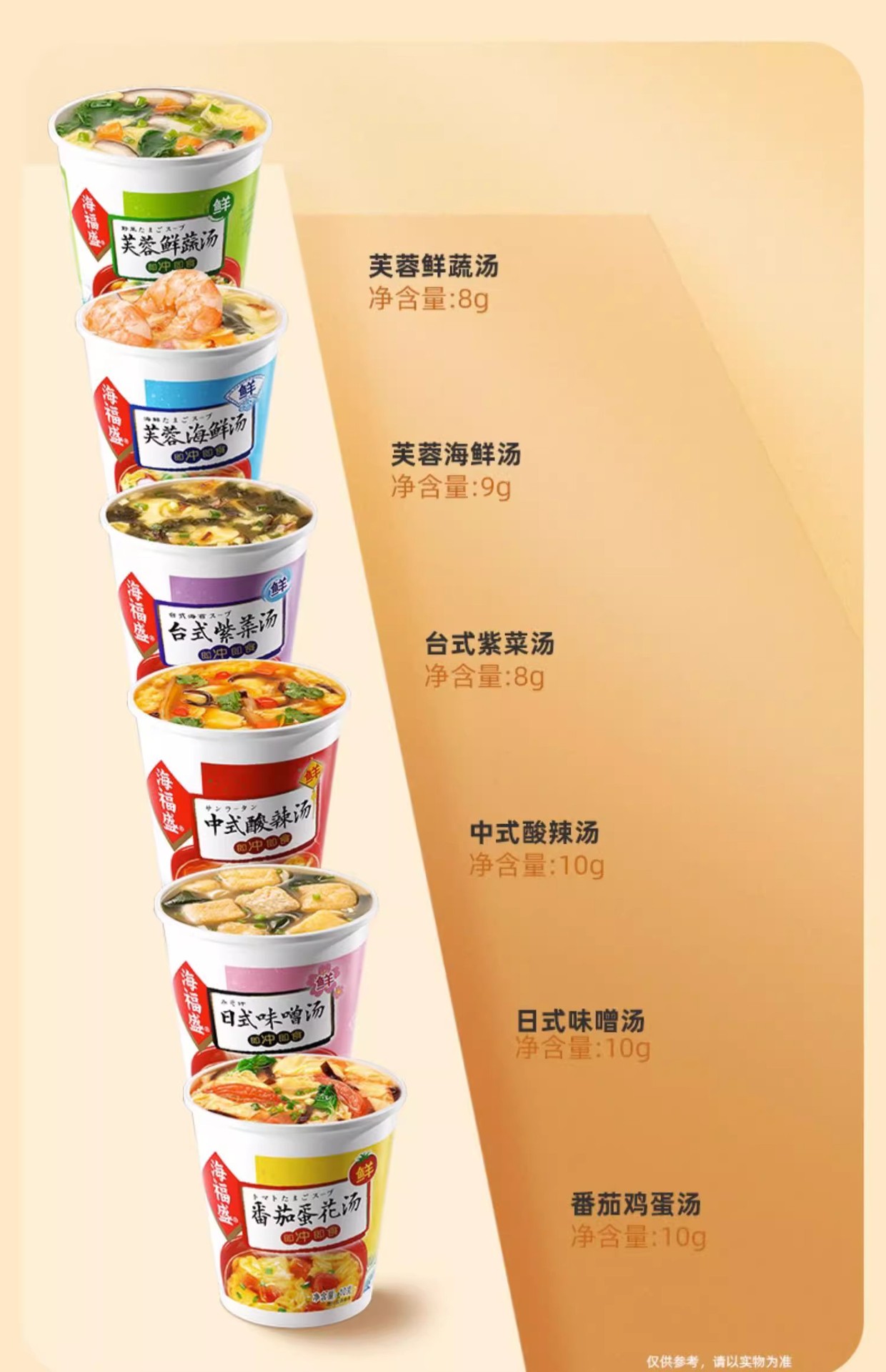 Свежий овощной суп с гибискусом; Суп из морепродуктов Фуронг; Тайваньский суп из морских водорослей; Китайский острый и кислый суп; Японский суп из мисо; Суп с яйцом и помидорами