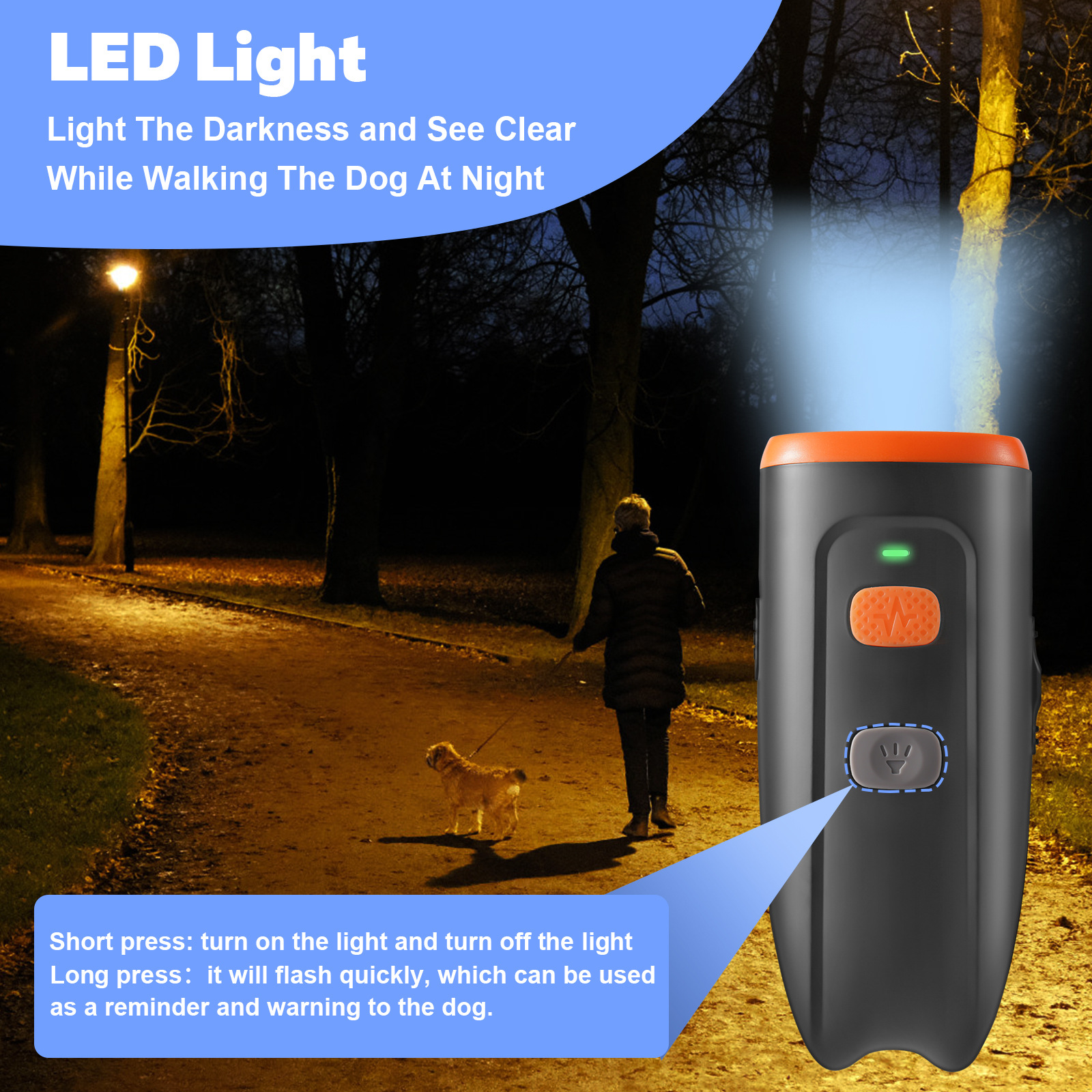 一款通过按下发射按钮发出超声波来矫正狗狗不文明行为的超声波训导器。超声波训导器发出的超声波会刺激狗狗,让狗狗感到惊诧,从而中断吠叫并防止后续不文明行为的发生。持续使用一段时间,会让狗狗逐渐改善不文明行为,养成文明出行的好习惯。