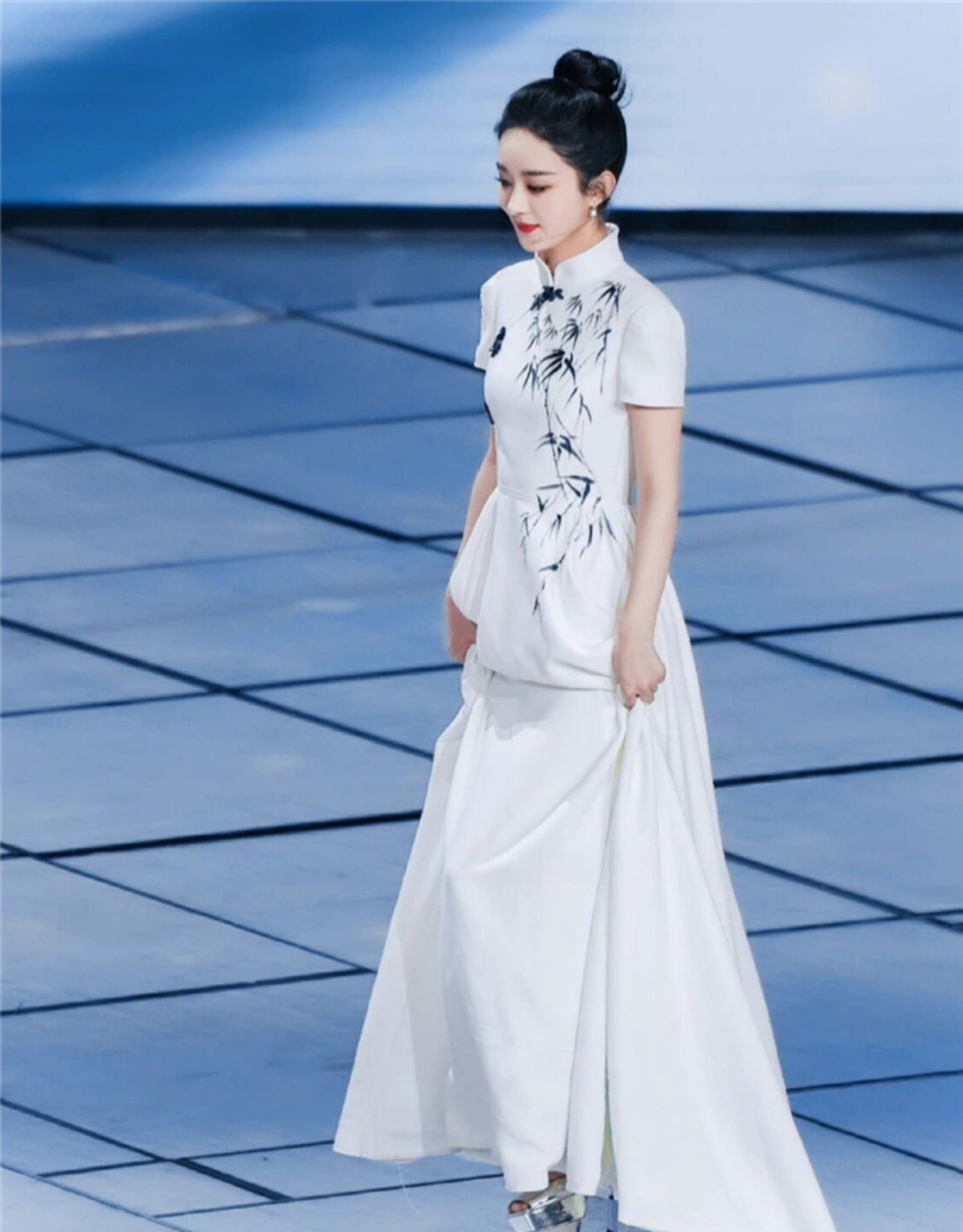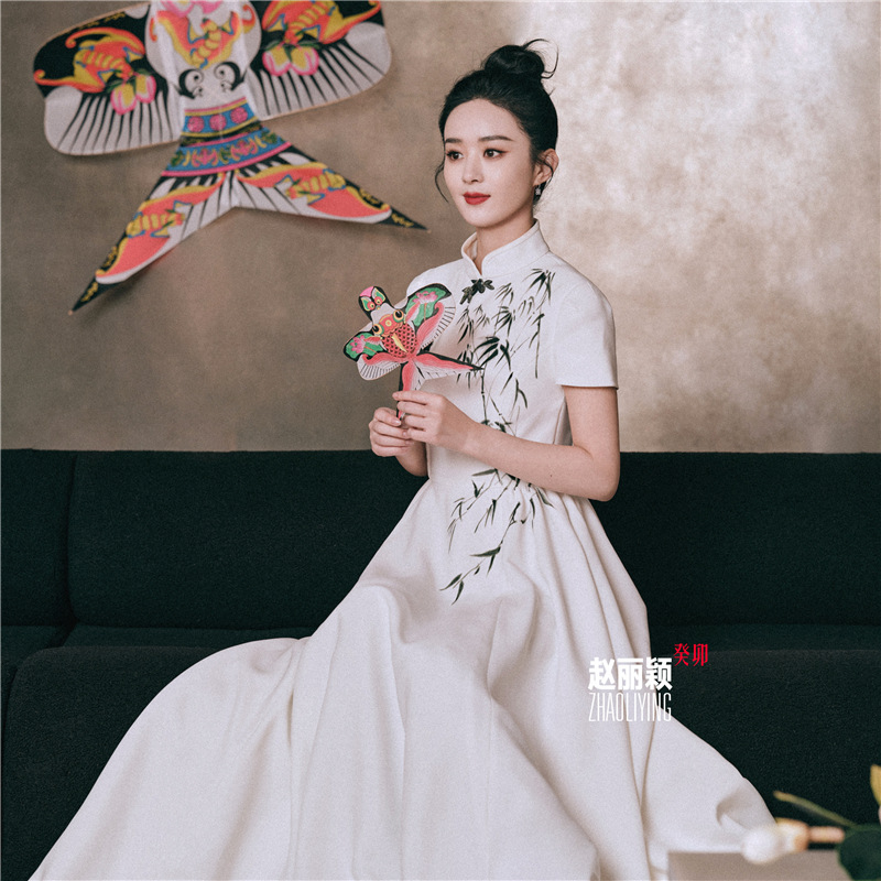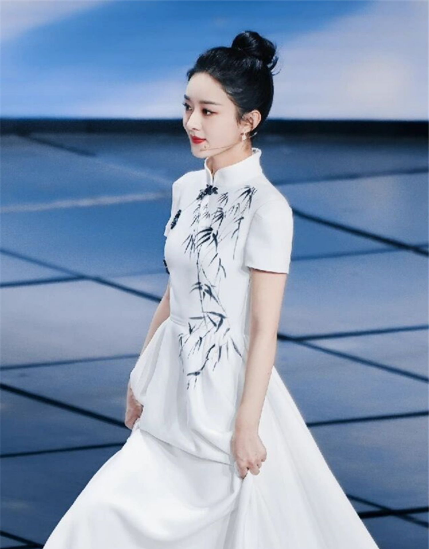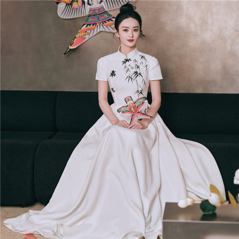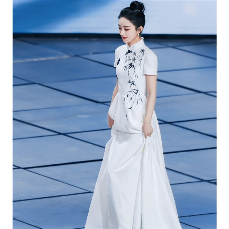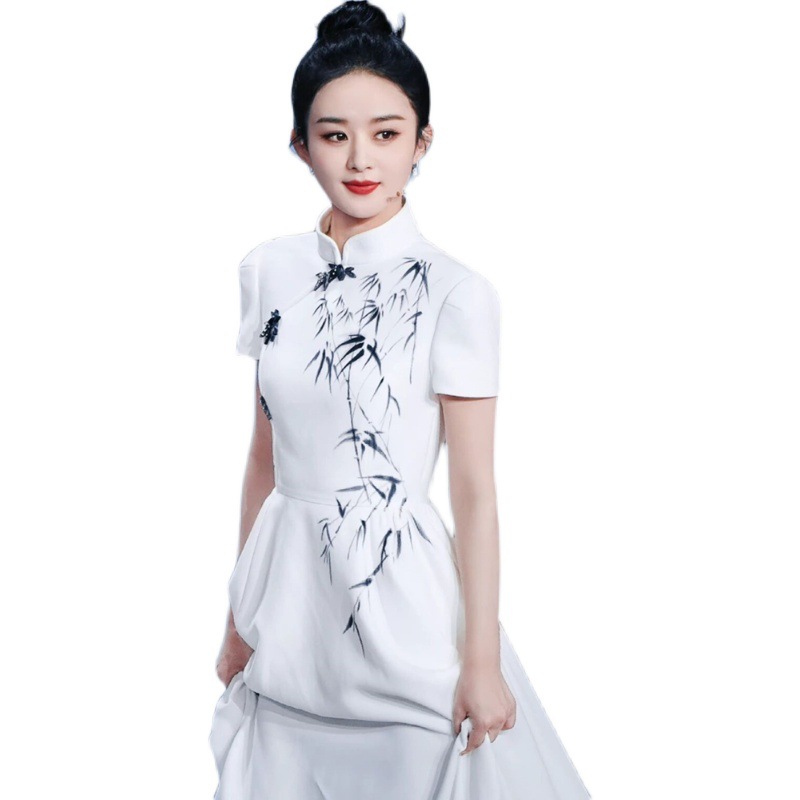 9108 Zhao Liying 2023 CCTV Весенний фестиваль Гала-концерт с белым платьем Чернильное бамбуковое платье Чонсам с короткими рукавами в национальном стиле