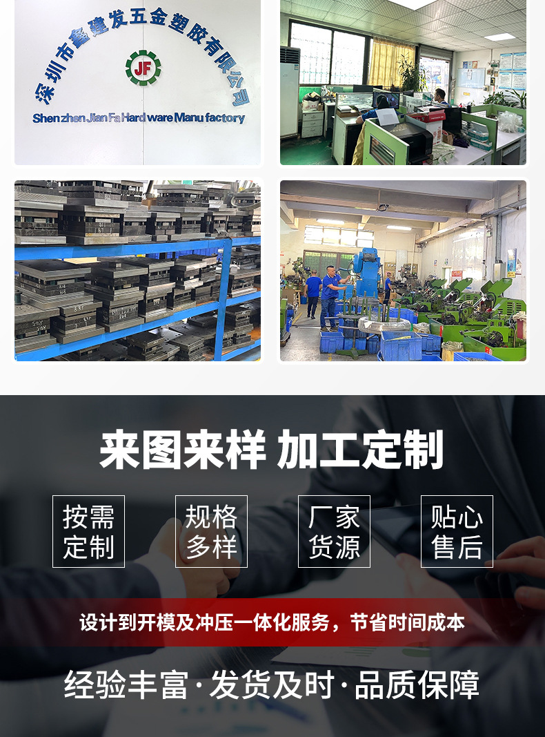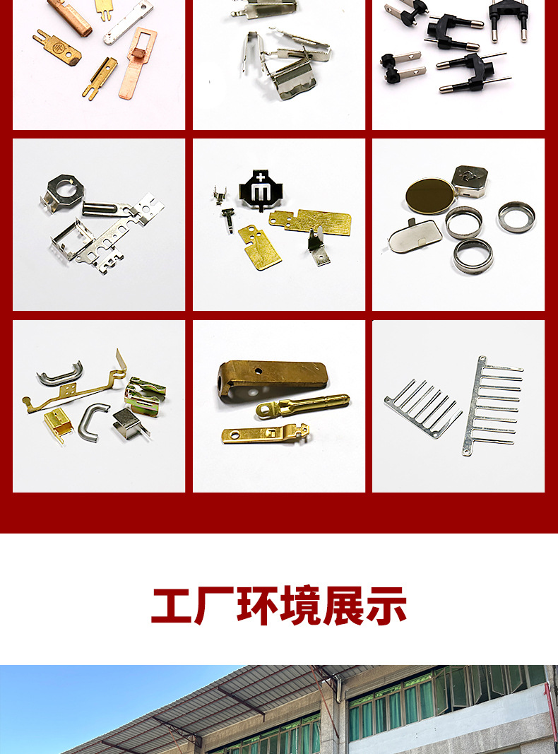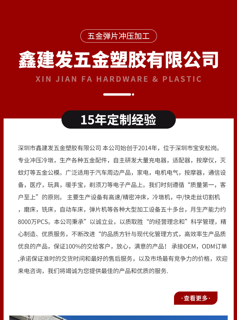 本公司始创于2014年,专业生产各种五金配件,弹片,铝壳,电极片,端子,插头铜针等自主研发大量充电器,适配器,按摩仪,灭蚊灯等五金公模。广泛适用于汽车周边产品,家电,电机电气,暖手宝,按摩器,通信设备,医疗,玩具等电子产品上。我们时刻遵循质量第一,客户至上;的原则。