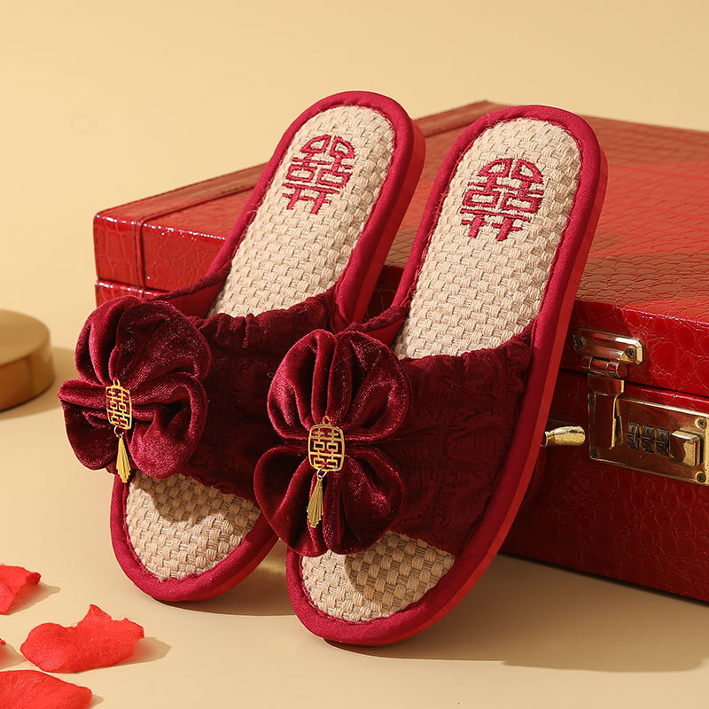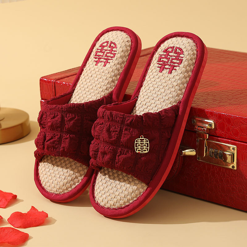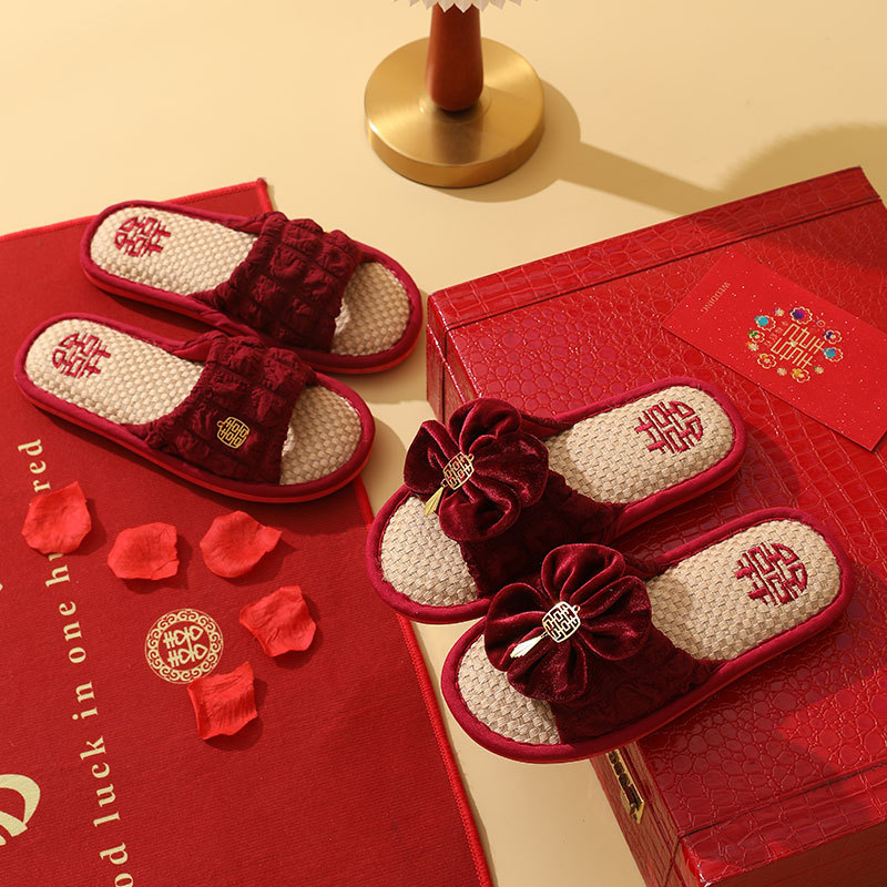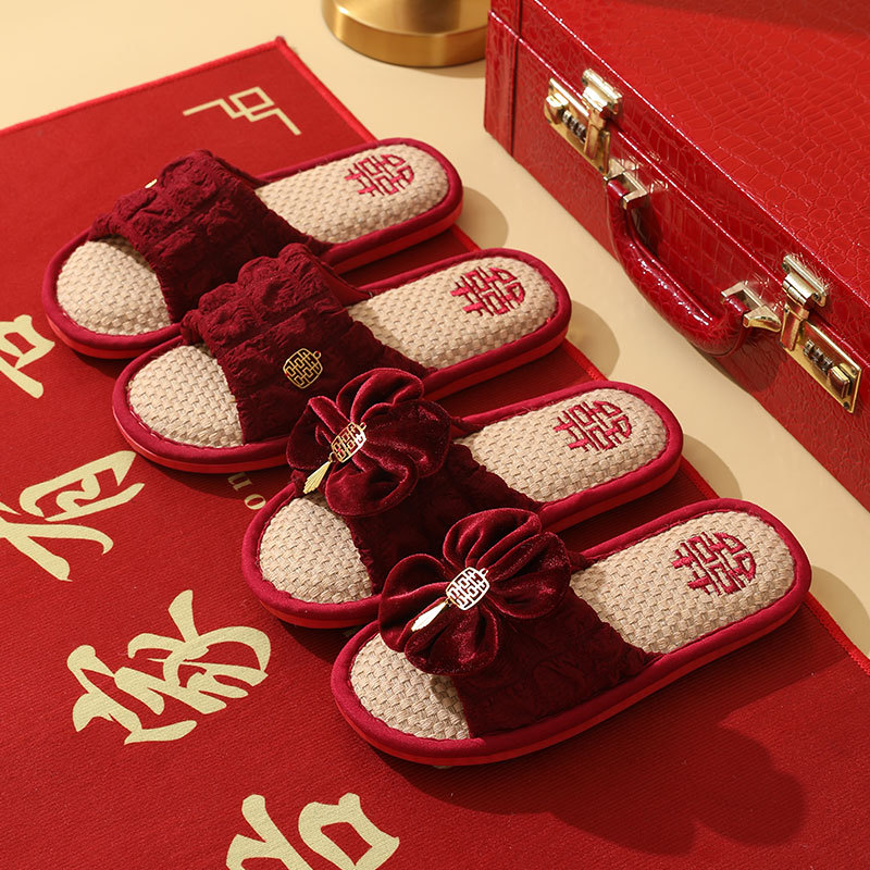 Льняные свадебные тапочки Свадебная пара Красные праздничные домашние Нескользящие домашние свадебные тапочки жениха и невесты с приданым