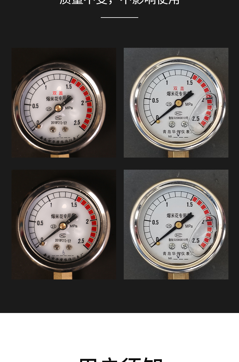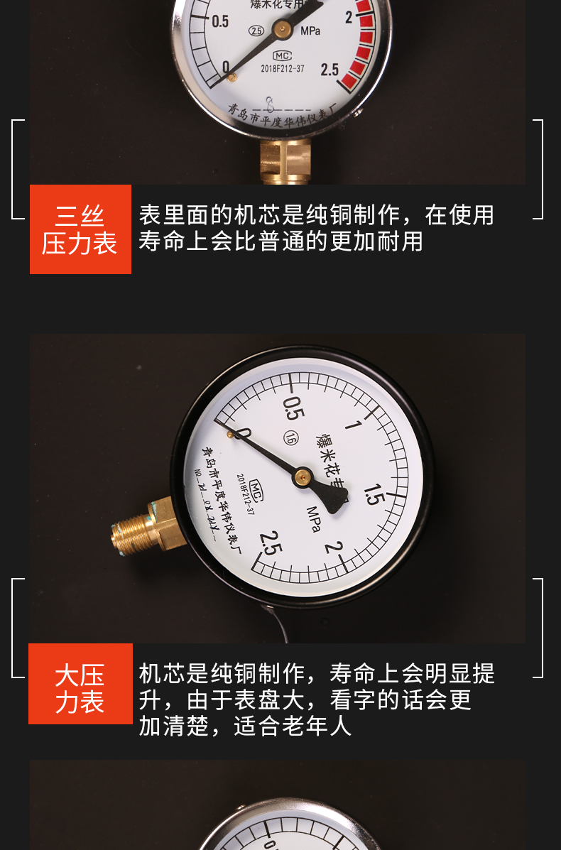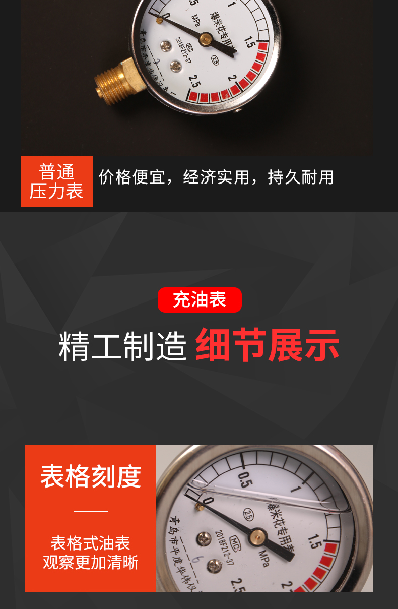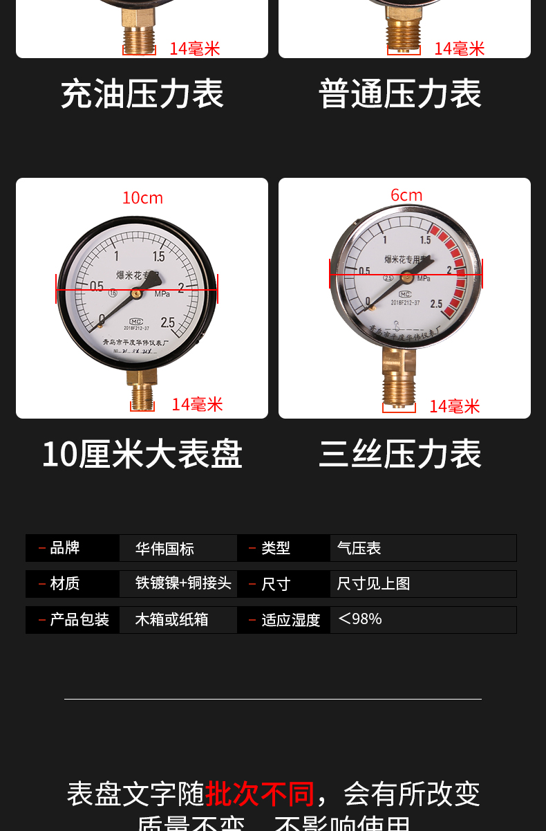 Один манометр масла (медное движение); Большие часы 10 см (медный механизм); Один трехпроводной Манометр (медное движение); Один обычный манометр; Чжуо И