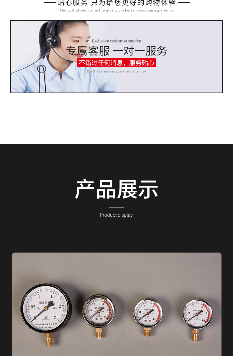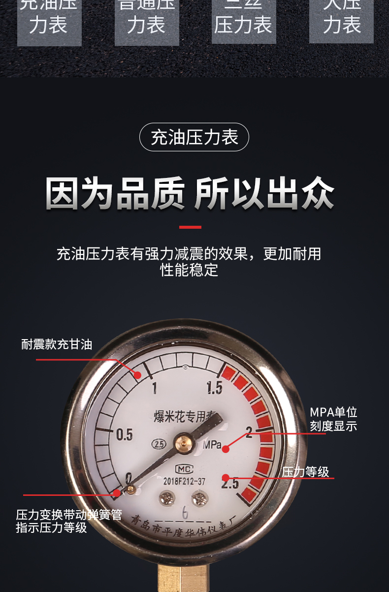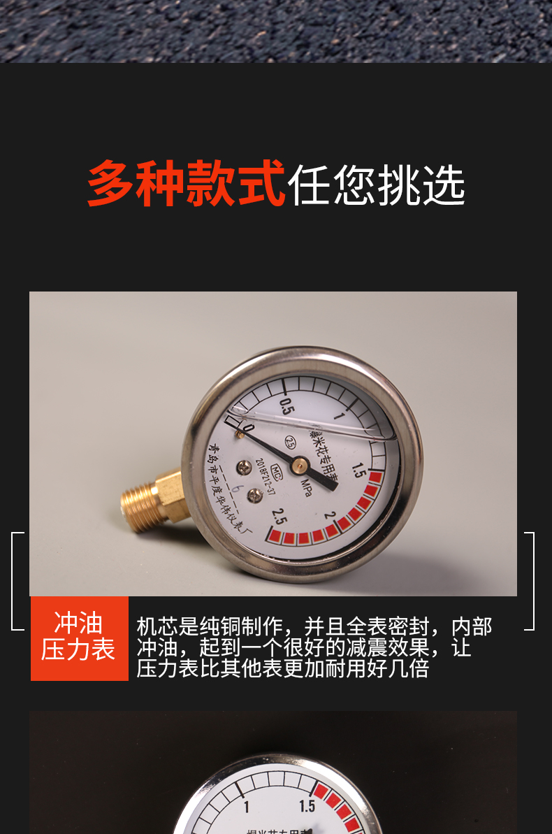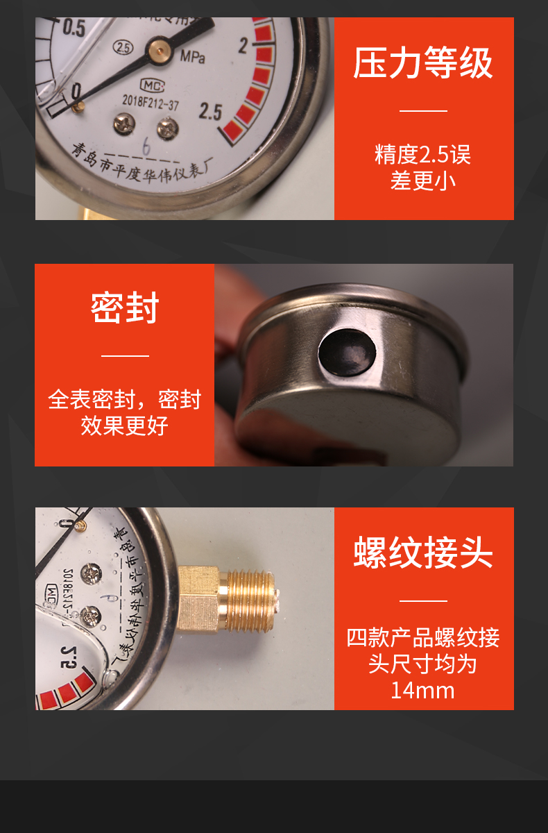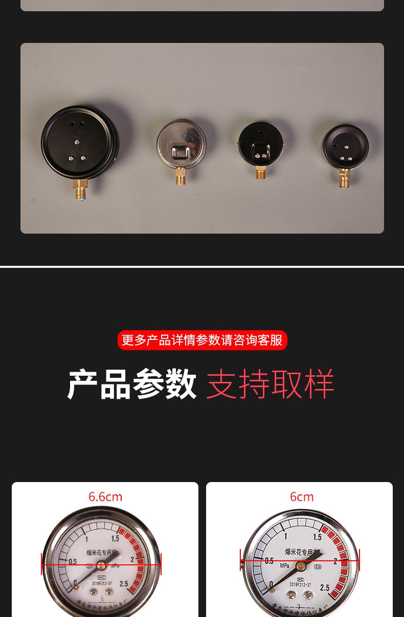 Один манометр масла (медное движение); Большие часы 10 см (медный механизм); Один трехпроводной Манометр (медное движение); Один обычный манометр; Чжуо И