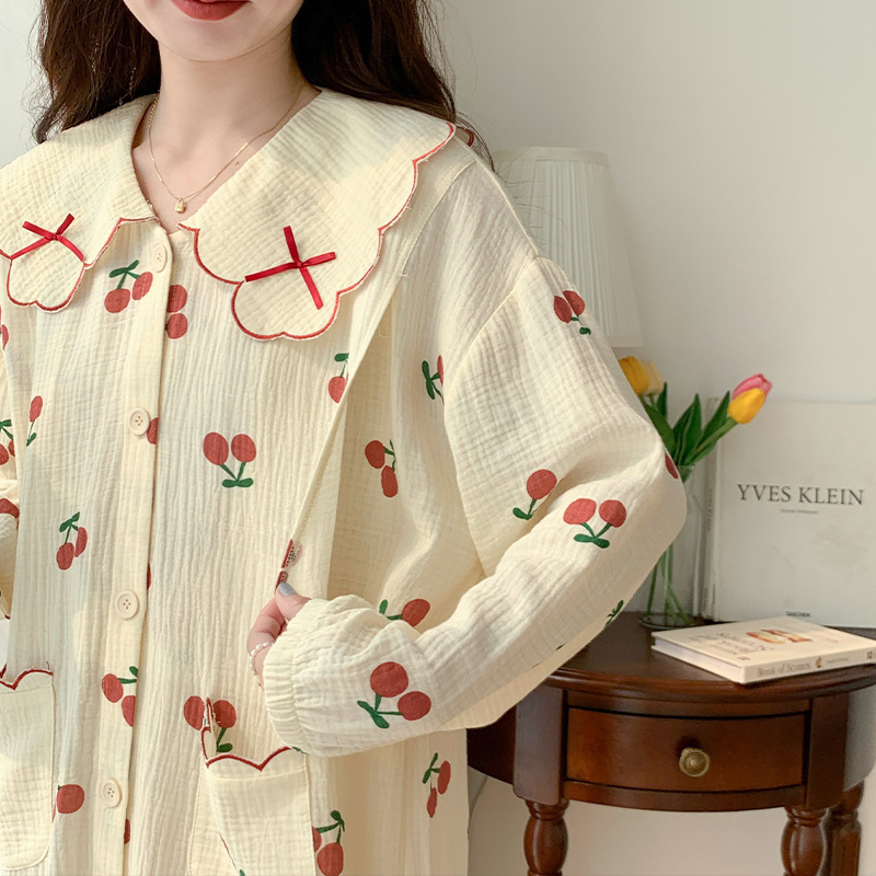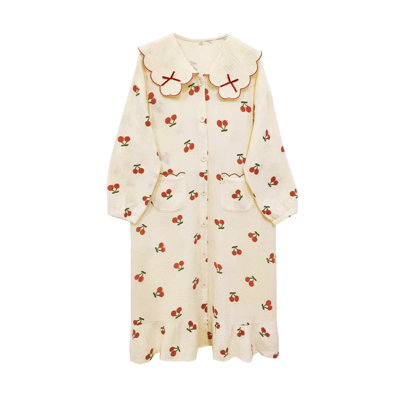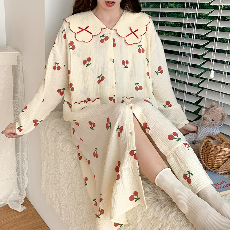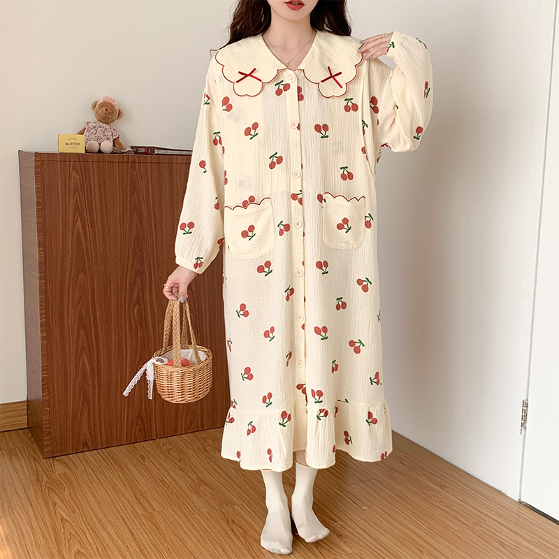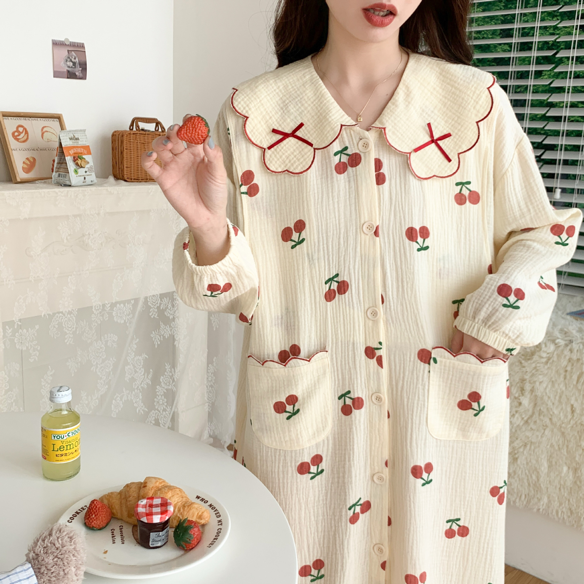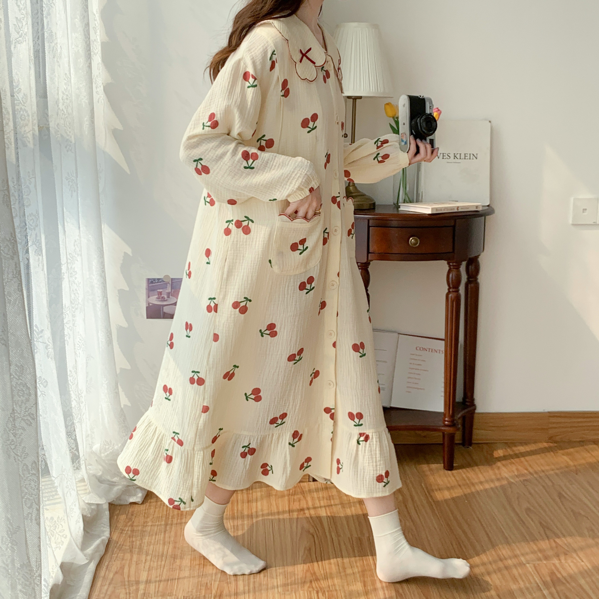 [In Stock 3217] Свободная хлопковая марлевая ночная рубашка больших размеров с длинным рукавом Весенне-летнее платье Вишневое платье для беременных