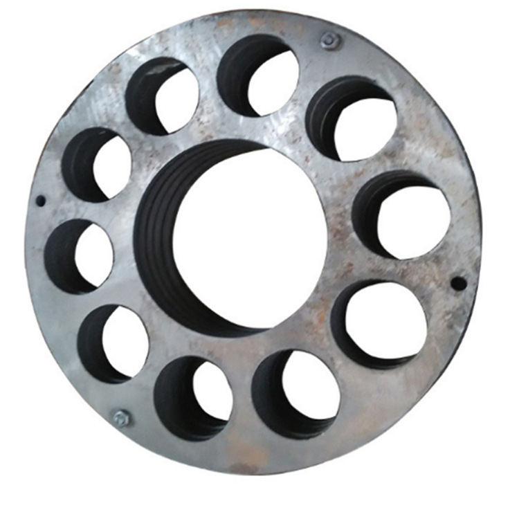 喷浆机摩擦板是喷浆机研磨砂石的主要部件,由于直板研磨砂石磨损比较快,较易在其表面磨出条沟造成与升高垫结合面处漏风严重,使风压减小,不能喷浆,这样只能更换钢衬板。喷浆机钢衬板费用高,频繁更换造成了较大的浪费。转子型混凝土喷浆机衬板,在圆形衬板外圈的孔为料孔,内圈的孔为风孔,各风孔边缘之间,各料孔边缘之间的距离均不大于10毫米。