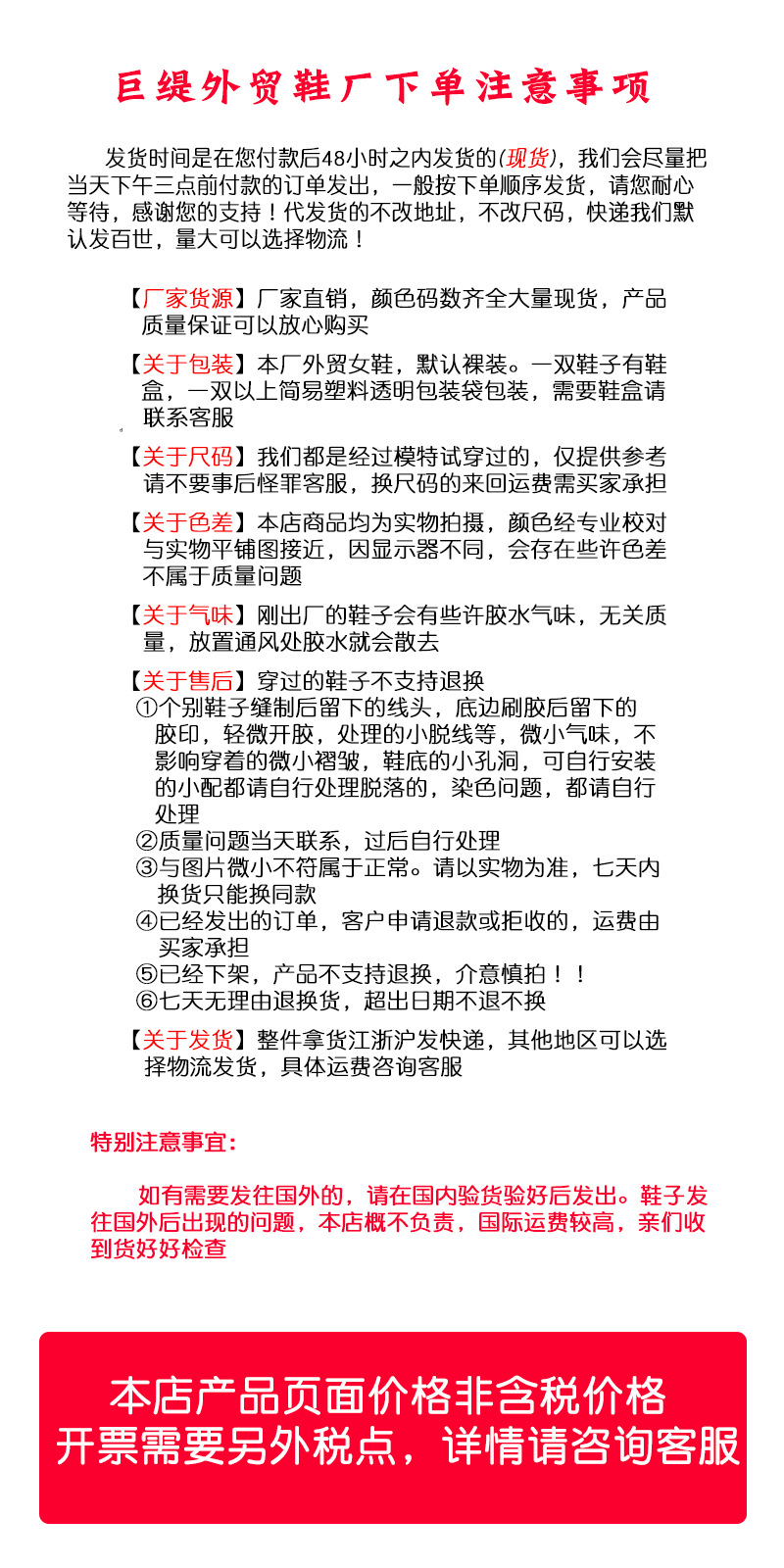 关于质量:我们是自产直销,鞋子一生产出来就发出,期间没有间隔,会稍微有胶水皮革之类的味道!在通风处放置一会胶水气味就会散去。断底,脱胶,破损,严重色差,严重污点。本店负责全部处理费用。小线头,小污点,微色差,微胶水味均不是质量问题。