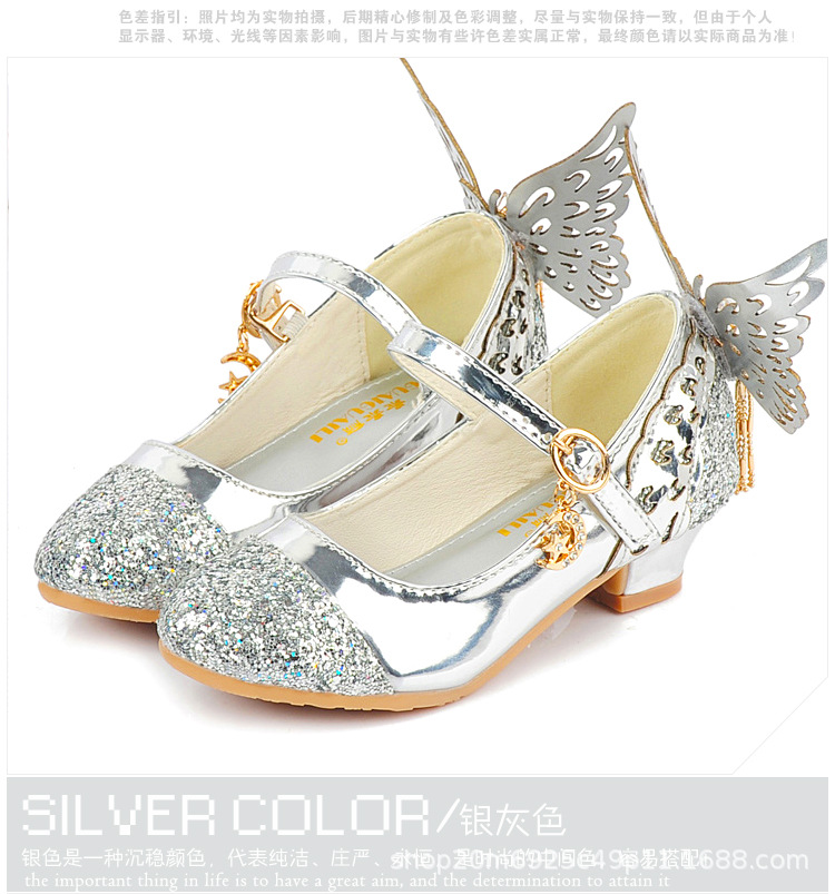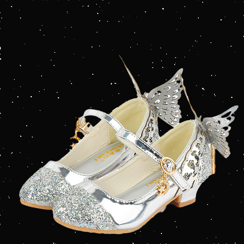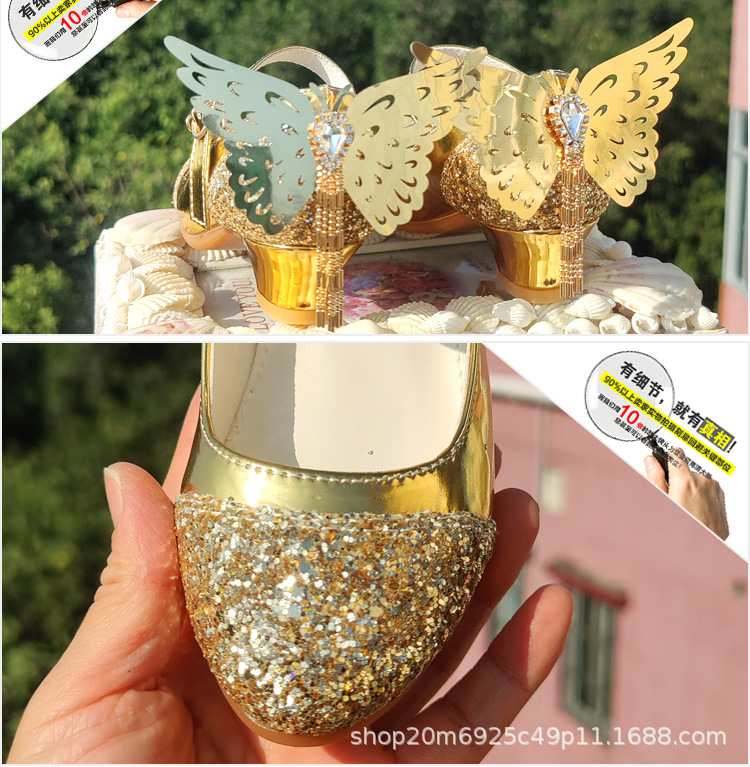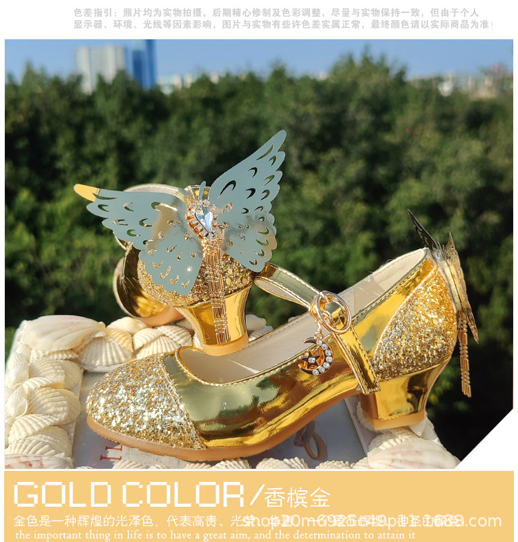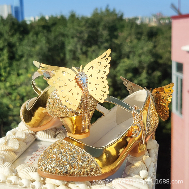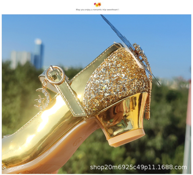 Новогодняя обувь принцессы для девочек, детская обувь на высоком каблуке с платьем, модная корейская модная обувь из иностранной кожи с кристаллами, золотой прилив