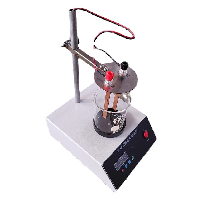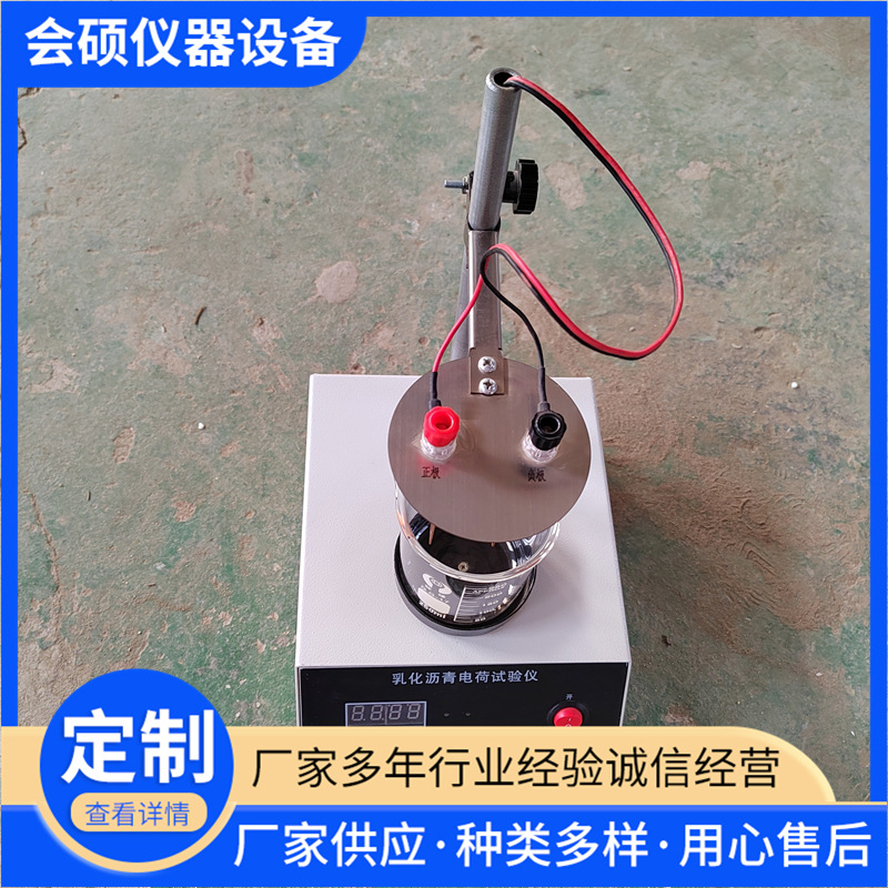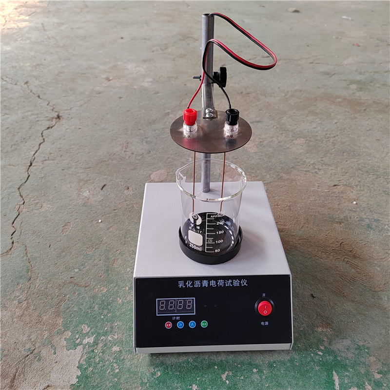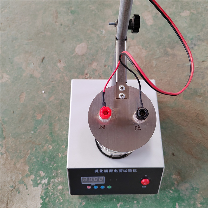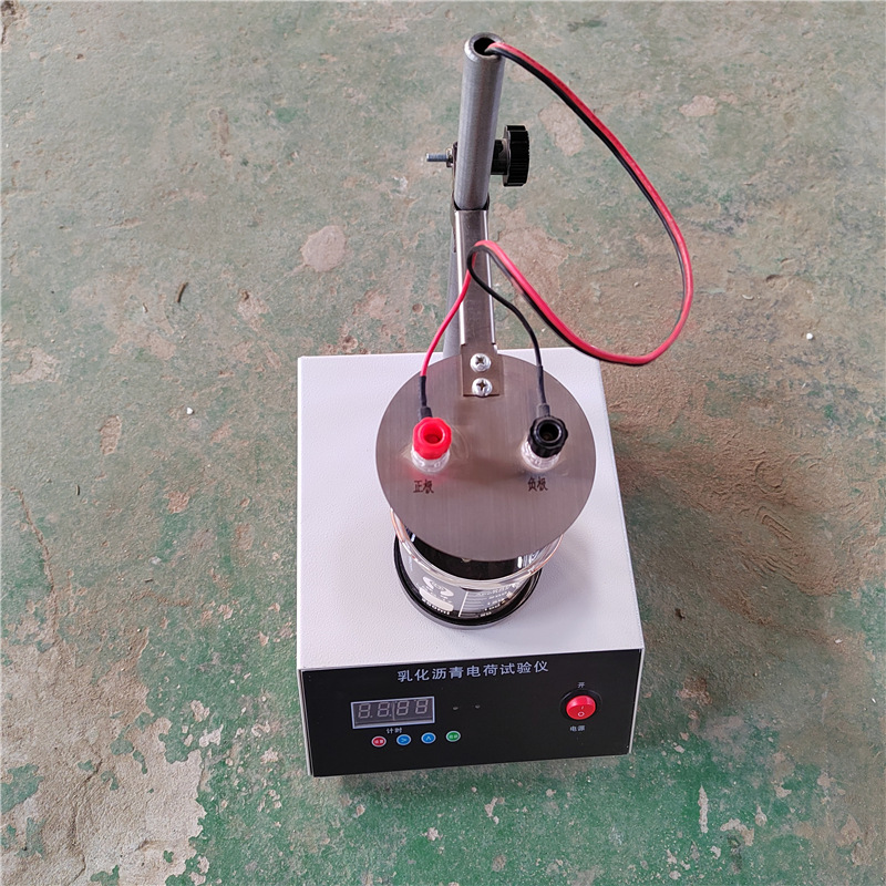 本仪器用于测定各类乳化沥青微粒离子的电荷性质,即阳、阴离子的类型。乳化沥青的微粒离子电荷是指乳液中分散的微粒所带电荷 性质,以确定乳液的类型,带正电荷(+)的为阳离子乳化沥青,带负电荷(-)的为阴离子乳化沥青。本仪器通过向沥青乳液中插入电极,施加直流6V的电场,根据离子运动并附着的情况,判断乳化沥青的微粒离子电荷极性。