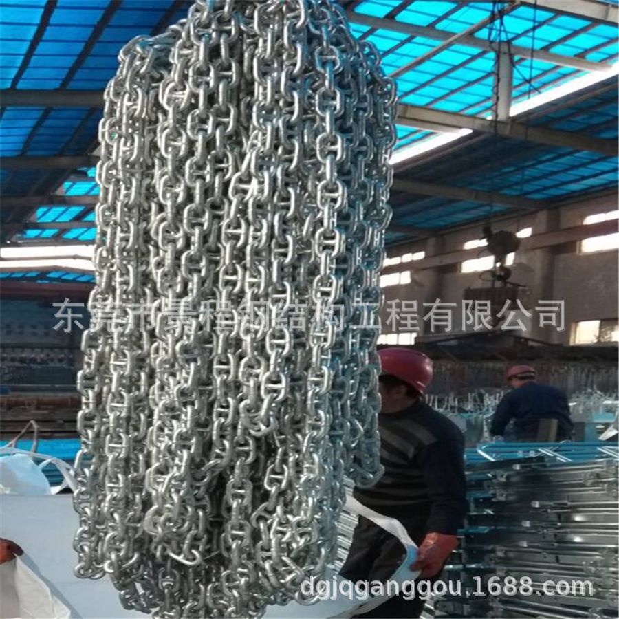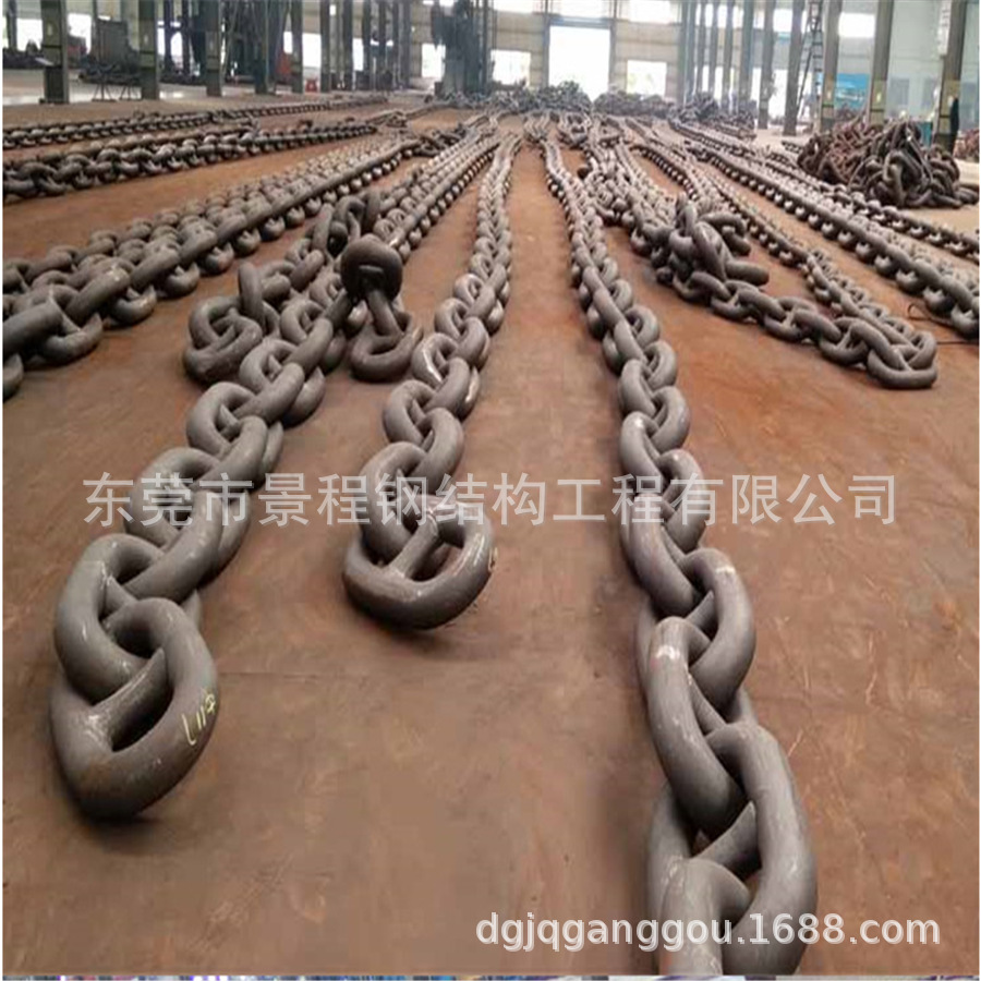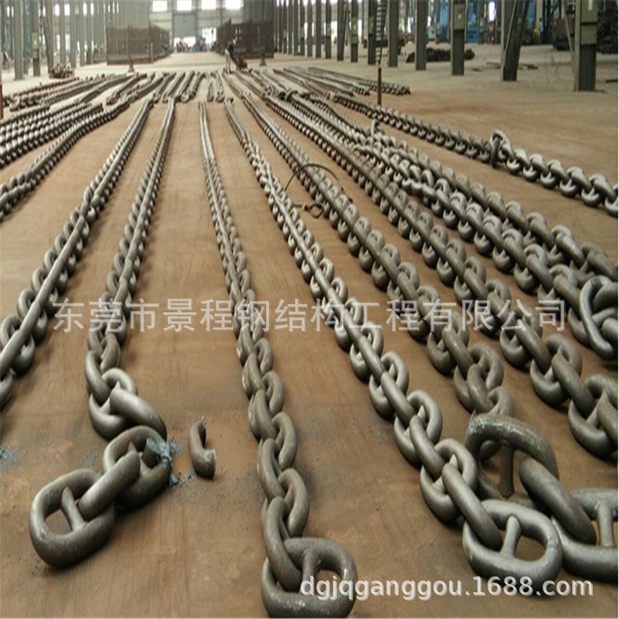 锚链,是指连接锚和船体并传递锚抓力的专用链条。常由锚端链节、中间链节和末端链节等组成。按链环的结构,可分为有档锚链和无档锚链两种,前者的强度比后者大;按制造方法锚链可分为铸钢锚链和电焊锚链等。锚链的长度以节为单位,每节锚链的标准长度为27.5m。节间用连接链环或连接卸扣进行连接。通常万吨轮每舷主锚所配链长为12节左右。