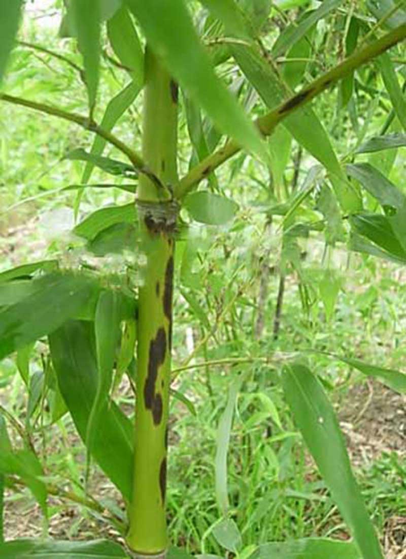 径0.5-1.5cm,新秆微被白粉,节下白粉环明显,秆髓片状分隔,秆环与箨环均隆起;箨环常具残箨及刺毛环,节间长21-31cm。箨鞘淡绿色,微被白粉,有绿脉纹及锈褐色斑点和斑纹,尤以基部较密,秆上部箨鞘则无斑点,边缘有脱落性纤毛,反部常具一圈锈褐色毛环;箨叶三角状披针形,外翻;箨舌弧形,高1.5-3mm,背面被浓密白粉,先端有灰色短纤毛;无箨耳或有时具微弱箨耳和数枚肩毛。每小枝具叶2-4权枚叶带状披针形,下面基部疏生短柔毛,叶舌密被白粉。