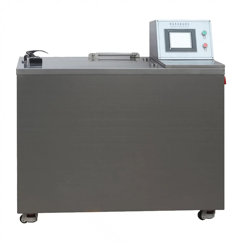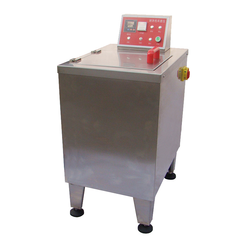 本仪器为箱式设计,由箱体、控制面板和转动系统组成,转动系统的主轴横贯测试箱,轴上安装12个小钢杯的插座。测试时,将装有试样、洗涤剂和钢珠的钢杯安装在主轴上,加热使箱内的水达到一定温度后,通过电机带动主轴以40rpm的速度旋转,使杯内的试样和钢珠在一定温度的洗涤液环境中相互摩擦一定时间,以模拟日常生活中的五次家庭洗涤或商业洗涤,观察试样在洗涤后的颜色变化,评定试样的色牢度等级。