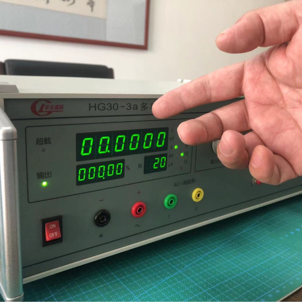 一、用途、特点: HG30-3a型多功能校准仪是智能化交、直流标准电压、电流校准仪(其中交流输出为真有效值显示)。仪器设有三个显示窗口,可同时显示输出实际值、百分比和被检表满度值。可设根据被检表满度值设置仪器的输出量程,并可根据被检表的刻度选择相应的步进量。输出调节可选择键盘(按键)控制或电位器控制。具有数字显示、误差直读、量程宽、分档细、精度高、稳定性好、使用方便等特点。适用于检定、检验、维修四位半数字三用表、各种0.2级、0.5级以下指针式交、直流电压、电流表;亦可作为高稳定度测试电源使用,配合高等级标准表,校对0.1级电流、电压表。 二、主要功能: 1 、5 1/2位LED数字显示输出量 ,按实际值和百分比两种方式同时显示。 2 、采用键盘控制输出量的增减。键盘控制量分为100%/N、10%/N、1%/N、0.1%/N(N为4、5、6、10、15)。 3 、外控调节器可以离机控制输出量的增减,调节器上有键盘和电位器两种配置,任意转换。 4 、交、直流电压输出范围为0~1050V。 5 、交、直流电流输出范围为0~20A。 6 、交流提供四种输出频率:50Hz、60Hz(59.7Hz)、400Hz、1000Hz,使用晶振保证频率的准确度和稳定性。 7 、输出超载能自动保护,手动复位。 8 、交流50Hz输出还可以选择市电同步,以减小被检表的拍频影响。 9 、钳形表测量功能:配用本厂标准线圈,可测量0~1000A电流,误差±0.3%。 三、技术性能: 1 、稳定性: AC﹤满量程的0.02%/5分钟 DC﹤满量程的0.01%/5分钟 作精密测量时仪器需预热两小时。 2 、交流失真度:﹤0.5% 3 、直流纹波系数:﹤0.05%(额定输出时) 4 、输出频率准确度:50Hz、60Hz(59.7Hz)、400Hz、1KHz﹤0.1%(或市电同步) 5 、输出电压、电流以及中值电阻的范围及准确度见(附表1) (23℃±2℃,输出值大于10%量程)