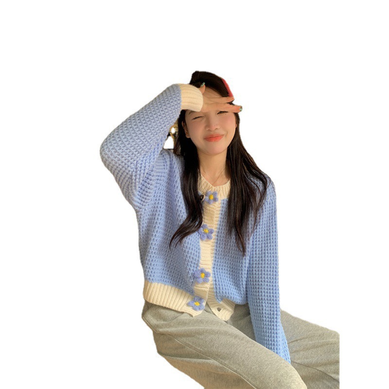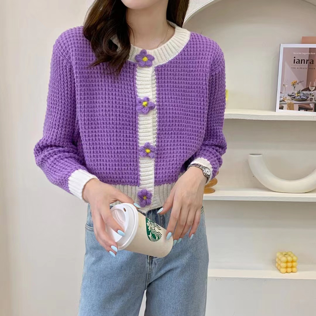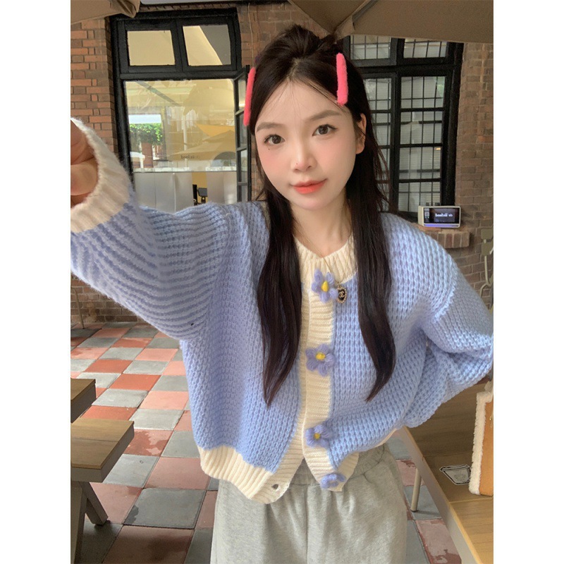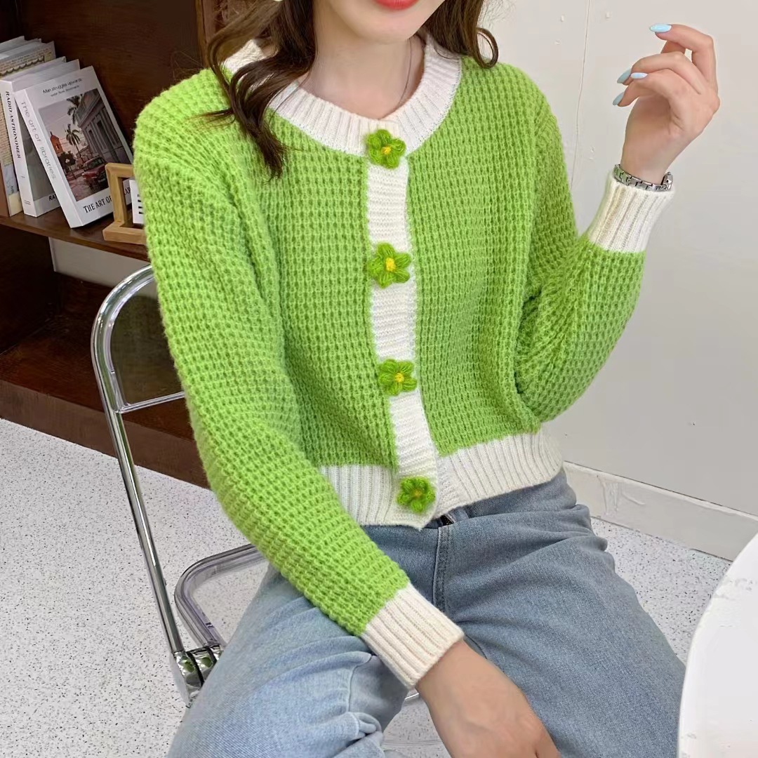 Свитер Женский 2023 осень-зима Новый Женский вязаный свитер с маленькими цветочными пуговицами Кардиган Контрастного цвета Свободный свитер Короткий ленивый стиль