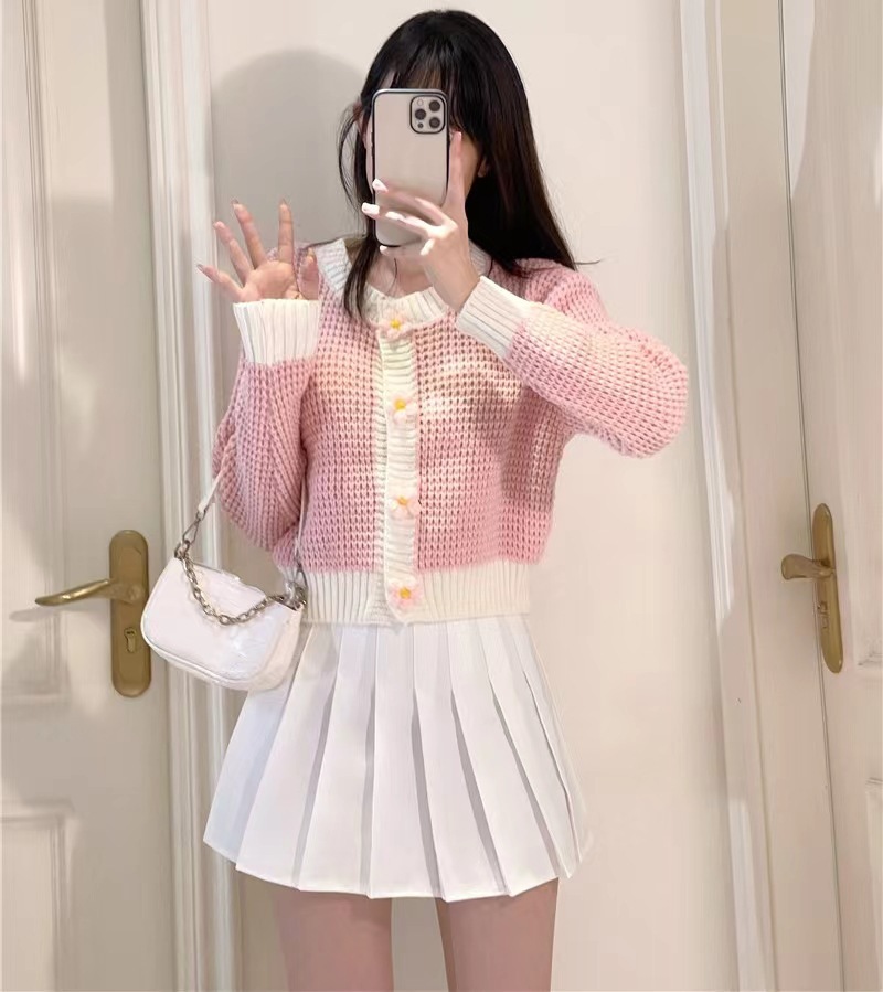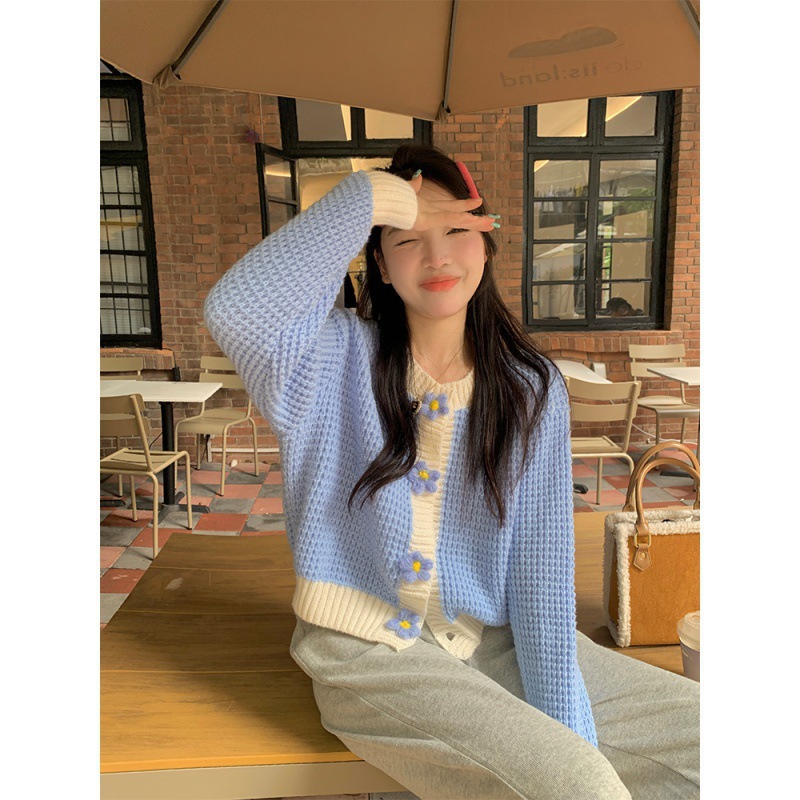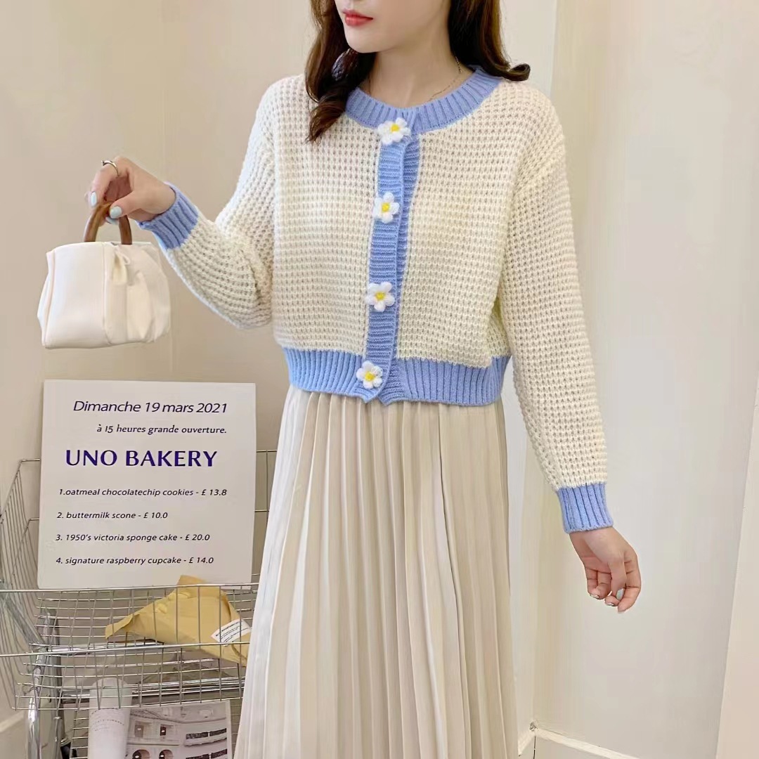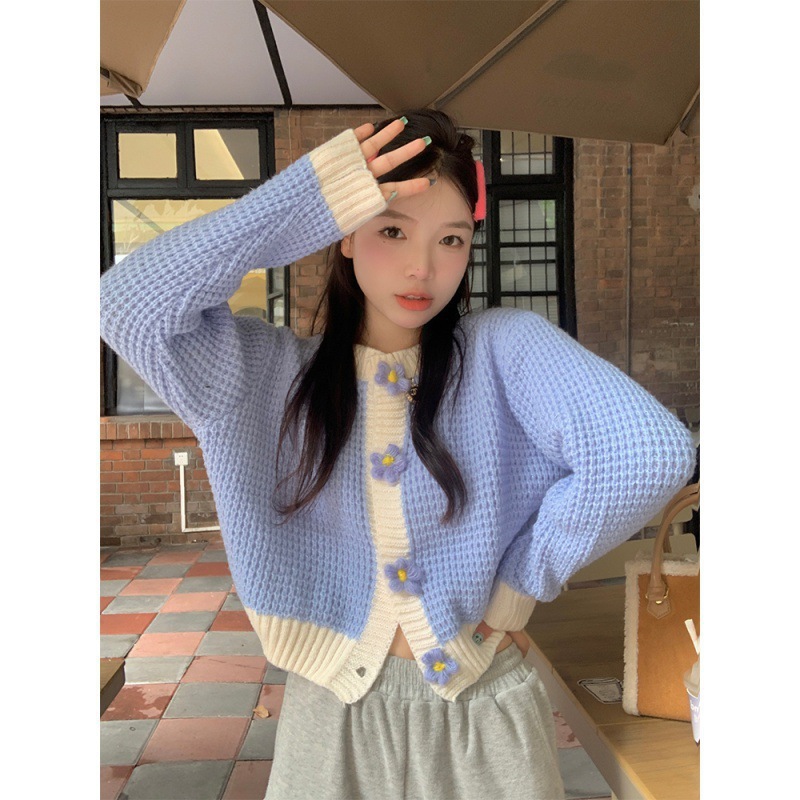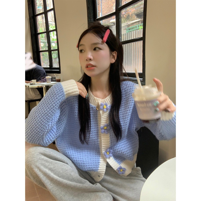 Свитер Женский 2023 осень-зима Новый Женский вязаный свитер с маленькими цветочными пуговицами Кардиган Контрастного цвета Свободный свитер Короткий ленивый стиль