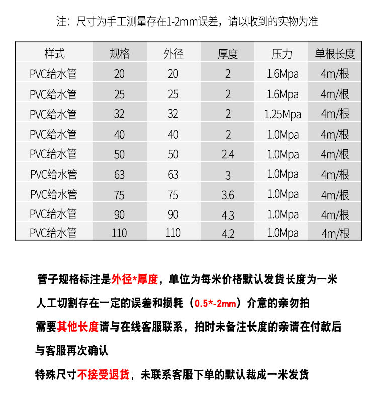 Труба водоснабжения-Внешний диаметр 20 мм * толщина стенки 2,0 мм; Труба водоснабжения-Внешний диаметр 25 мм * толщина стенки 2,0 мм; Труба водоснабжения-Внешний диаметр 32 мм * толщина стенки 2,0 мм; Труба водоснабжения-40 мм * Толщина стенки 2,0 мм; Труба водоснабжения-Внешний диаметр 50 мм * толщина стенки 2,4 мм; Труба водоснабжения-внешний диаметр 63 мм * толщина стенки 3,0 мм; Труба водоснабжения-Внешний диаметр 75 мм * толщина стенки 3,6 мм; Труба водоснабжения-Внешний диаметр 90 мм * толщина стенки 4,3 мм; Труба водоснабжения-Внешний диаметр 110 мм * толщина стенки 4,2 мм; Резьбонарезная труба-наружный диаметр 16 мм * толщина стенки 1,1 мм; Продевая нитку труба-наружный диаметр 20 мм * толщина стены 1,0 мм; Резьбонарезная труба-наружный диаметр 20 мм * толщина стенки 1,5 мм; Резьбонарезная труба-наружный диаметр 25 мм * толщина стенки 1,0 мм; Продевая нитку труба-наружный диаметр 25 мм * толщина стены 1,5 мм; Продевая нитку труба-наружный диаметр 32 мм * толщина стены 1,1 мм; Продевая нитку труба-наружный диаметр 32 мм * толщина стенки 1,6 мм; Продевая нитку труба-наружный диаметр 40 мм * толщина стены 1,7 мм; Дренажная труба-внешний диаметр 50 мм * толщина стенки 1,9 мм; Дренажная труба-внешний диаметр 75 мм * толщина стенки 2,1 мм; Дренажная труба-наружный диаметр 110 мм * толщина стенки 2,6 мм; Дренажная труба-наружный диаметр 160 мм * толщина стенки 3,2 мм; Дренажная труба-наружный диаметр 200 мм * толщина стенки 4,0 мм; Дренажная труба-наружный диаметр 250 мм * толщина стенки 5,0 мм; Дренажная труба-наружный диаметр 315 мм * толщина стенки 6,0 мм