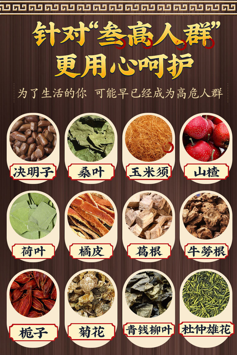 Ячмень, кожура мандарина, лист шелковицы, горькая пшеница, лист быка Laogen cyclocarya Paliurus, лист лотоса, корень кудзу, гардения, кукурузный шелк Sophora japonica, цветок Eucommia ulmoides мужской