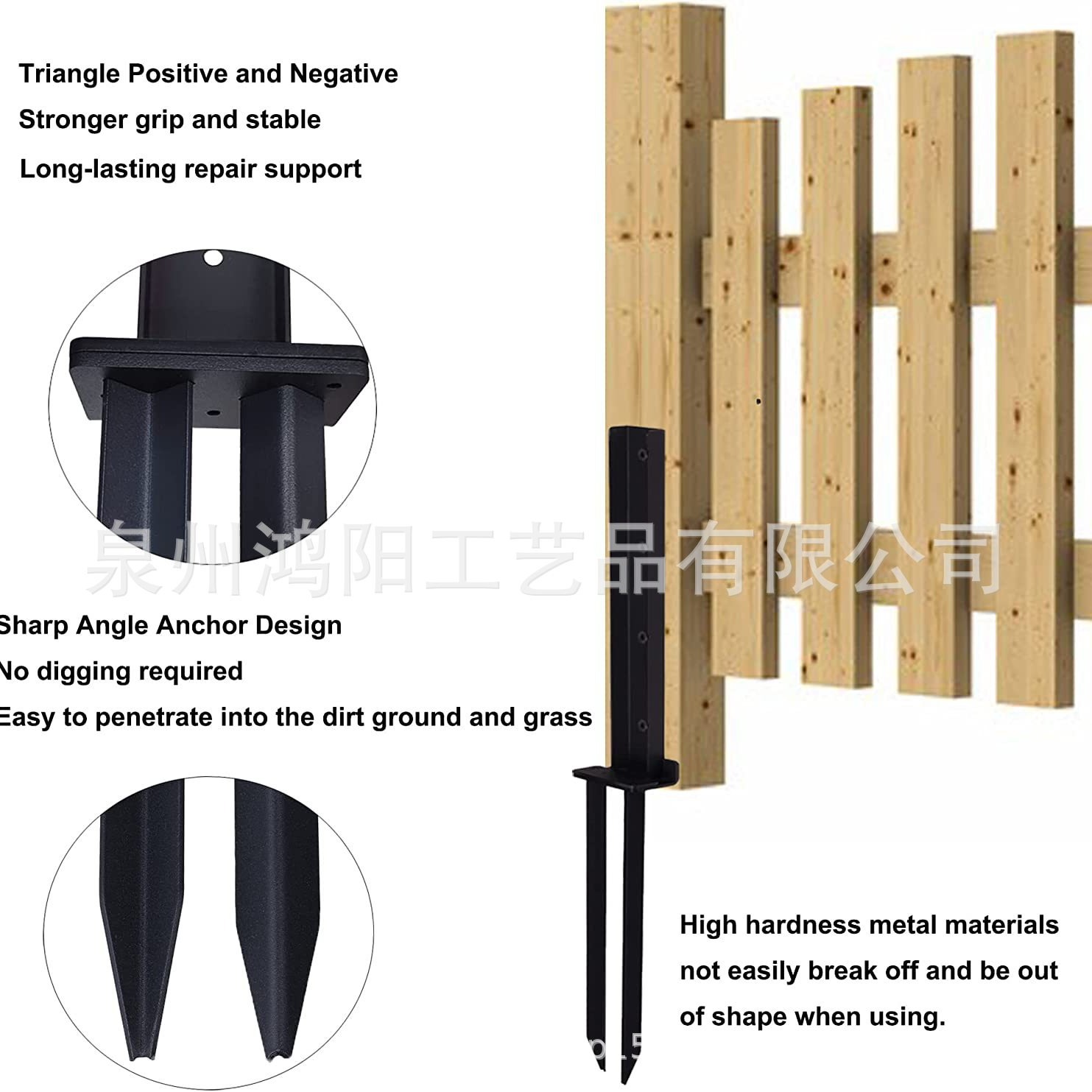 - 〖易于安装〗三角正负尖角锚设计更加稳定和附着力更大。易于穿入地面,无需挖掘,只需用锤子将其插入地面,并用螺丝将其固定在栅栏的木柱上。