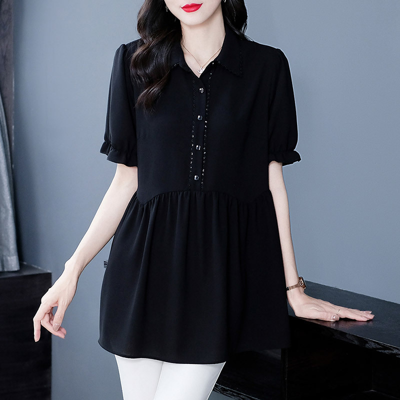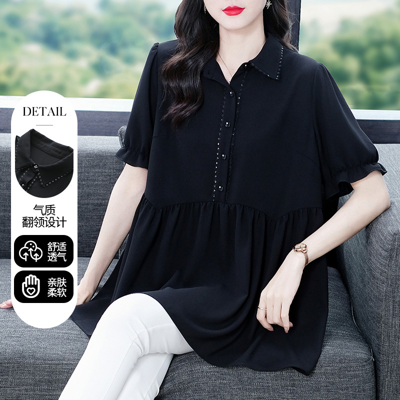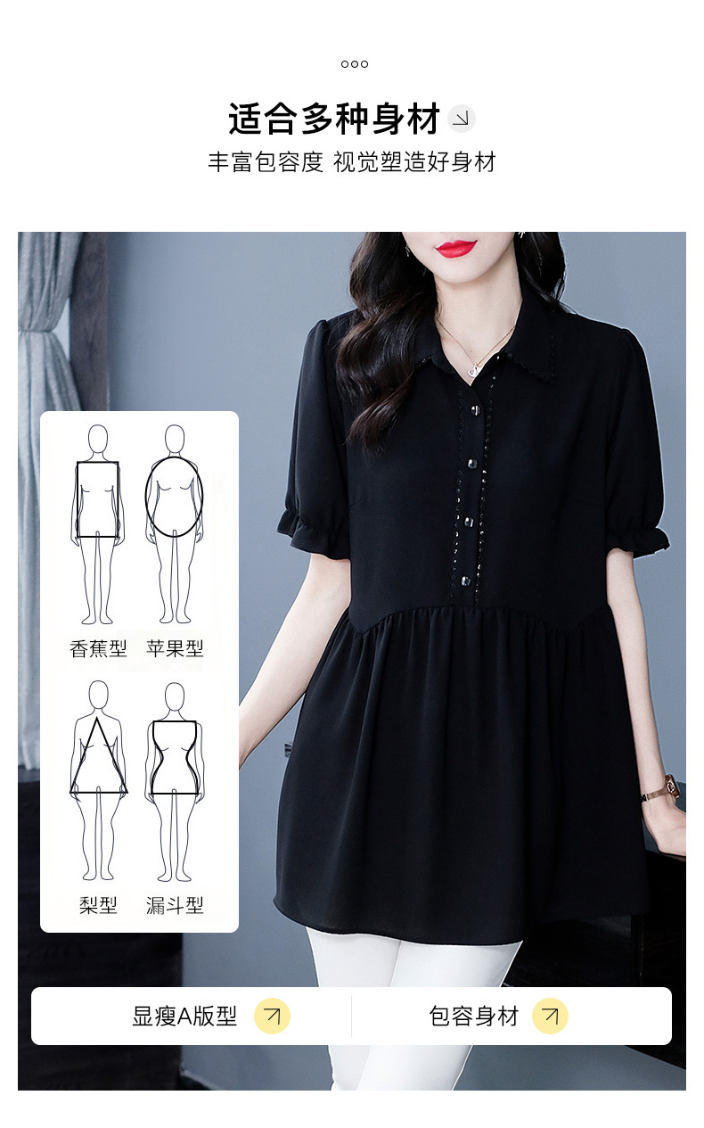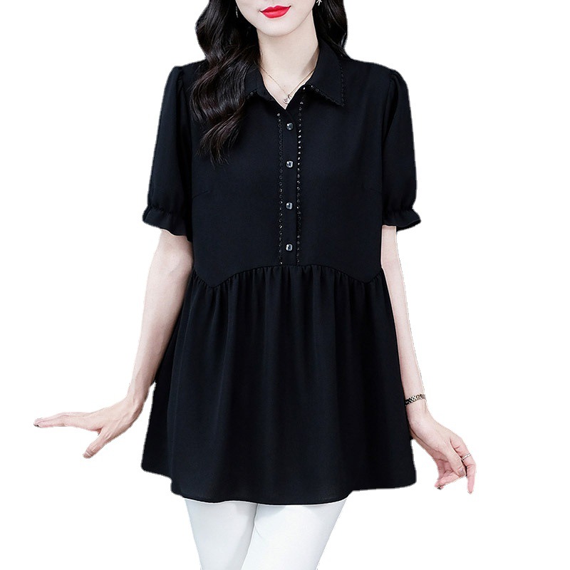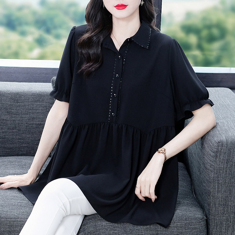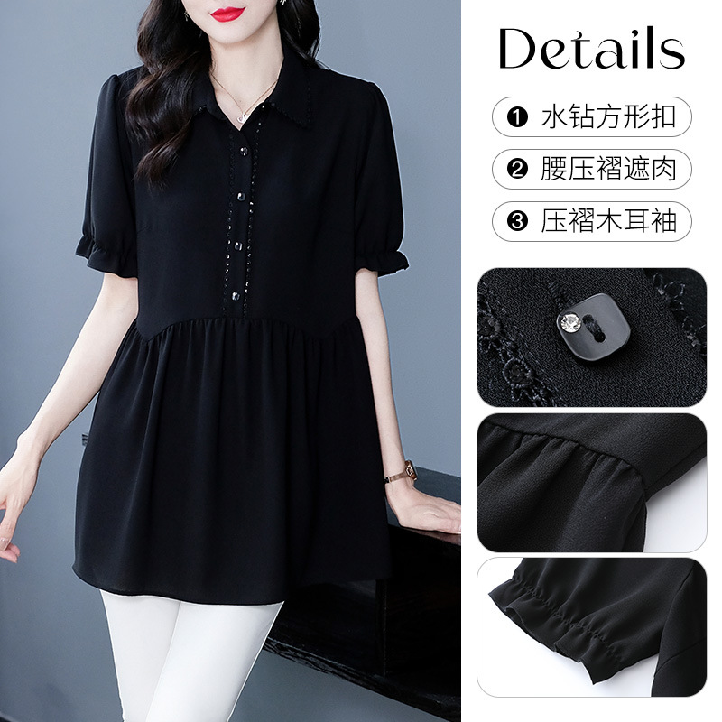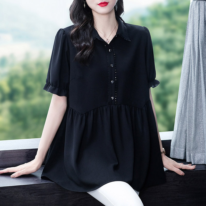 Толстый MM Лето отворотом кружева края темперамент коммутируя с коротким рукавом дисплей Тонкий шифоновый рубашка Топ в возрасте женщин