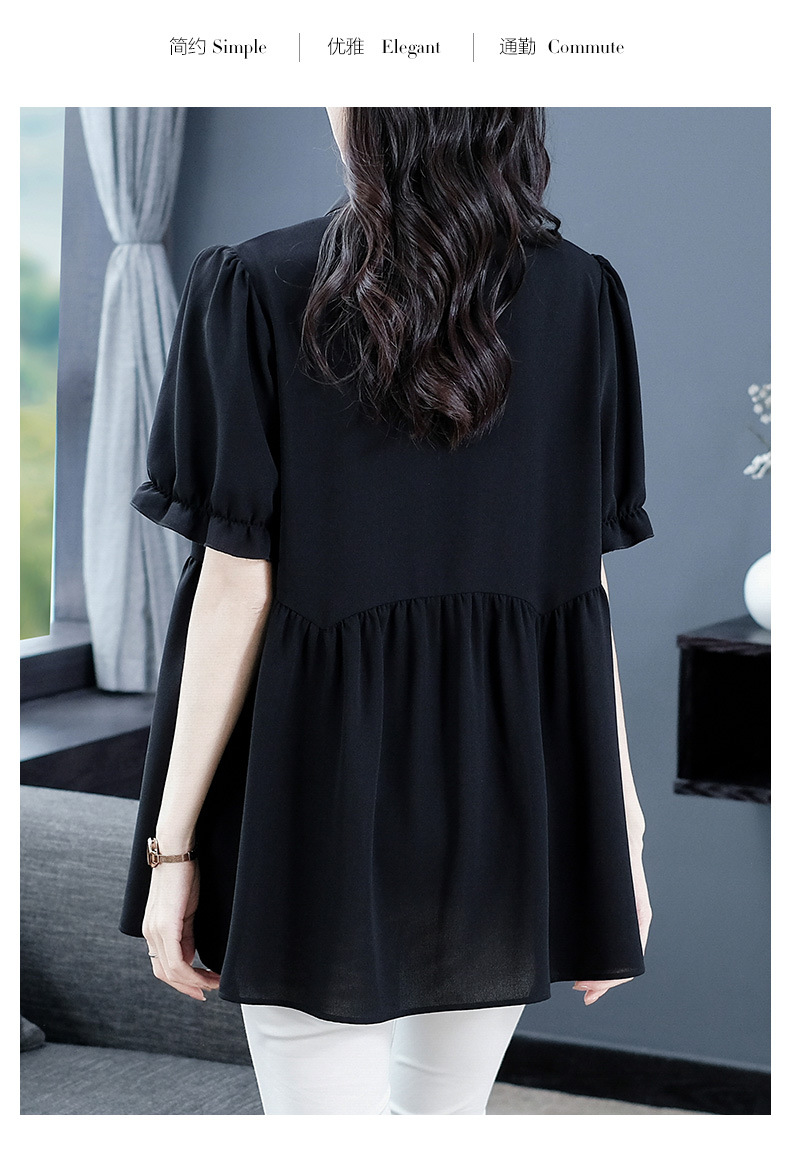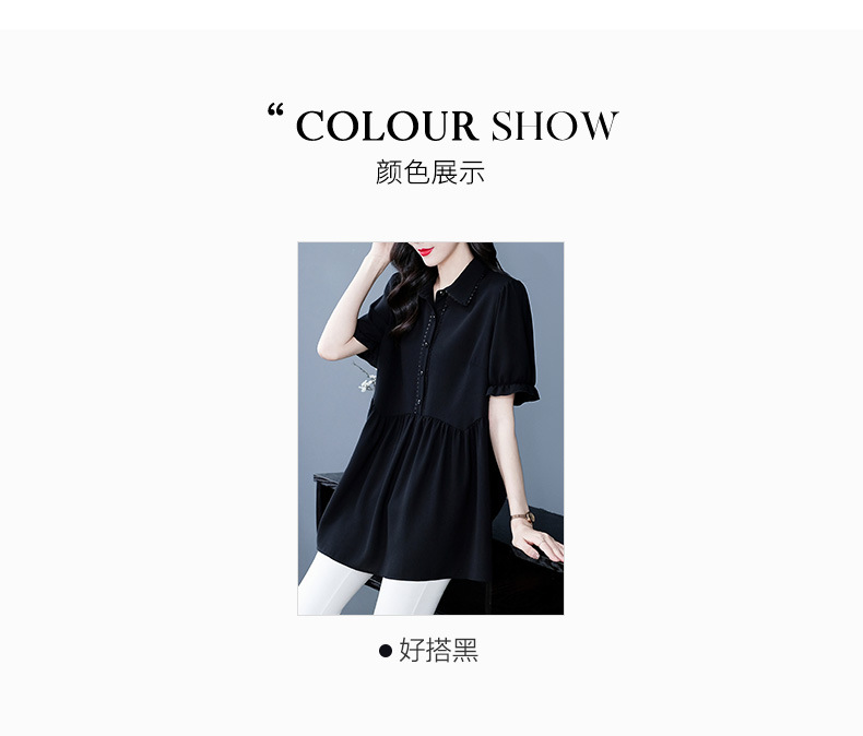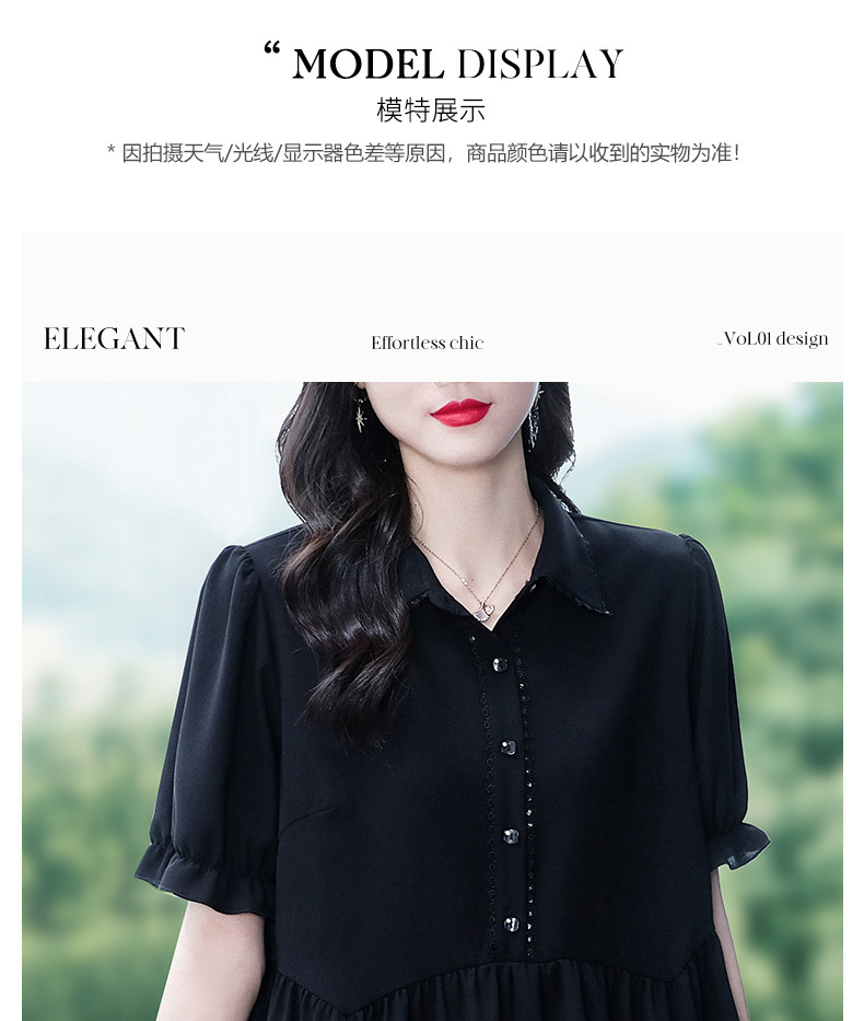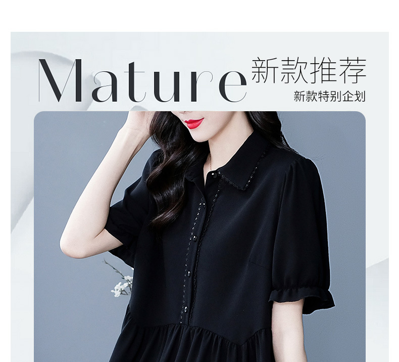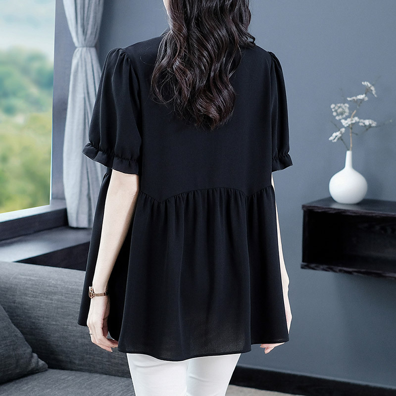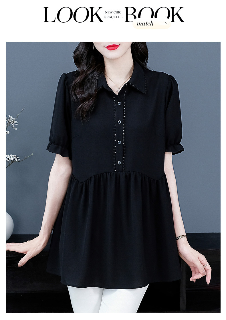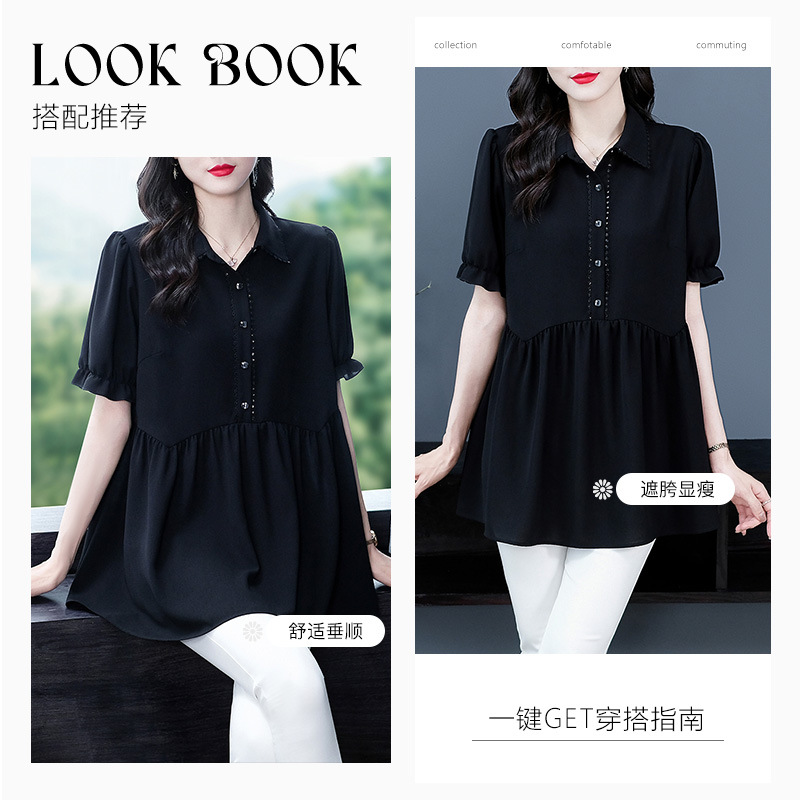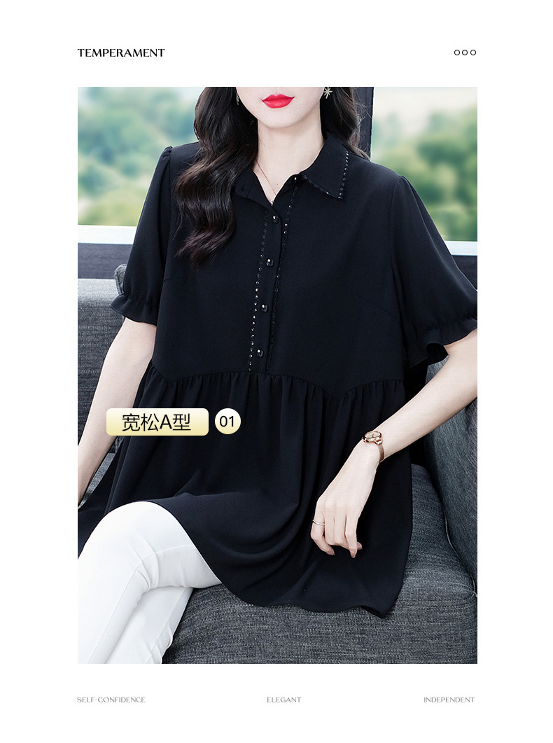 Толстый MM Лето отворотом кружева края темперамент коммутируя с коротким рукавом дисплей Тонкий шифоновый рубашка Топ в возрасте женщин