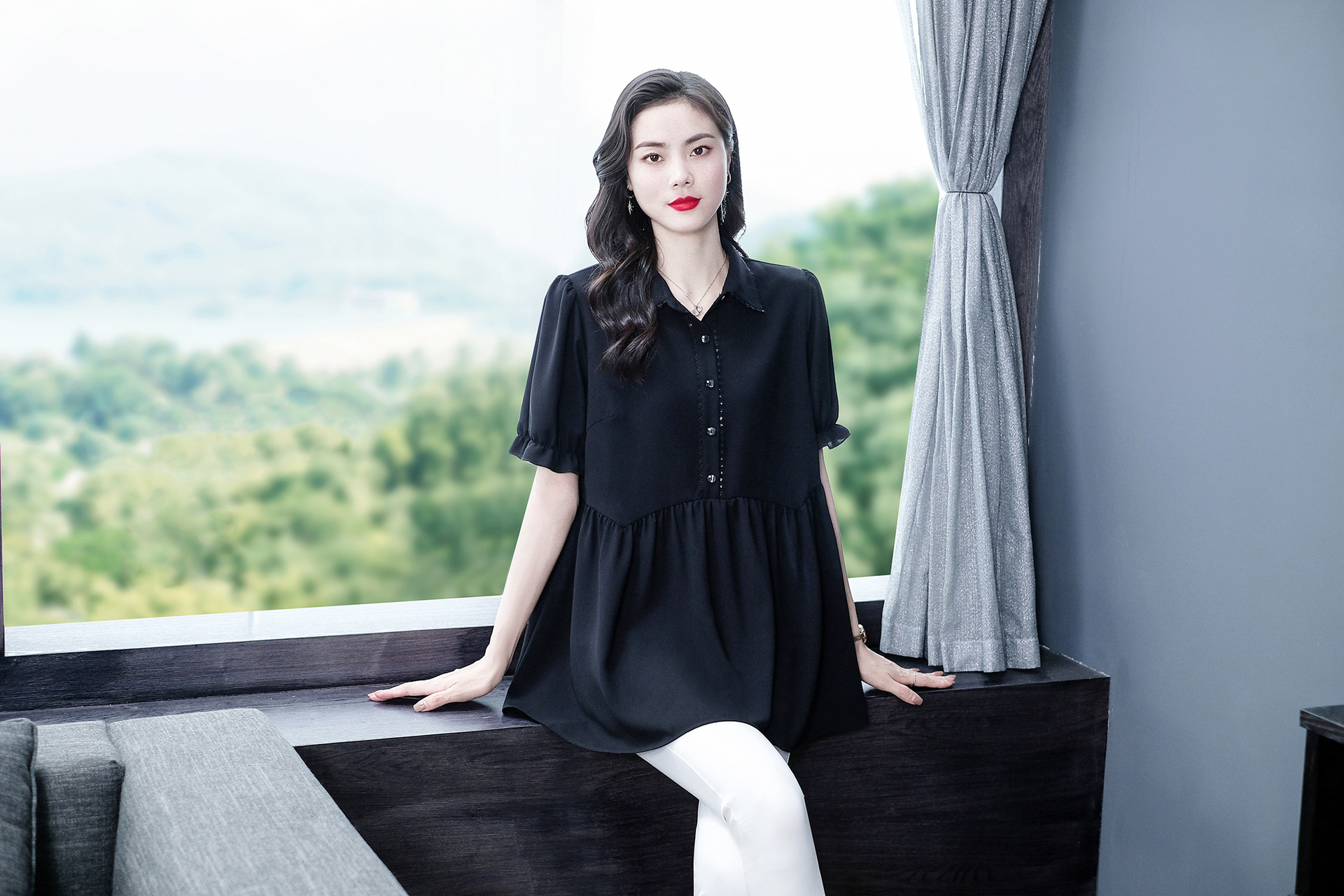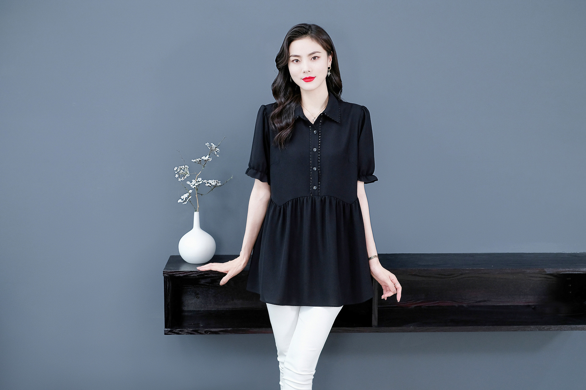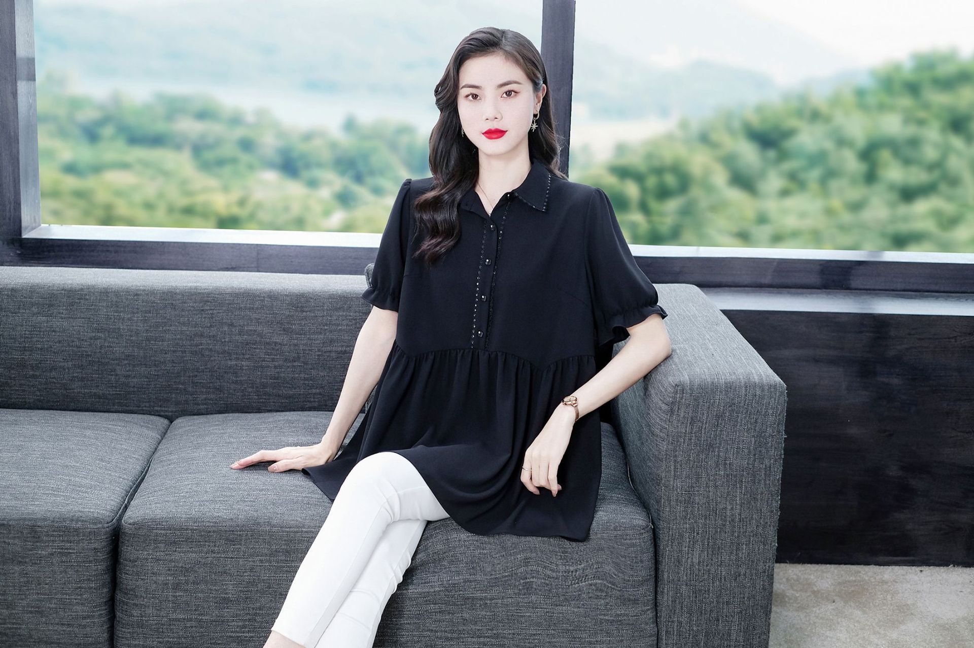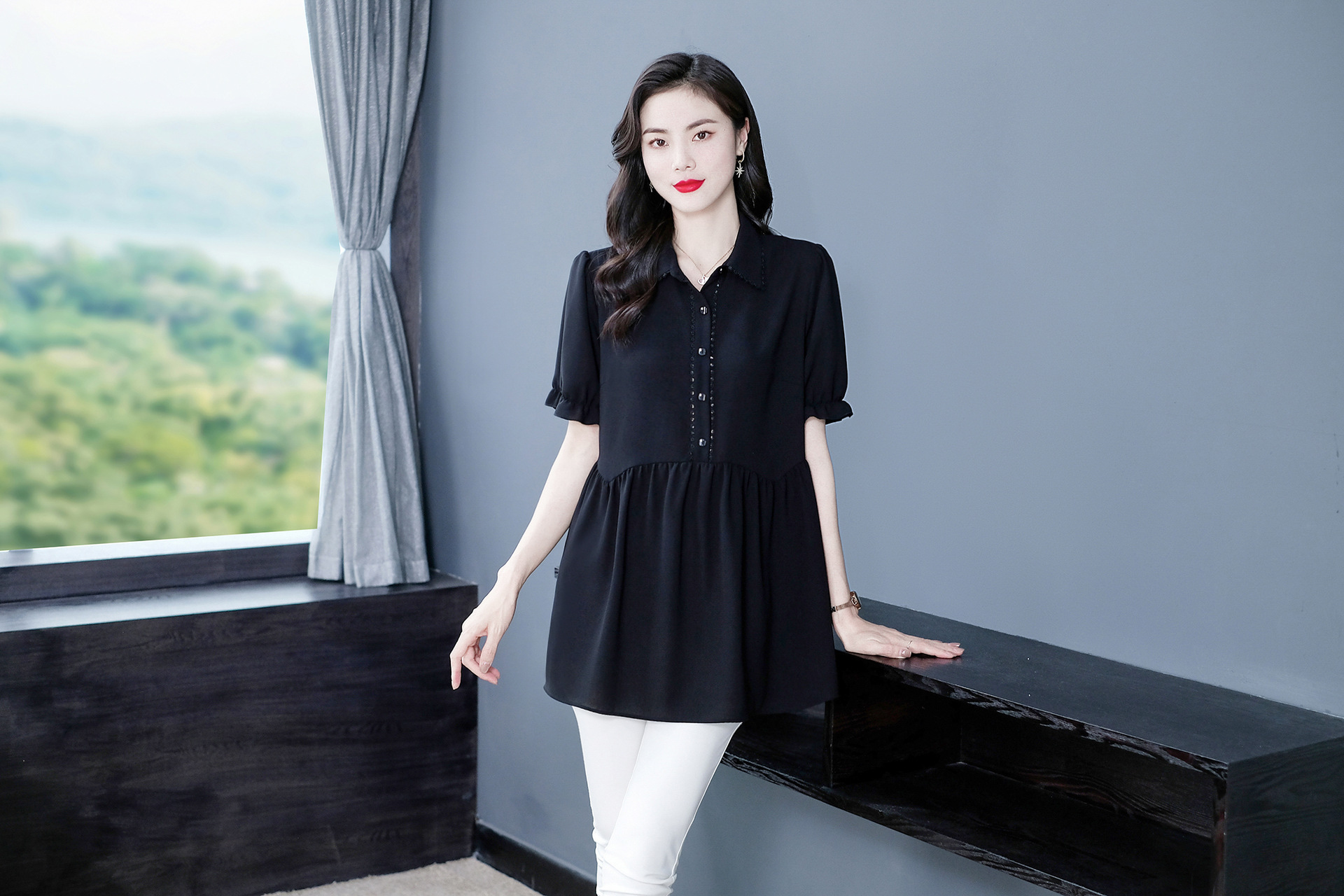 Толстый MM Лето отворотом кружева края темперамент коммутируя с коротким рукавом дисплей Тонкий шифоновый рубашка Топ в возрасте женщин