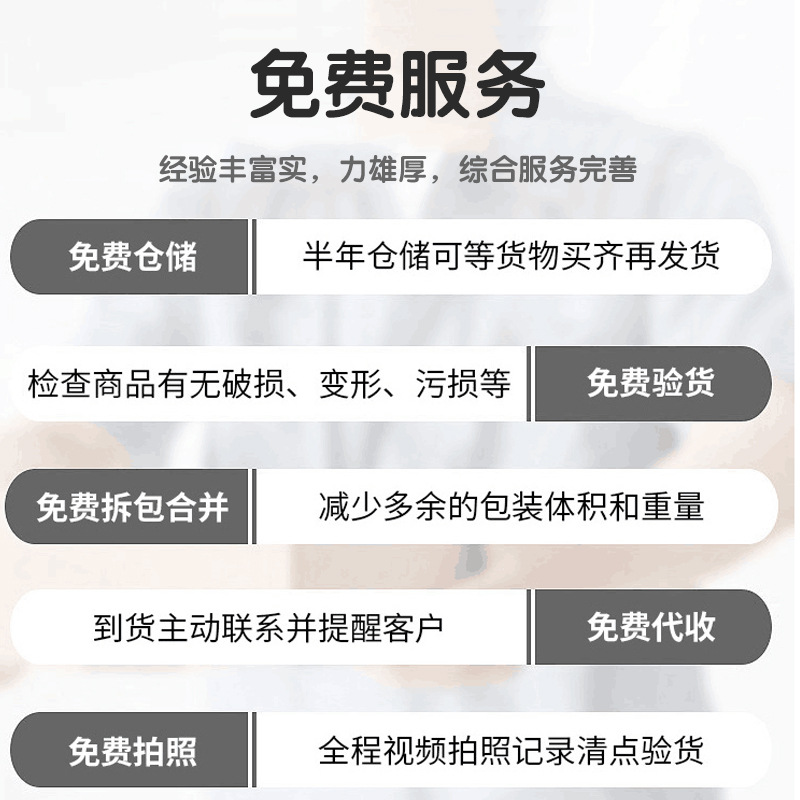 7.仓储:货物托运、托盘化、仓储、贴标、包装、量尺寸、称重,门到门空海运服务