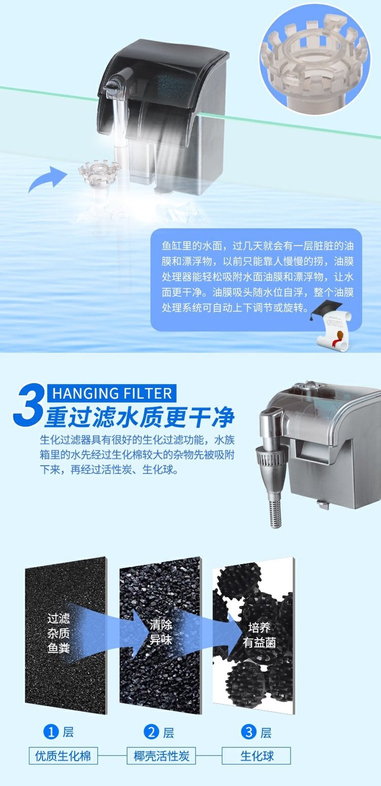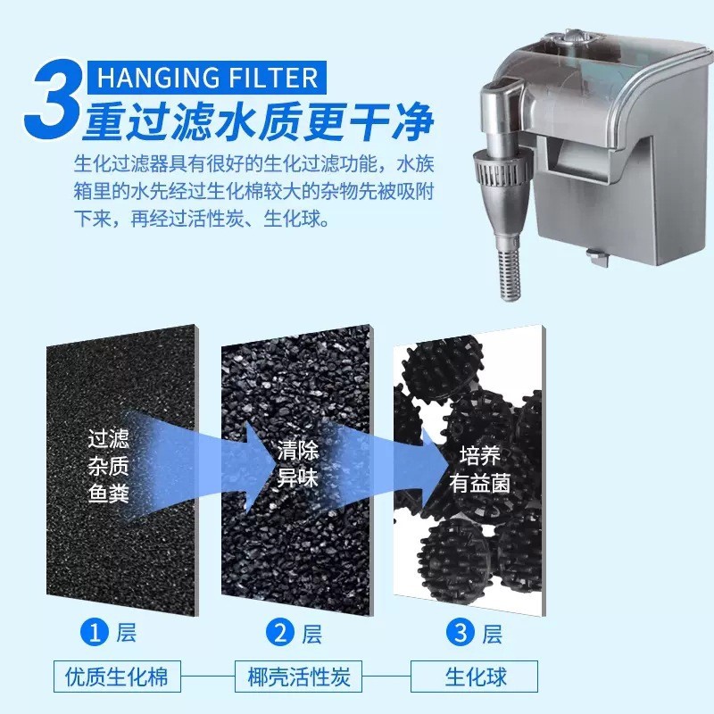 过滤盒内含6个生化球,三层过滤系统:一层过滤棉,二层活性炭,三层生化球。