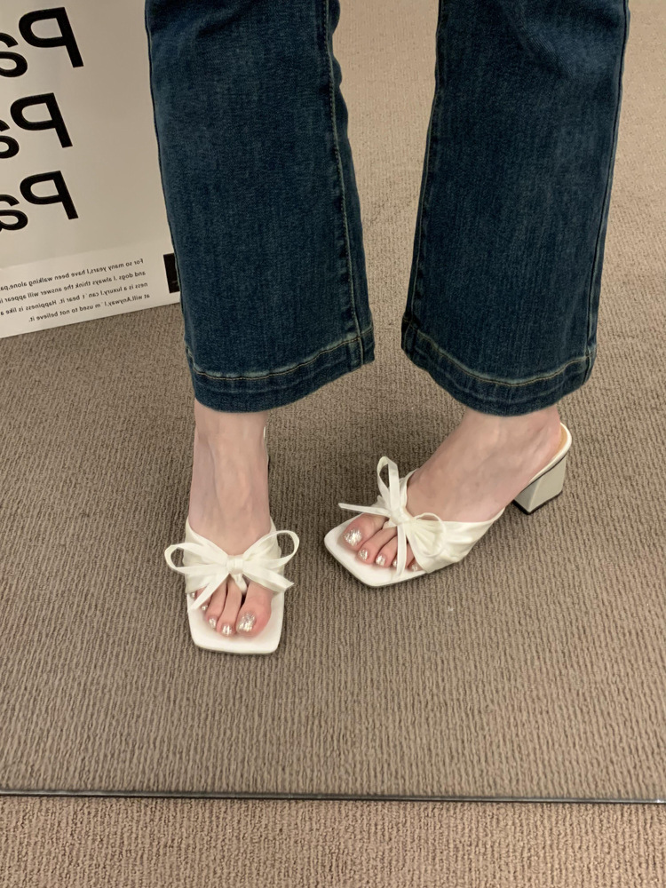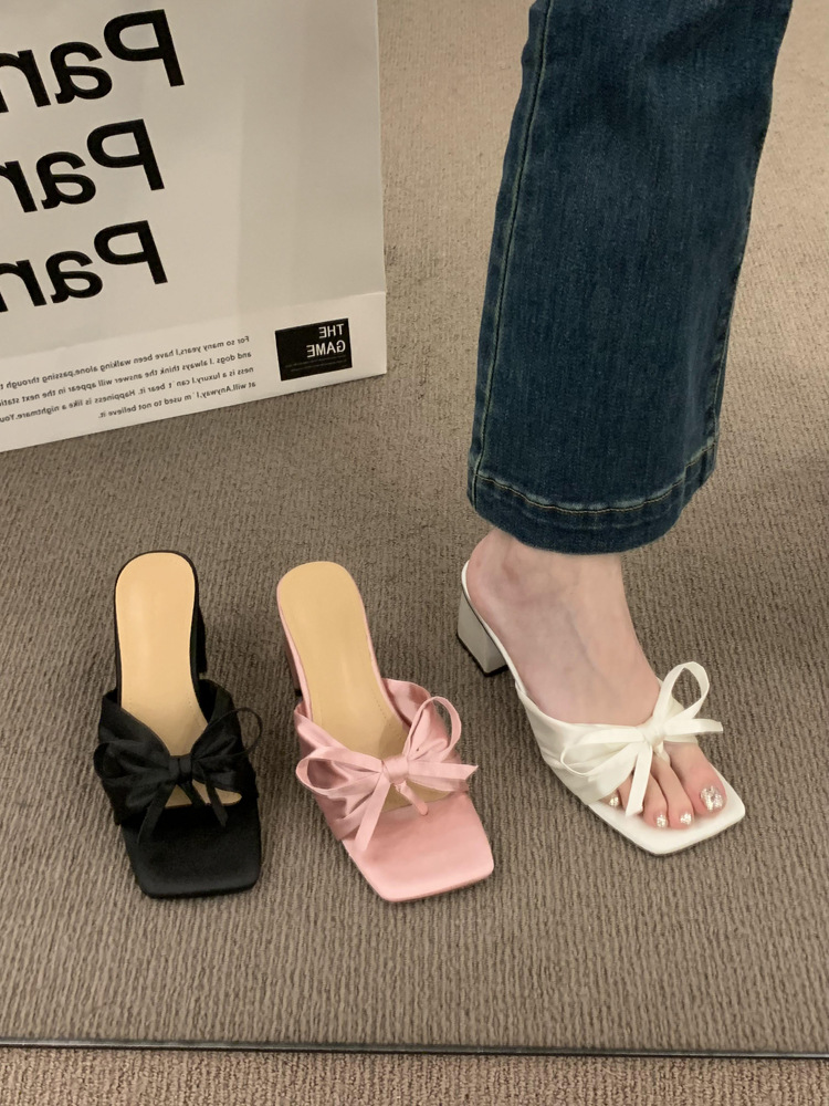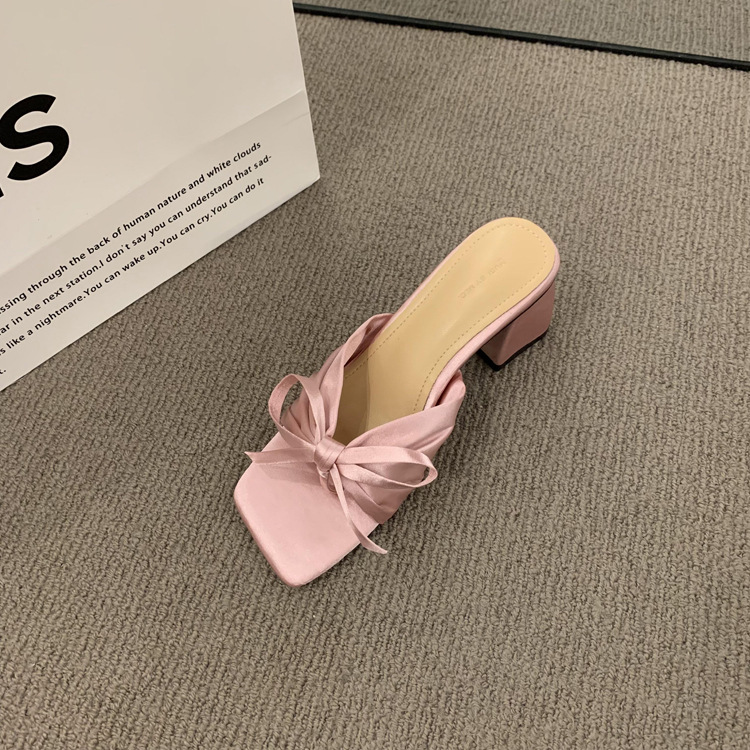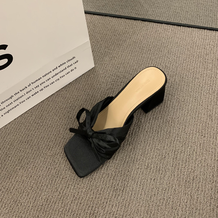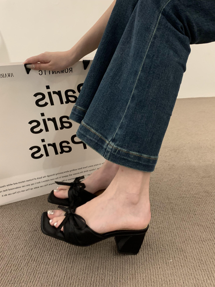 Французские высококачественные сандалии на массивном каблуке с атласным бантом для женщин, наряд 2023, новые летние туфли на высоком каблуке с открытым носком