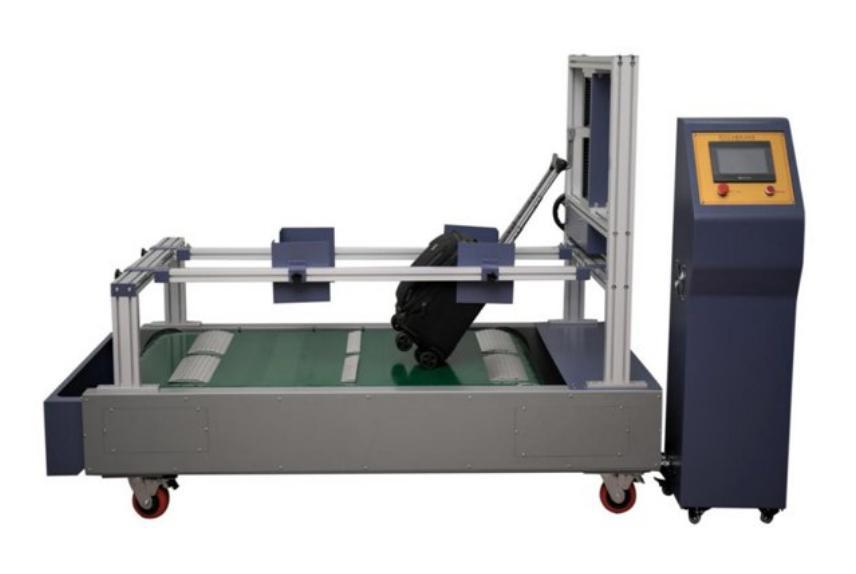 本试验机用于试验附有轮子的旅行箱、旅行包中加载一定的负荷,利用传送带式试验机测试颠簸板与试样走轮产生摩擦和撞击,检测箱包行走中,轮子、拉杆是否损坏。(测试两轮、四轮拉杆箱)