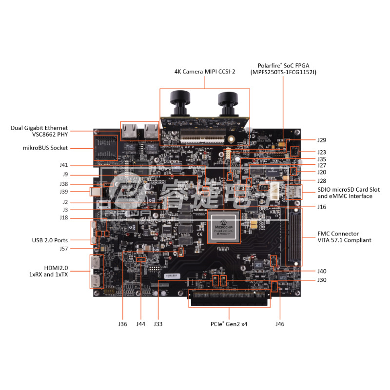 该套件支持双4K MIPI CSI-2摄像头、基于FMC的向CoaXPress 2.0扩展的HDMI 2.0、6/12G SDI、1/2.5/5/10G USXGMII以及USB 3.1 Gen1和Gen2协议。它还包括USB 2.0、SD卡、eMMC、PCIe Gen2x4端点或根端口,以及MikroBus连接器,为Microchip的Trust&Go云连接平台提供便利。