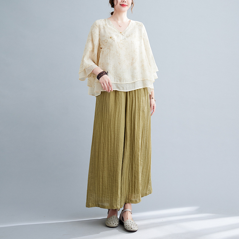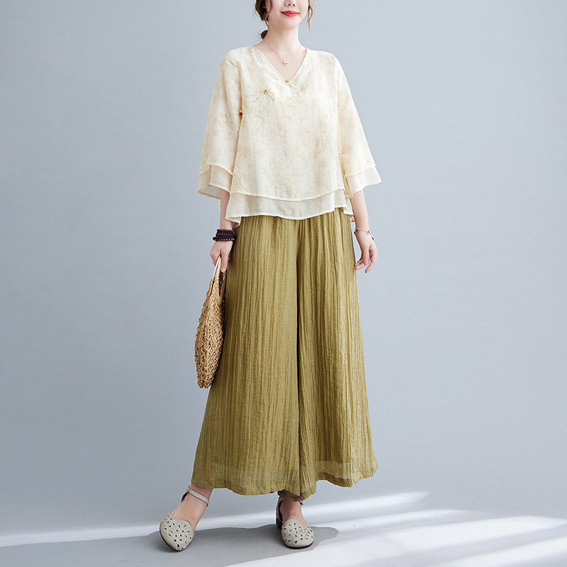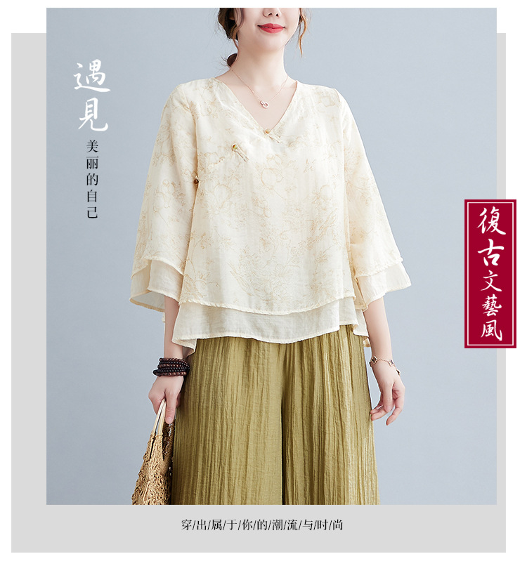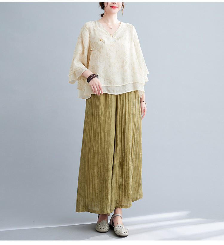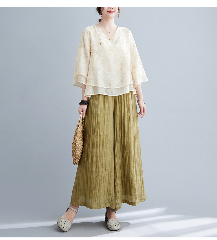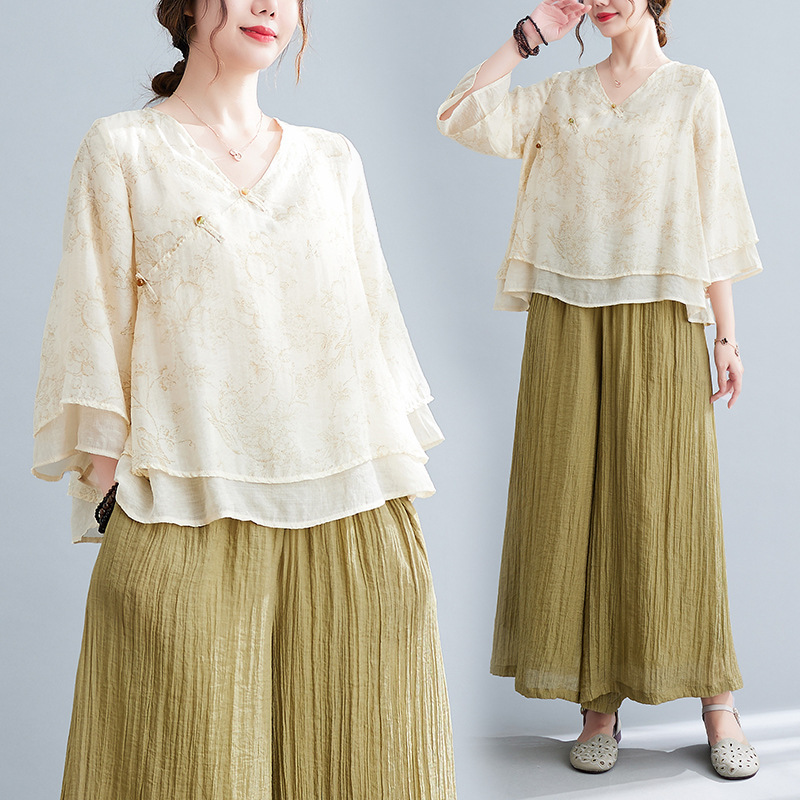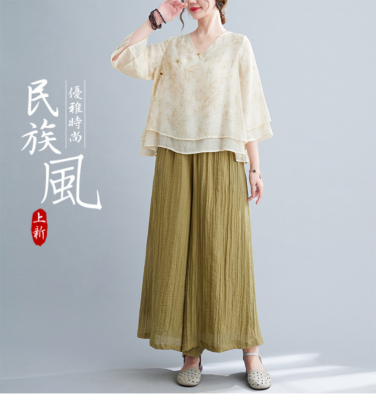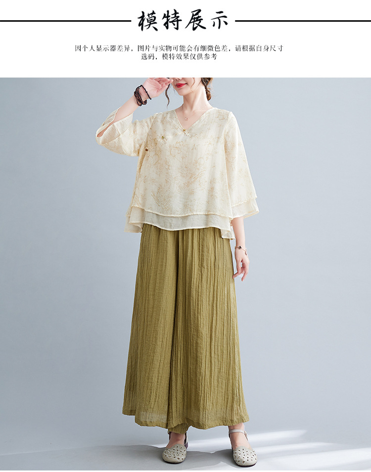9012 Новый летний Ретро Художественный женщин пригородных V-образным вырезом свободные с несколькими кнопками напечатаны укороченный рукав топ + брюки