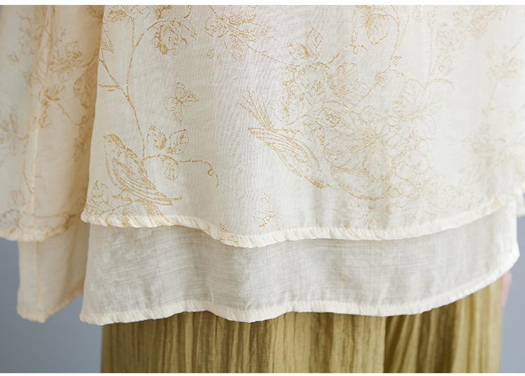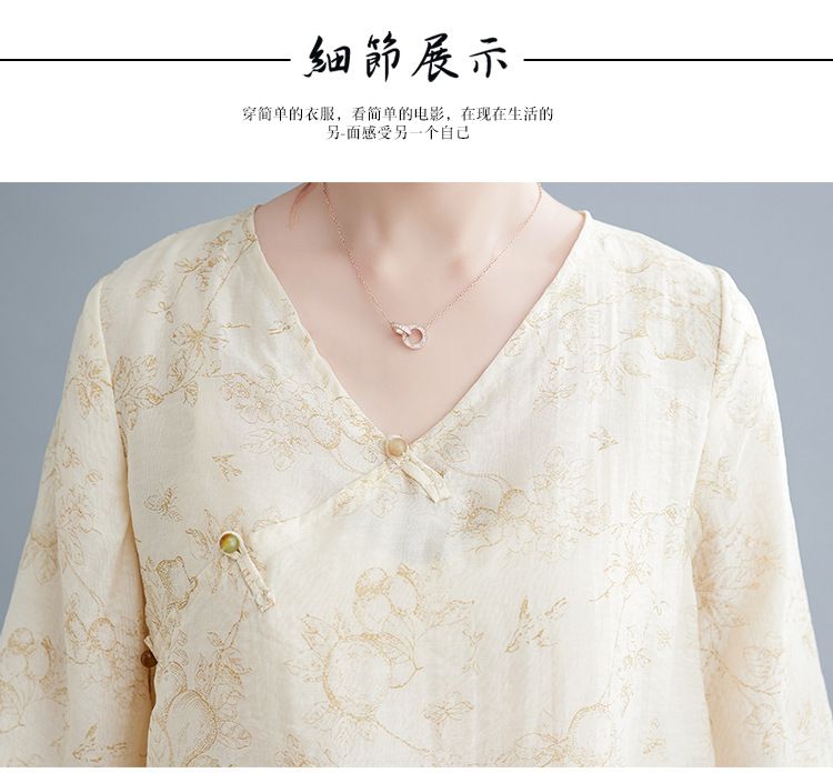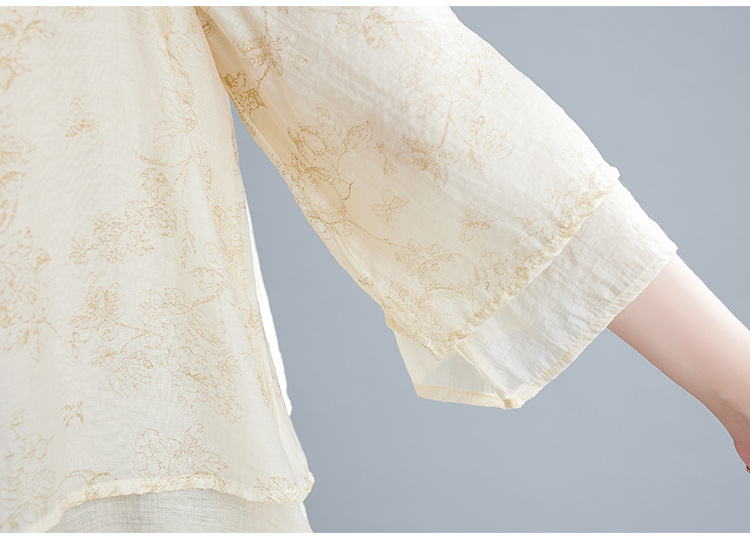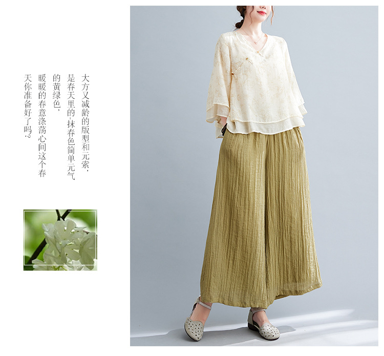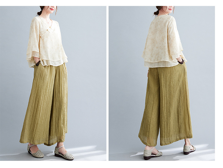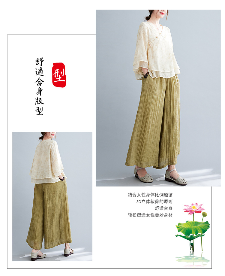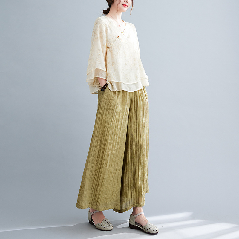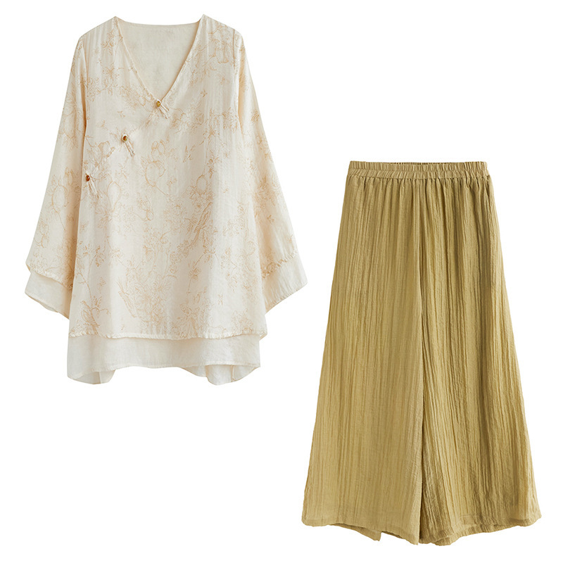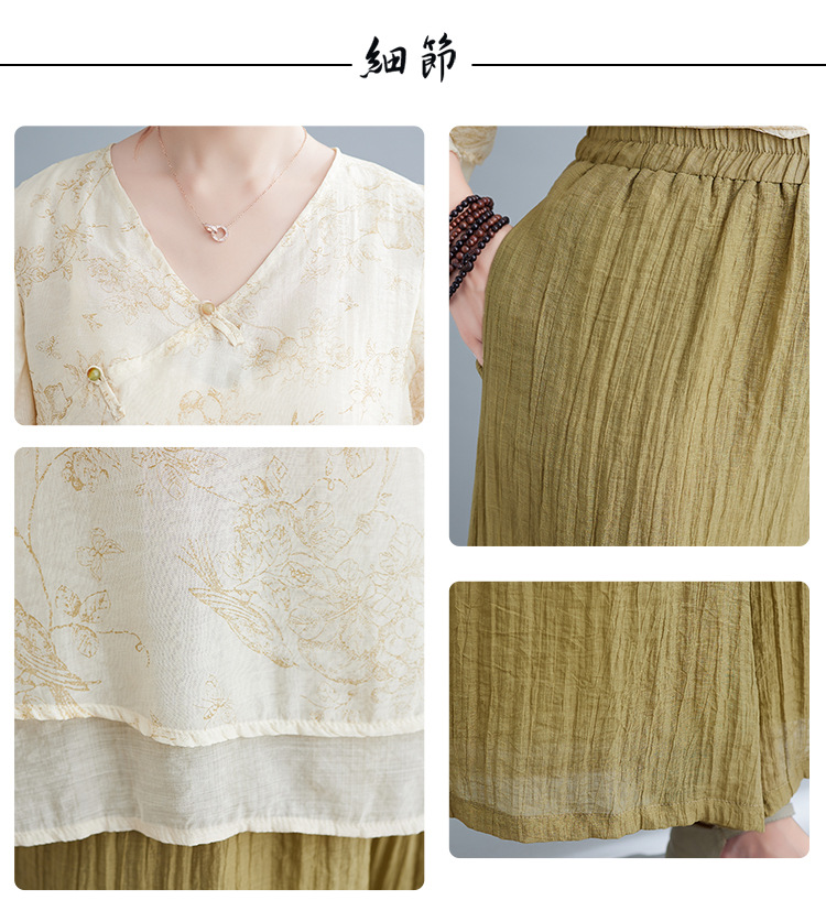 9012 Новый летний Ретро Художественный женщин пригородных V-образным вырезом свободные с несколькими кнопками напечатаны укороченный рукав топ + брюки