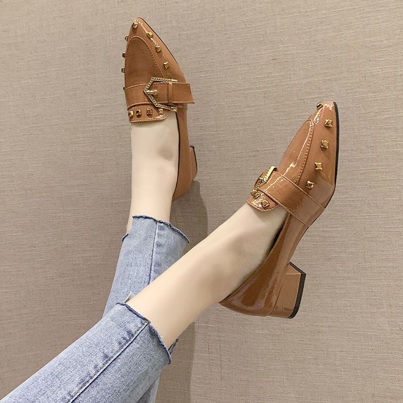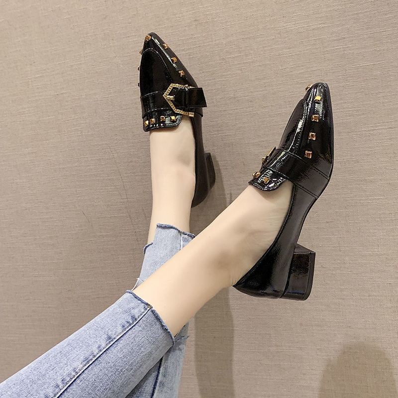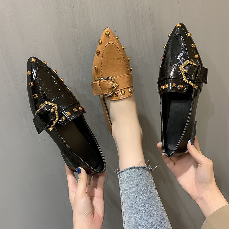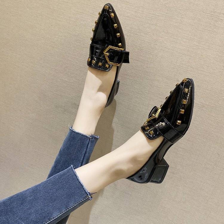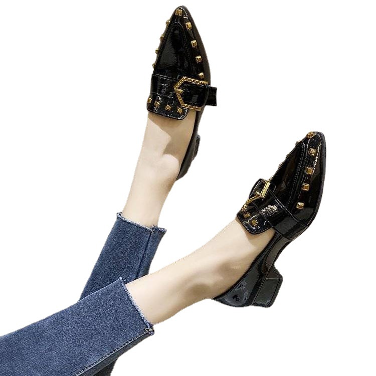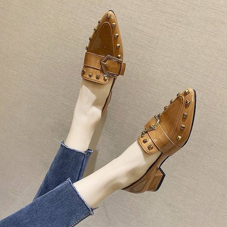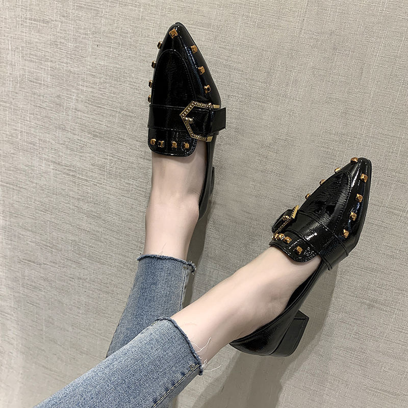 Женские туфли на массивном каблуке с острым носком, Новое поступление, универсальные лоферы на плоской подошве с заклепками в Корейском стиле, весна 2023, женские туфли на одной ноге