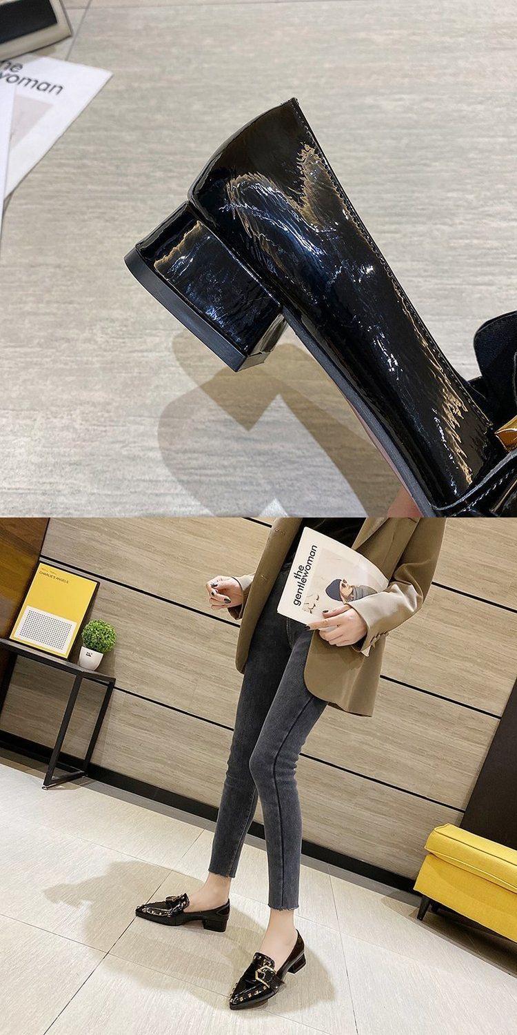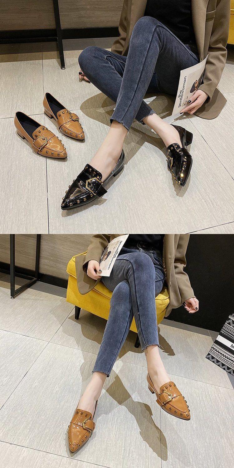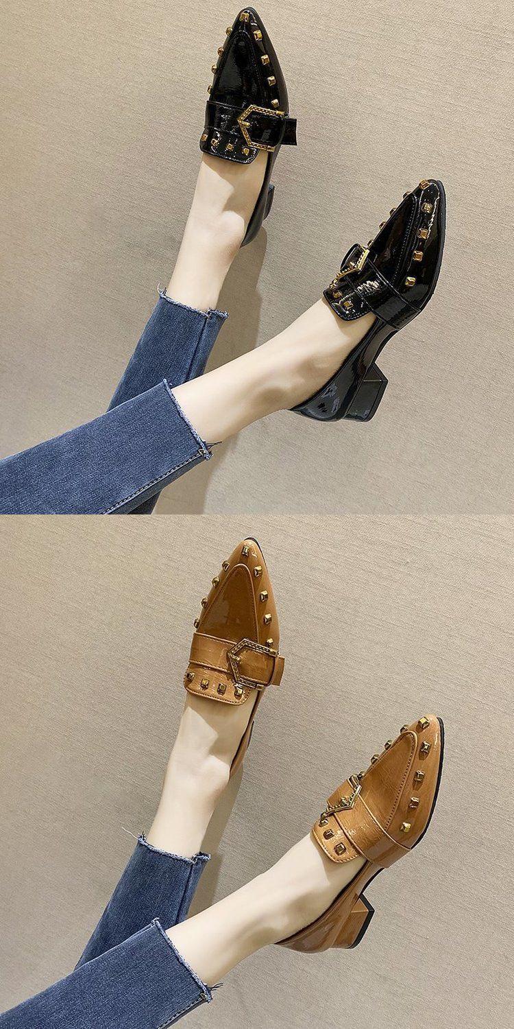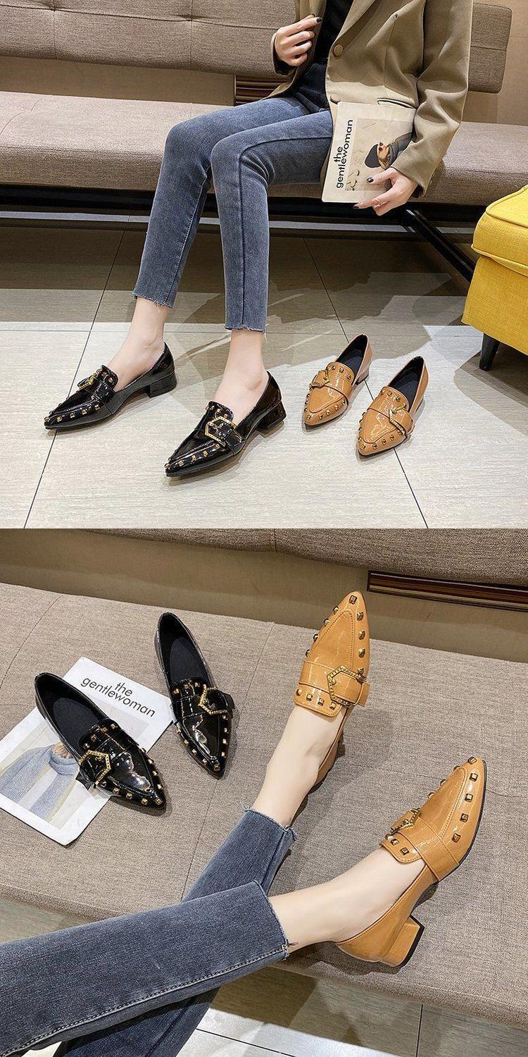 Женские туфли на массивном каблуке с острым носком, Новое поступление, универсальные лоферы на плоской подошве с заклепками в Корейском стиле, весна 2023, женские туфли на одной ноге