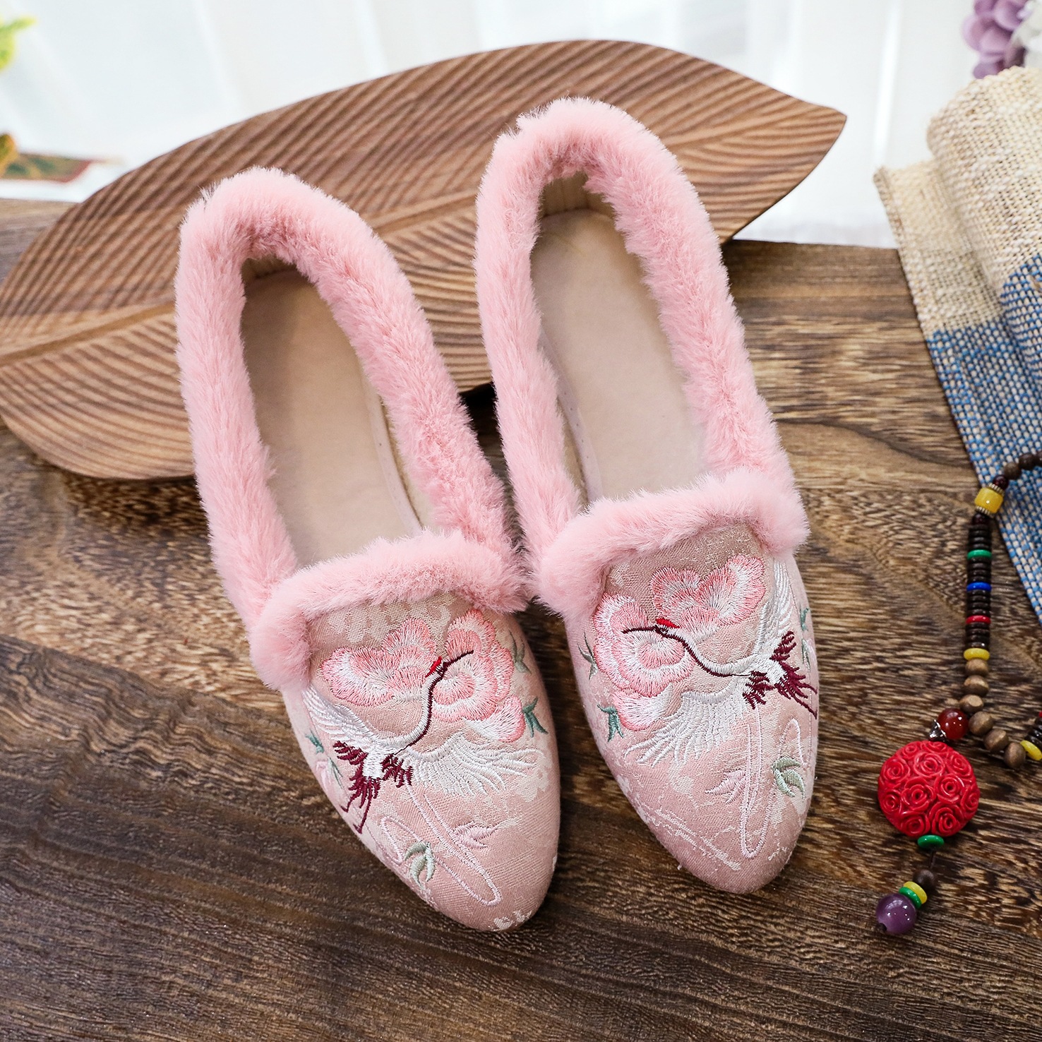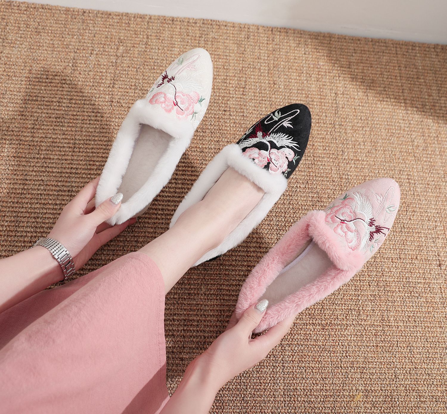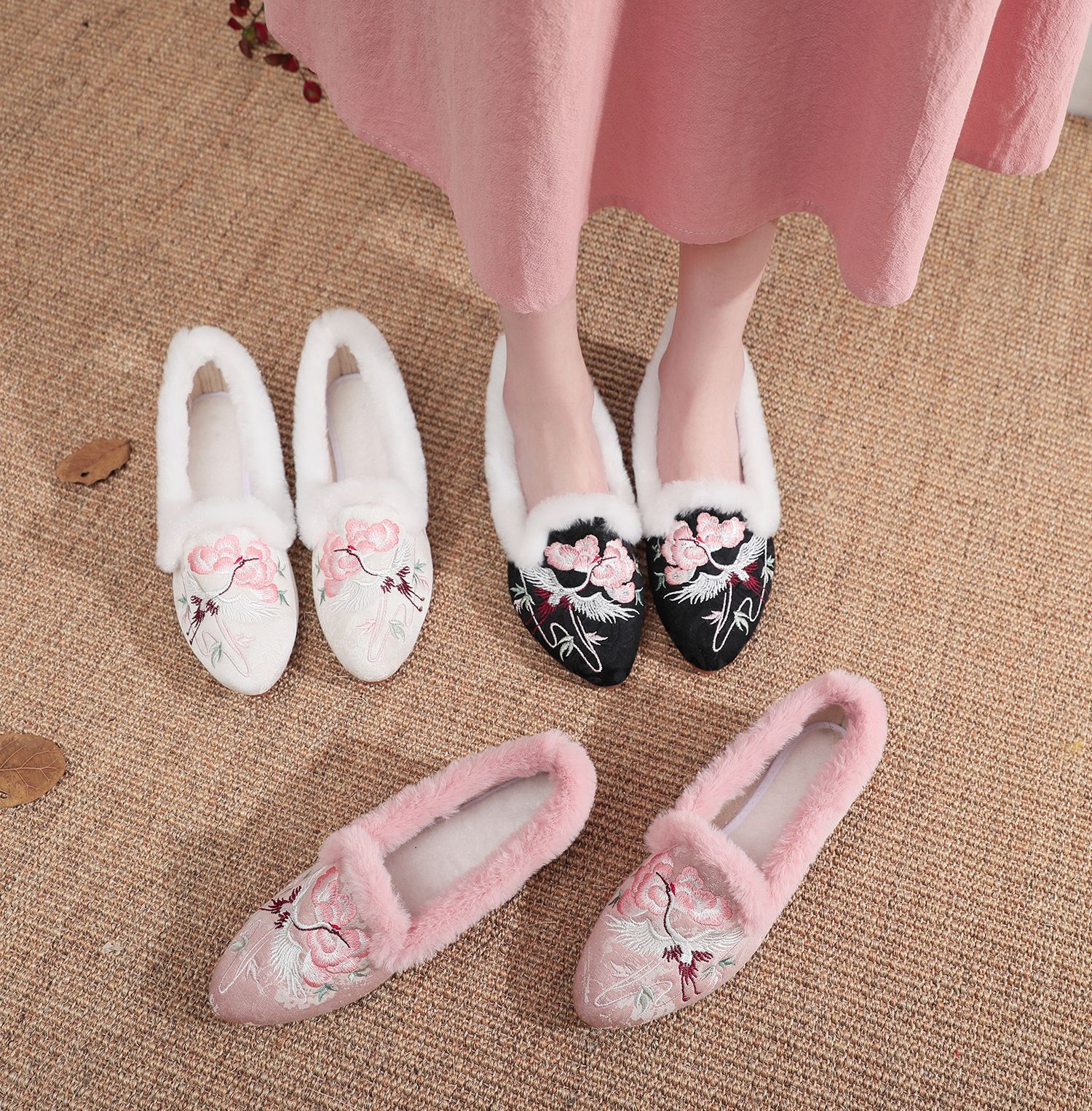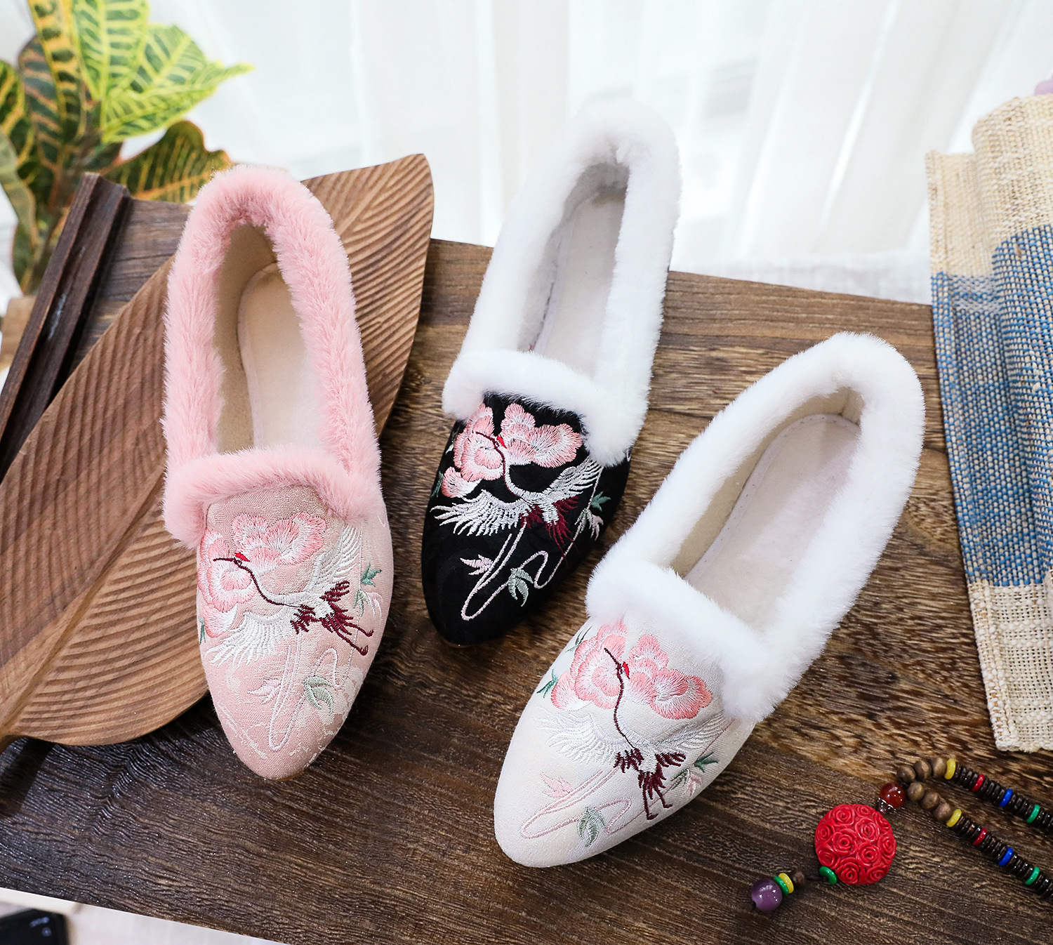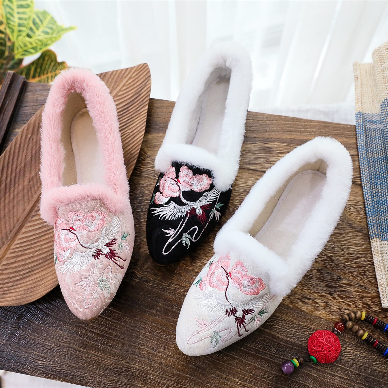 [Crane] новинки 2021 года с пушистым кантом, модная Тканевая обувь с остроконечной вышивкой, осенне-зимняя одношаговая Хлопковая женская обувь