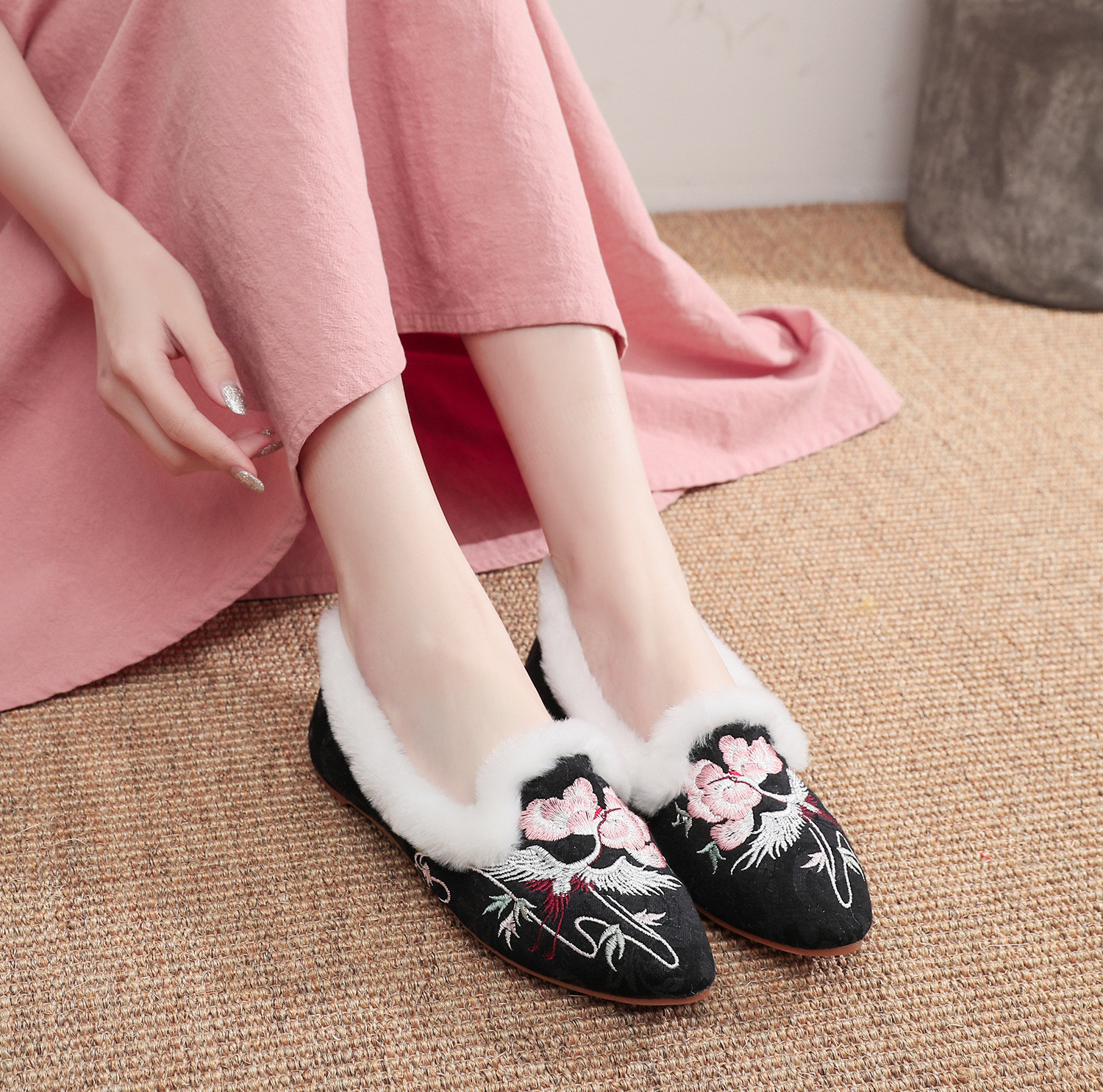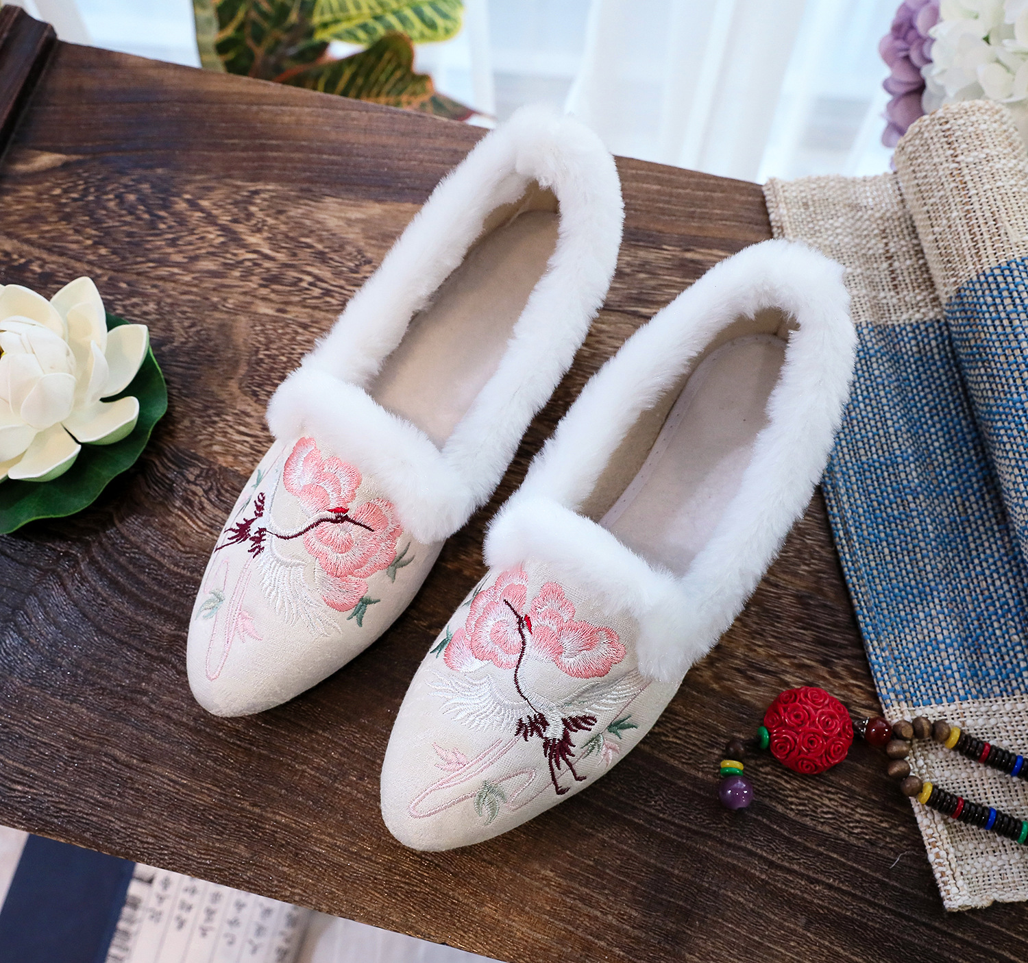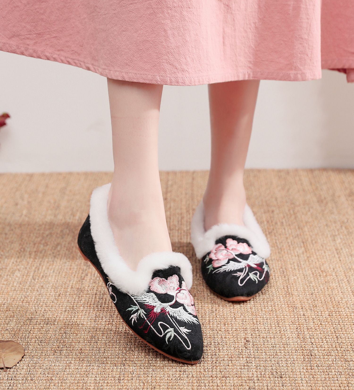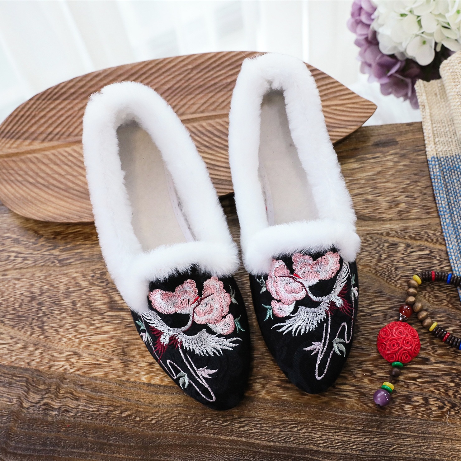 [Crane] новинки 2021 года с пушистым кантом, модная Тканевая обувь с остроконечной вышивкой, осенне-зимняя одношаговая Хлопковая женская обувь